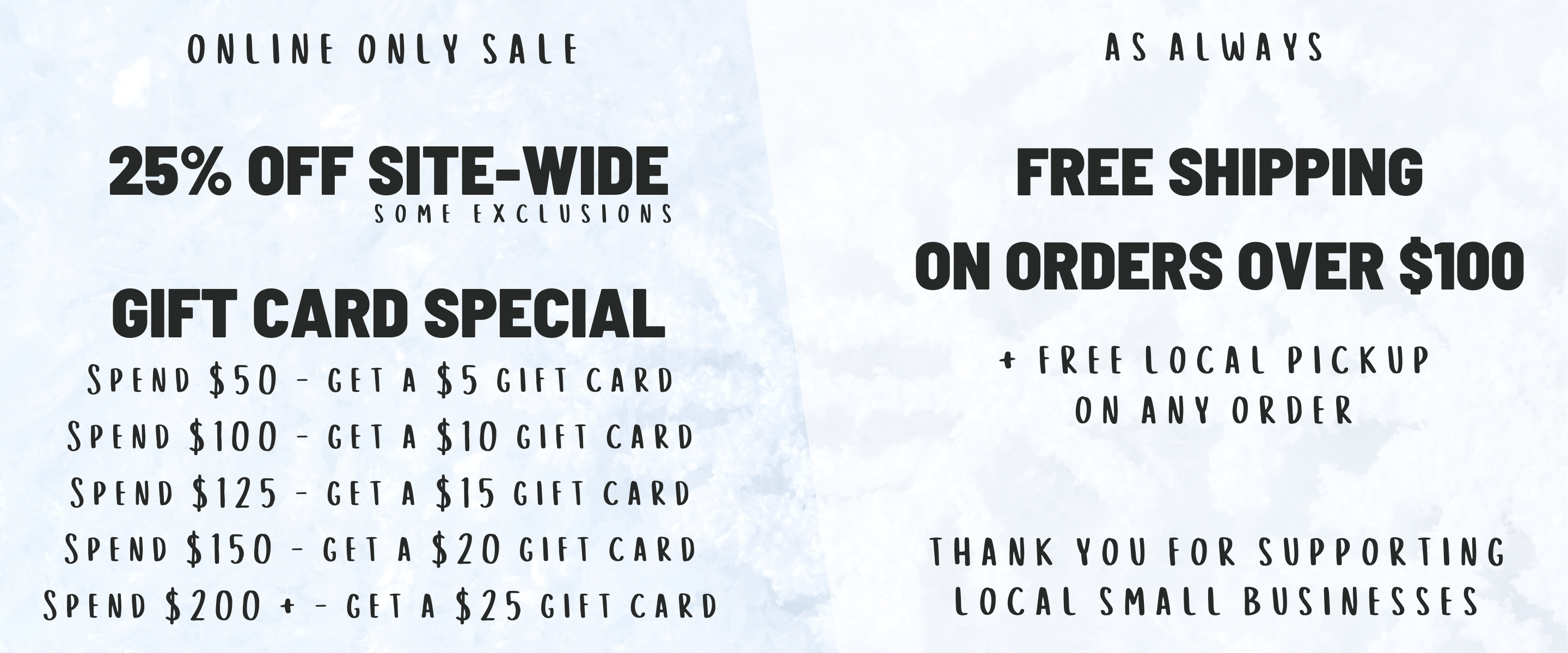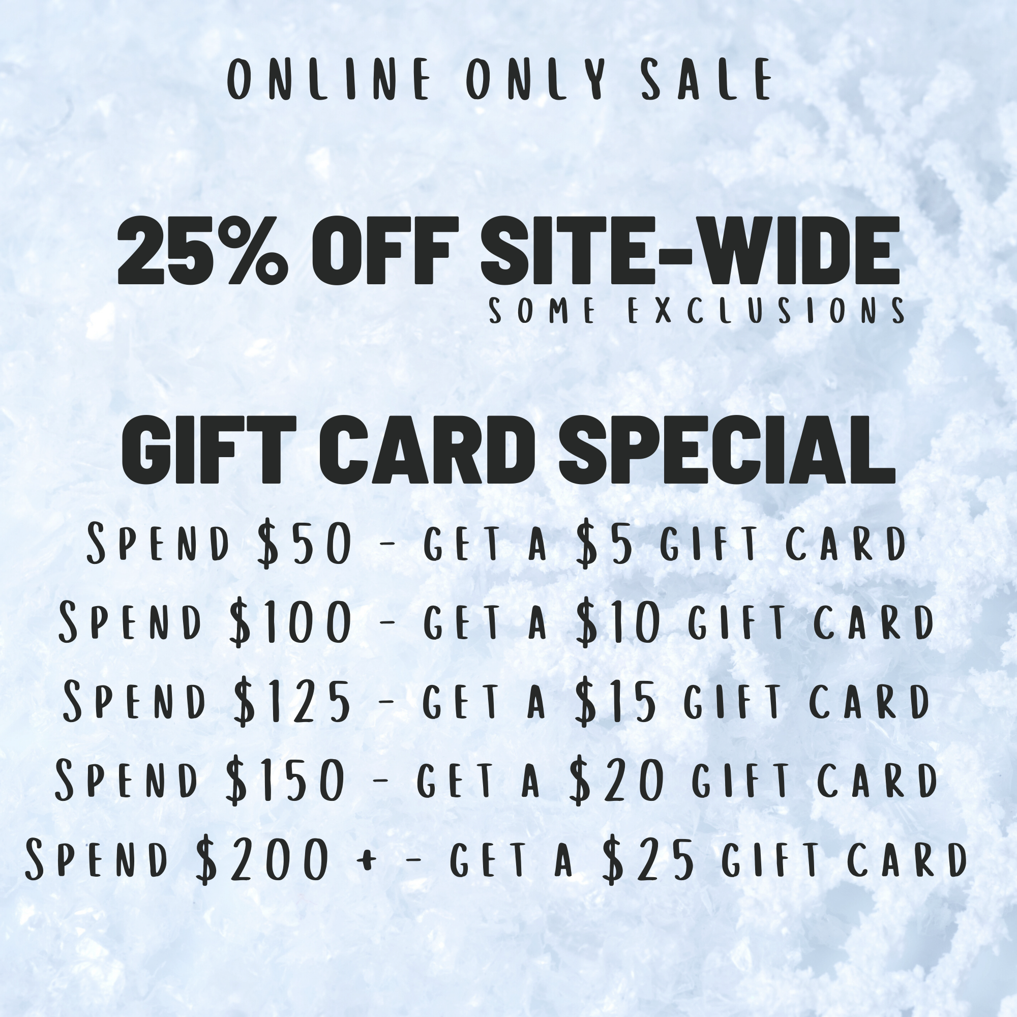 Oh snow .. ONLINE SPECIALS ADDED: Today Only - 25% off online + free gift card with purchase! (details below)