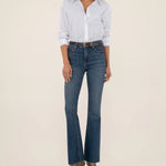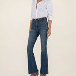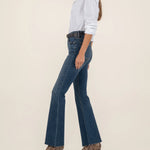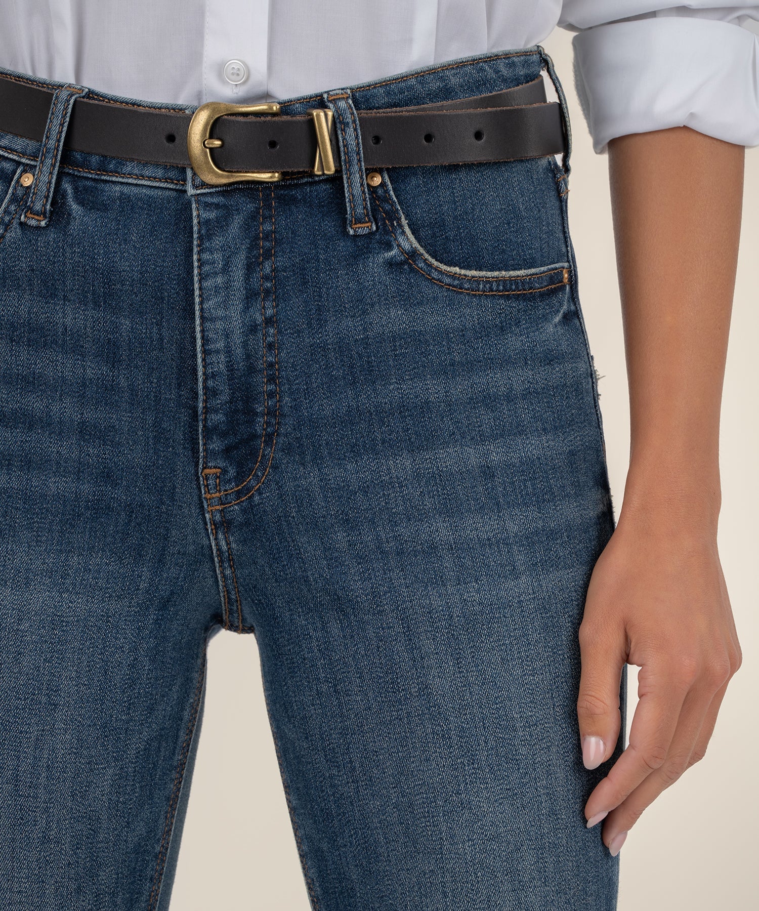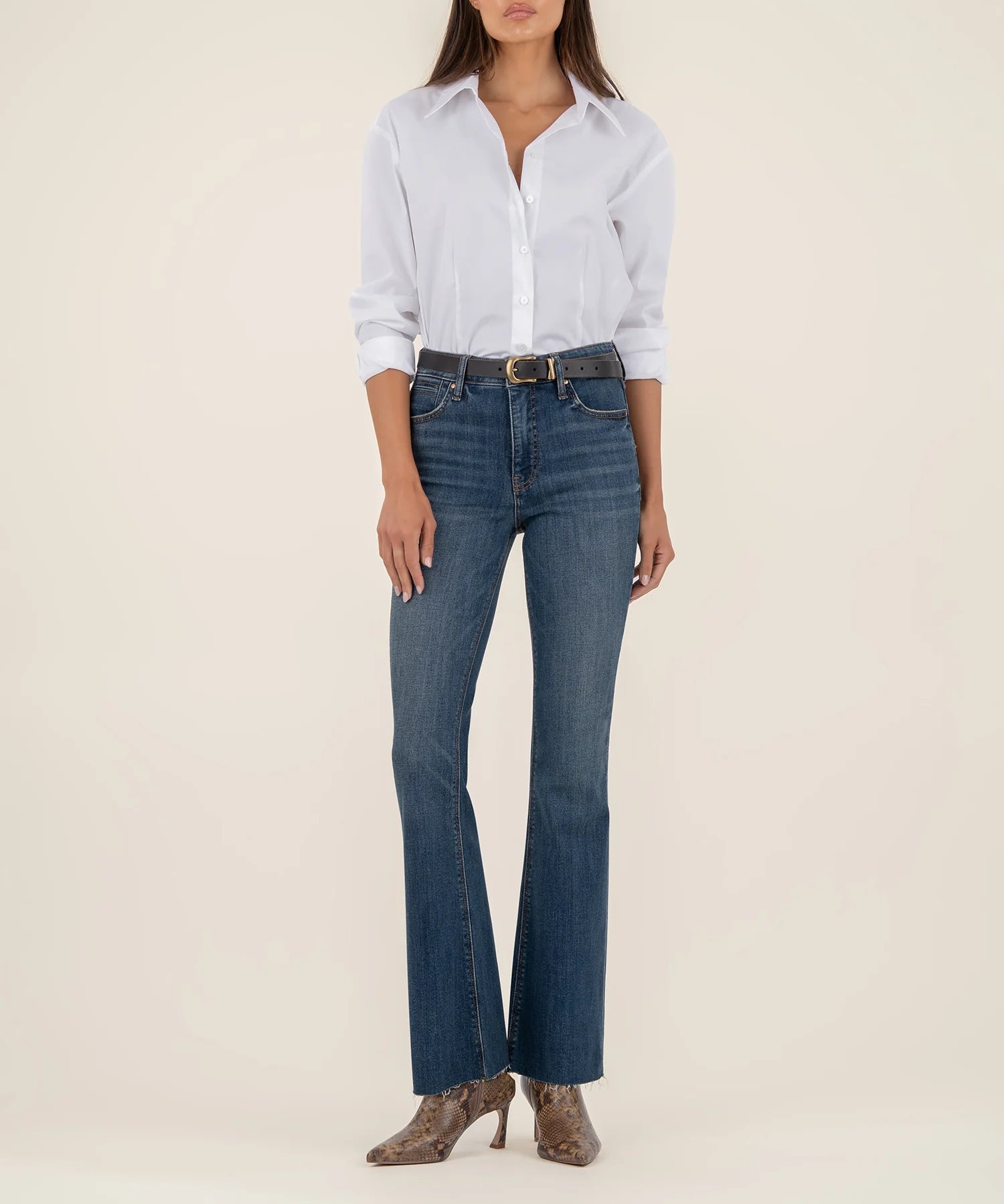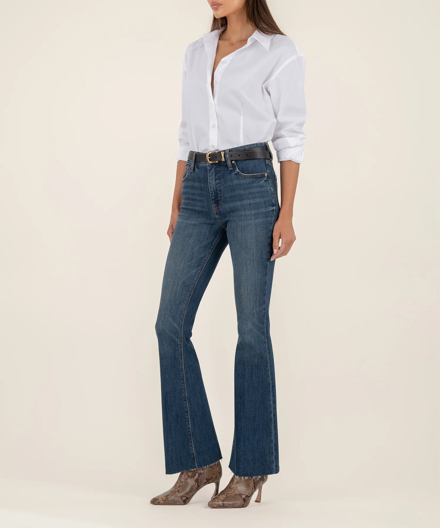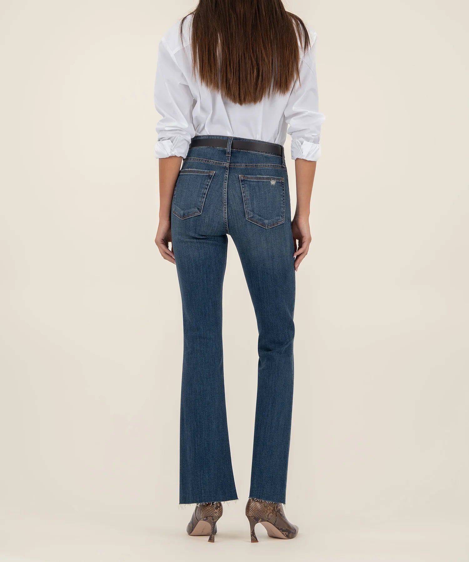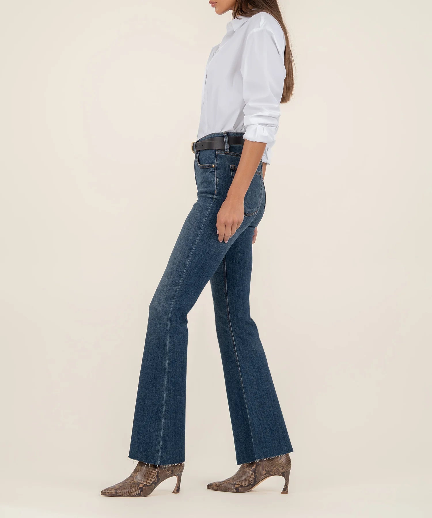 Slightly flared legs with raw hems designed in stretch-denim jeans with our Fab Ab front pockets that smooth and add comfort making these an all-time favorite.