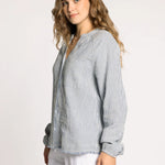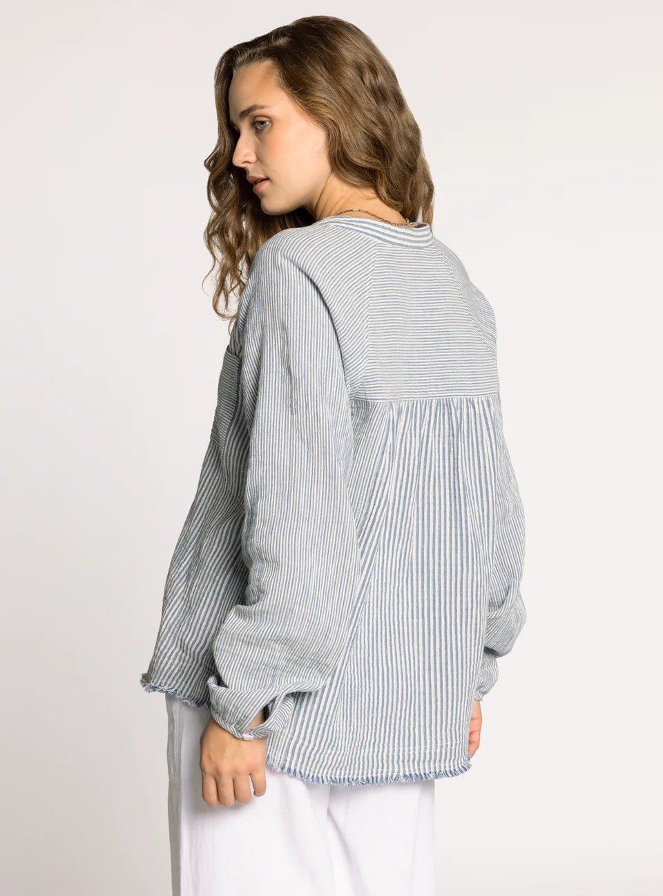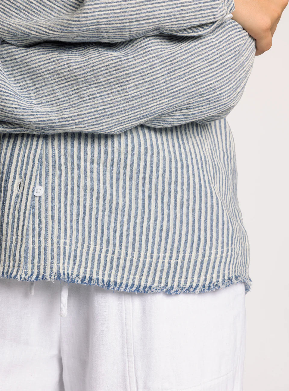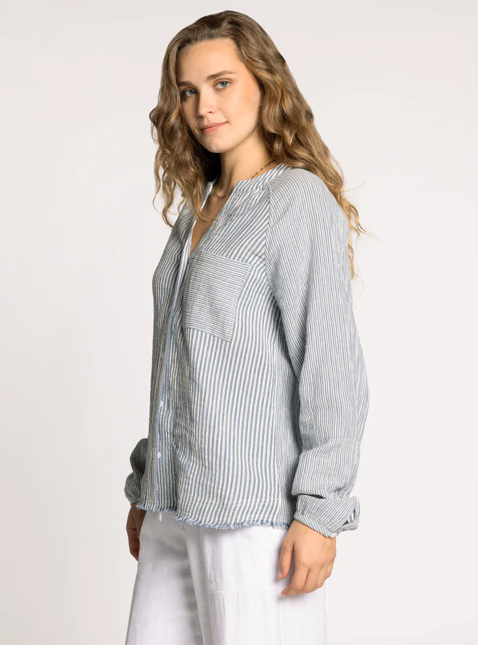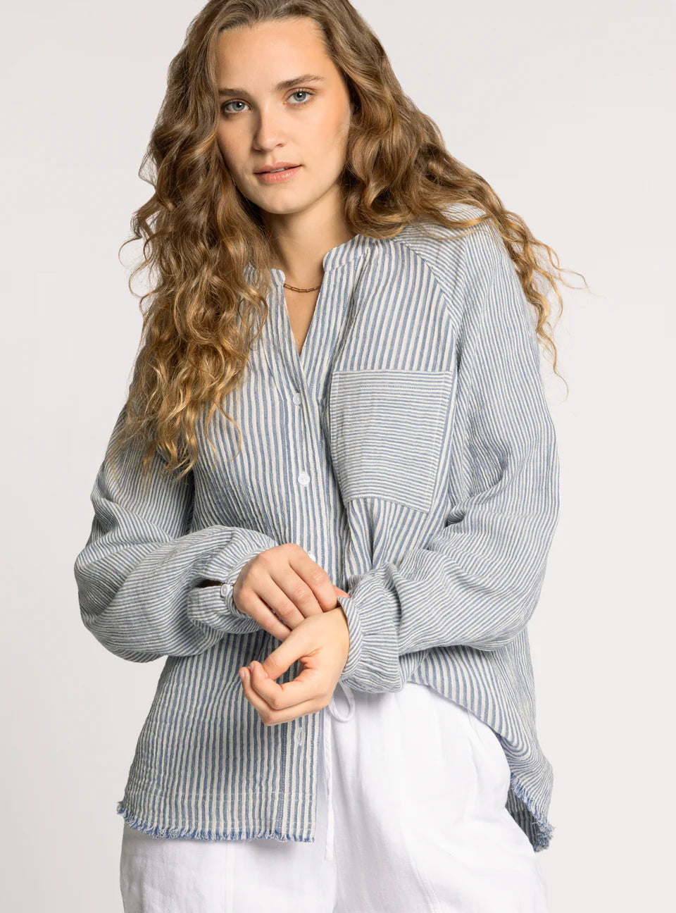A fun twist on a classic, this staple button-down is crafted from crisp cotton and designed with a unique frayed hem—making it anything but ordinary, yet just as essential. Pair it with the Maia Pant for a matching set.