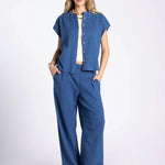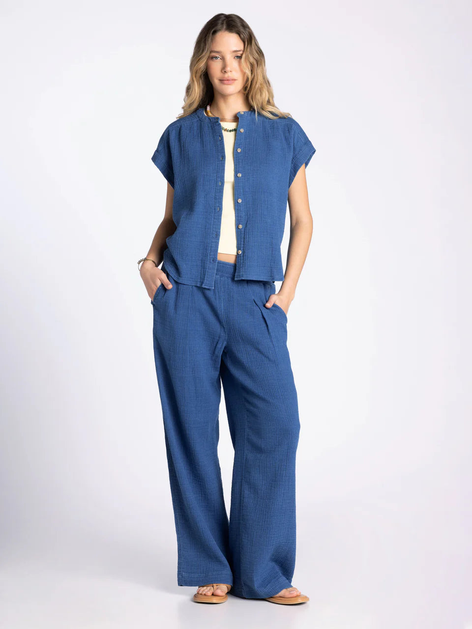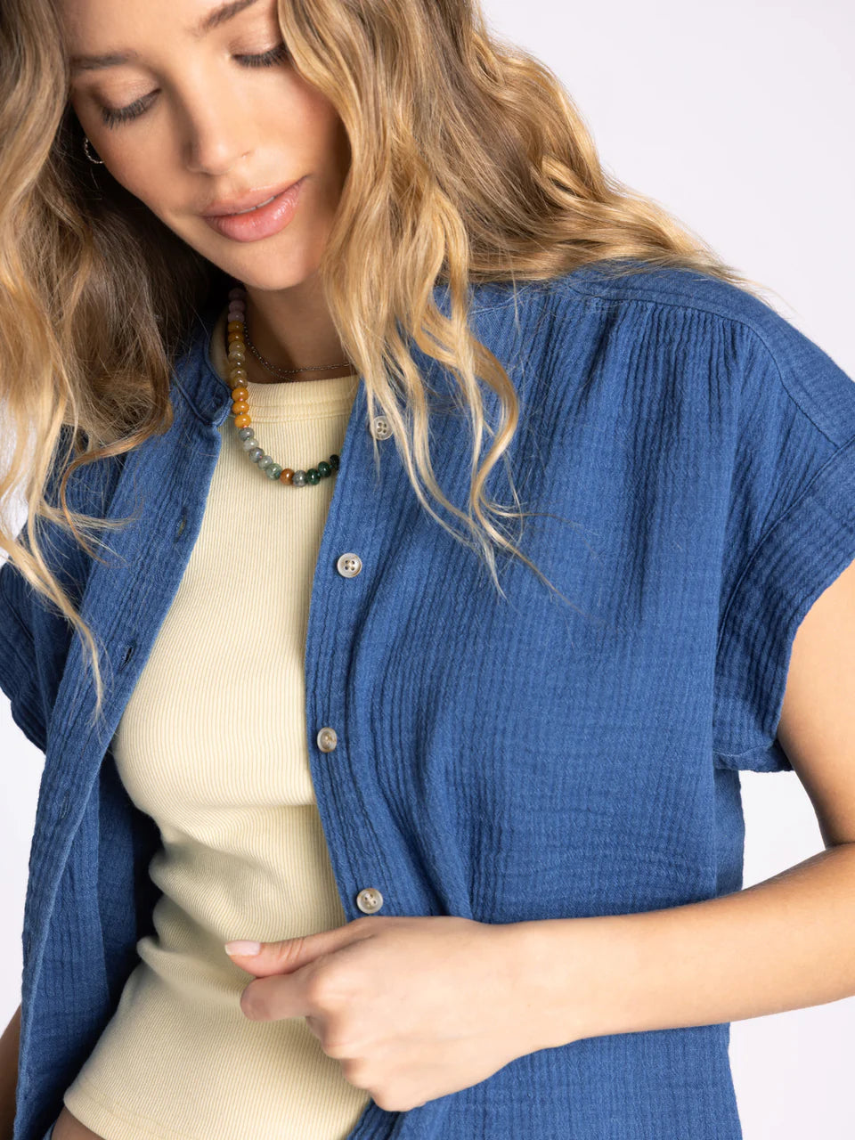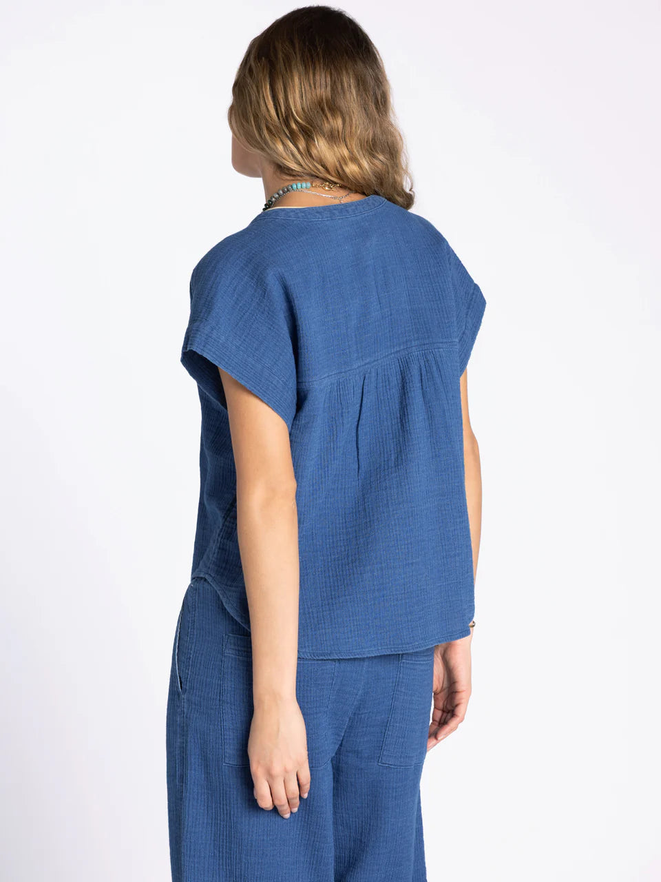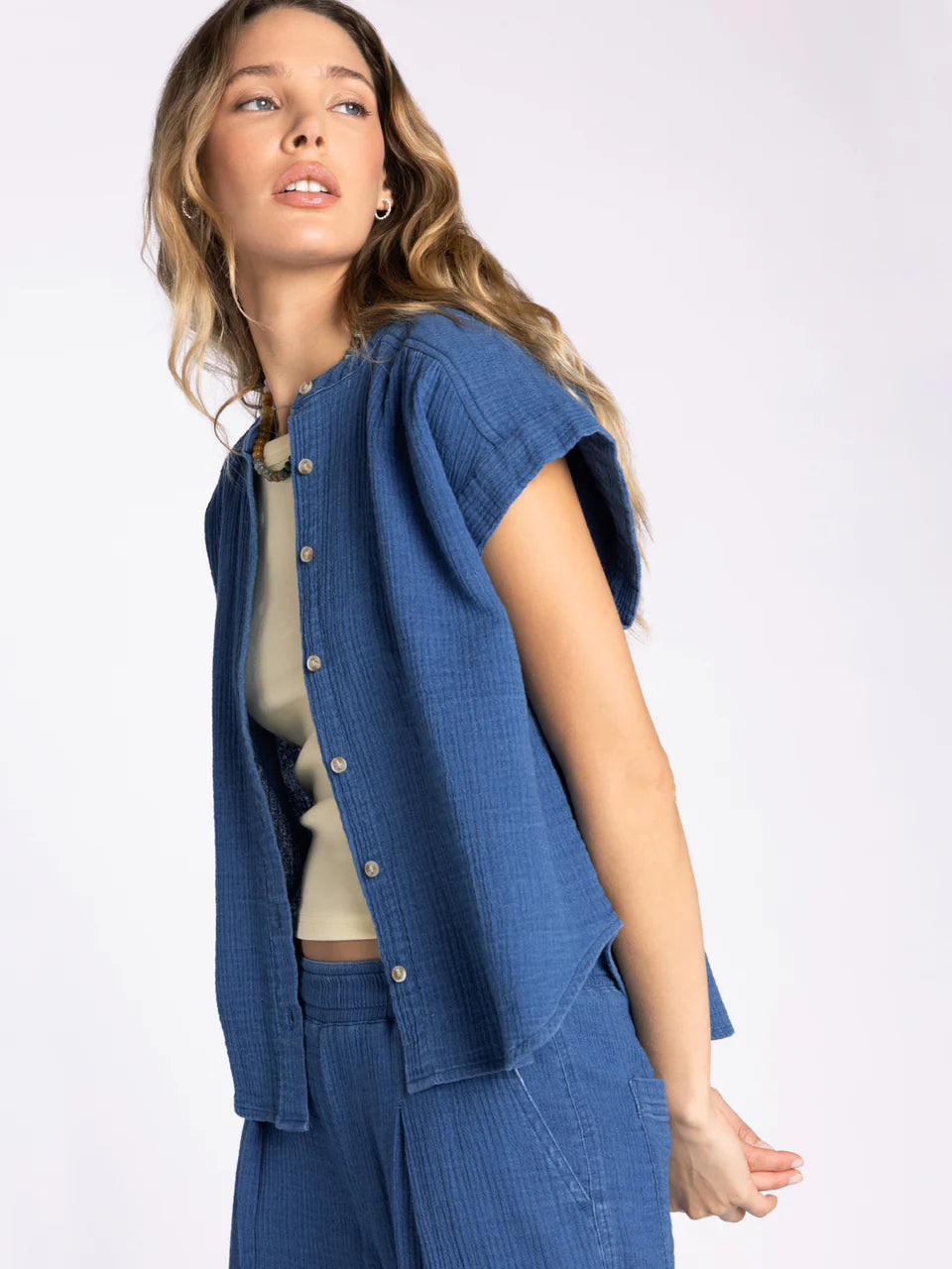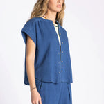 This breezy short sleeve button up is featured in our super soft gauze cotton, in a relaxed fit with cap sleeves. Make it a set with the Novalie Pant or Novalie Skirt.