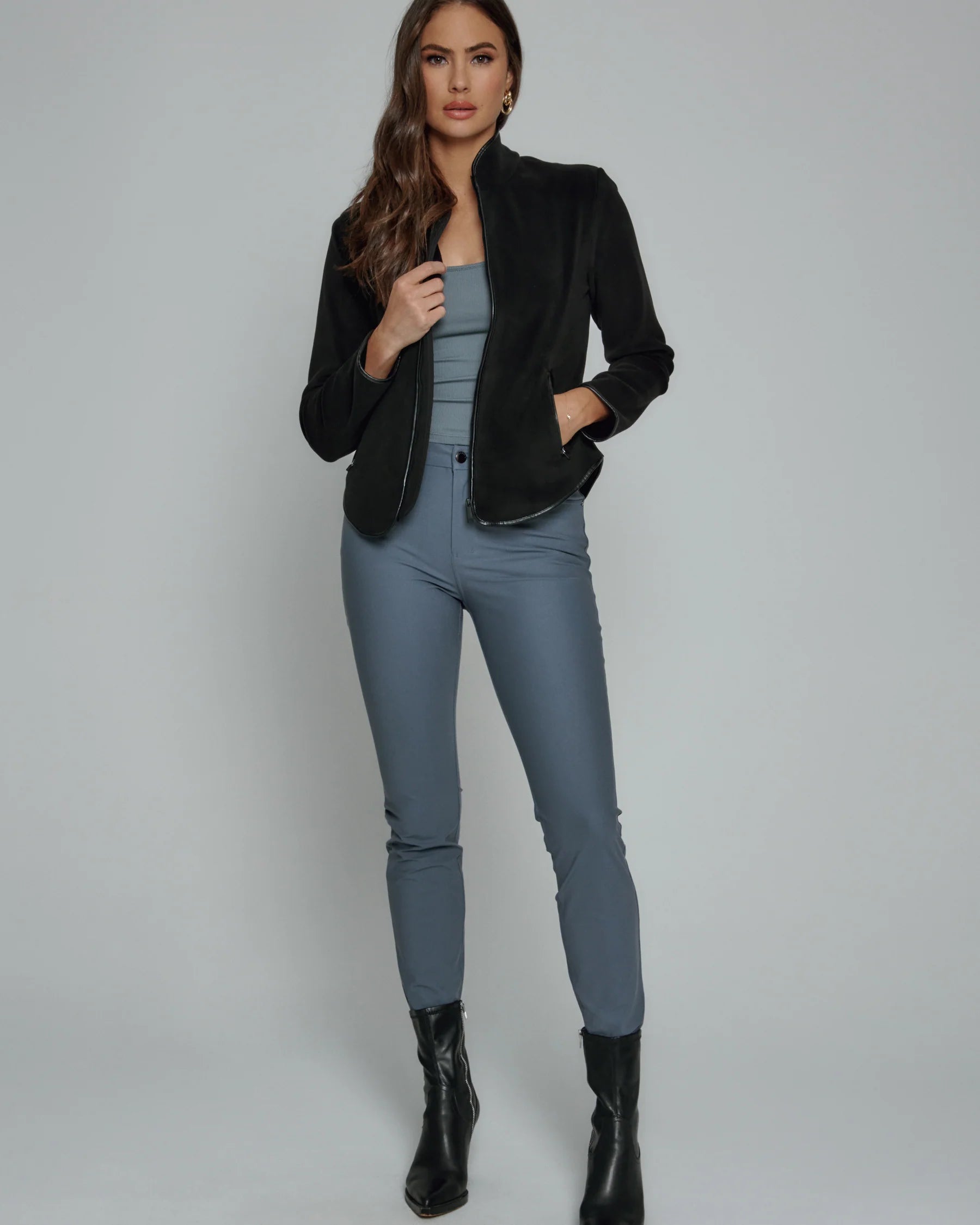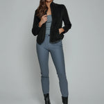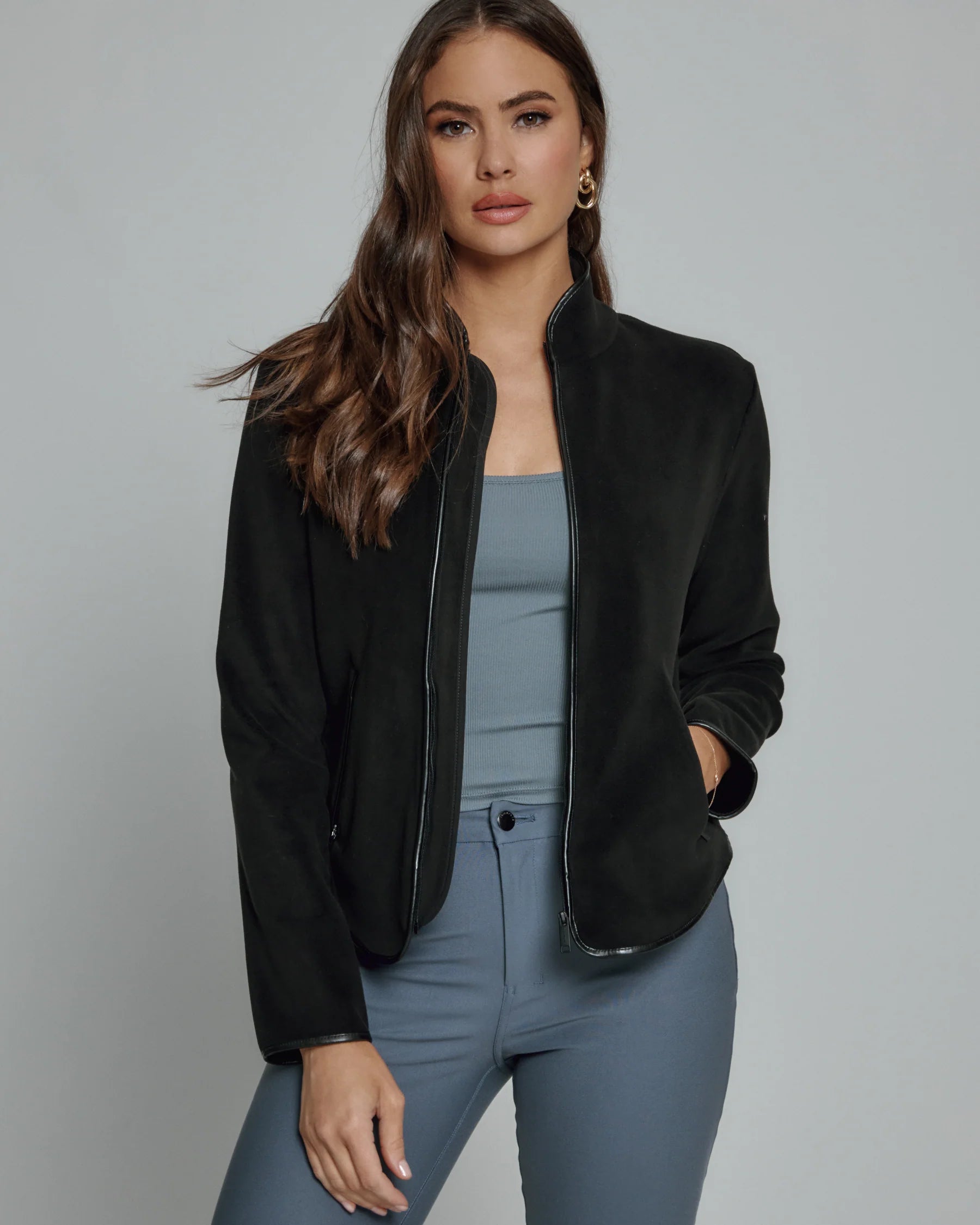 An everyday on-the-go jacket crafted with 2-way stretch fabric. Features full-zip closure, zip-up pockets, and faux leather trim. Great for a sleek office look or a night out ensemble.