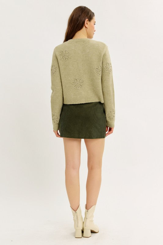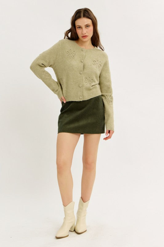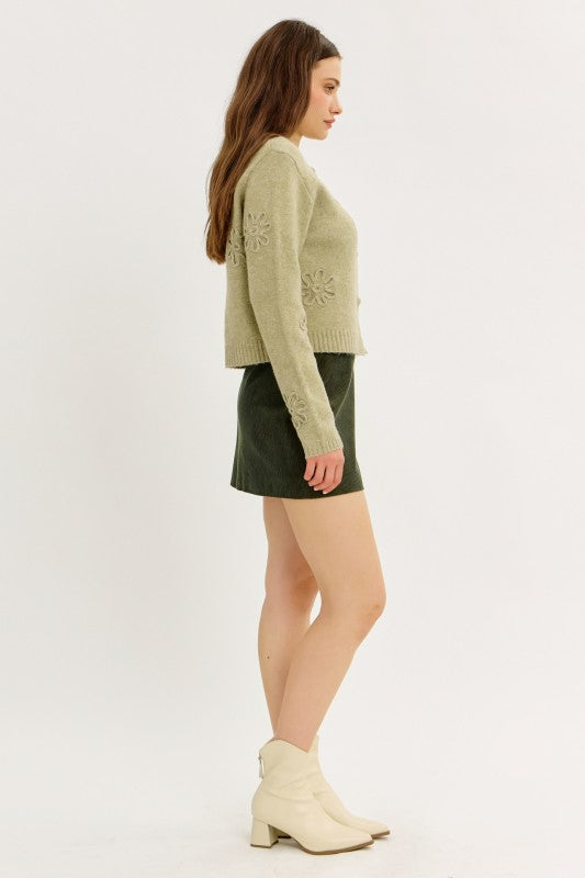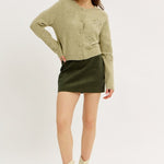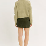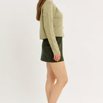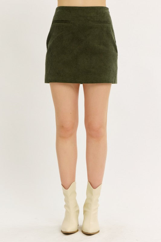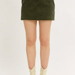 90s-inspired corduroy A-line mini skirt in smoky green. Features front faux welt detail and side zipper closure. Fully lined. Easy to pair with knits or boots for fall.