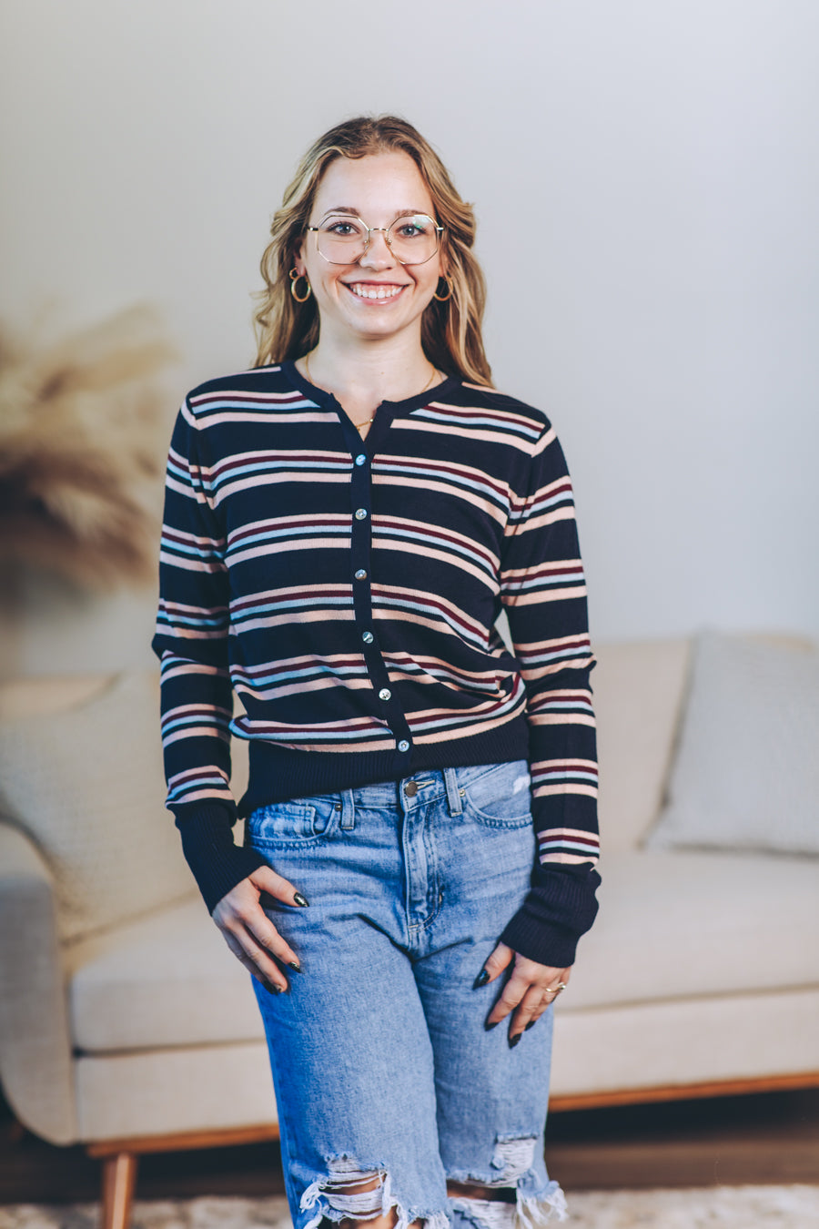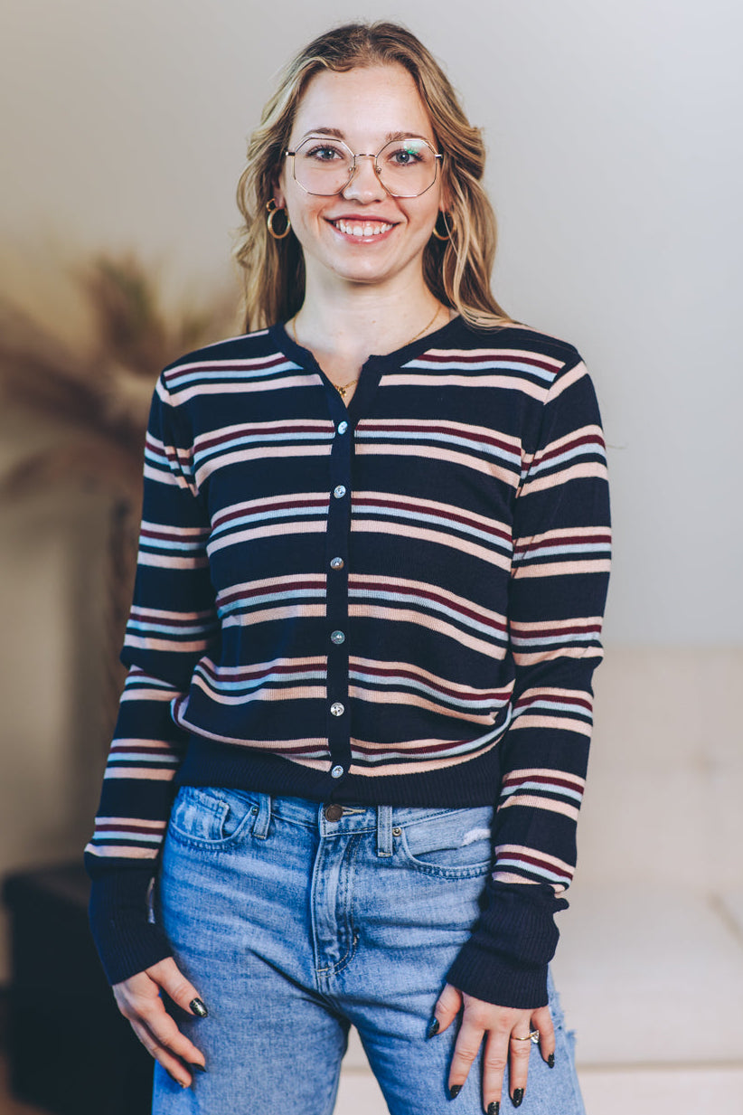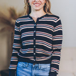 Add a pop of fun to your wardrobe with this button-down, color-block striped cardigan. Its long sleeves keep you cozy while the vibrant stripes bring playful energy to any outfit. Perfect for layering or brightening up a casual day!