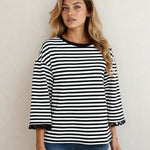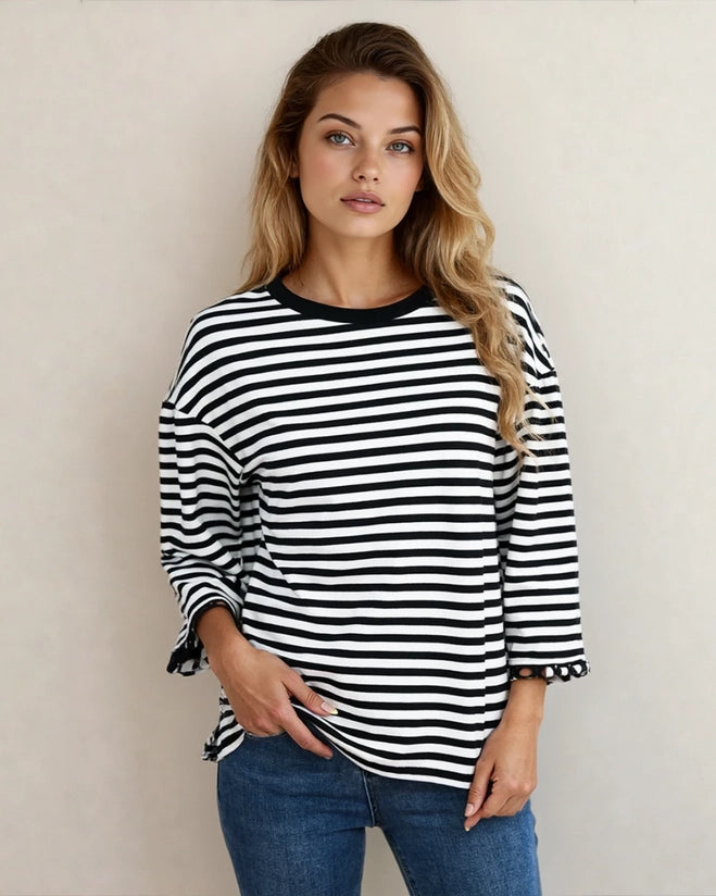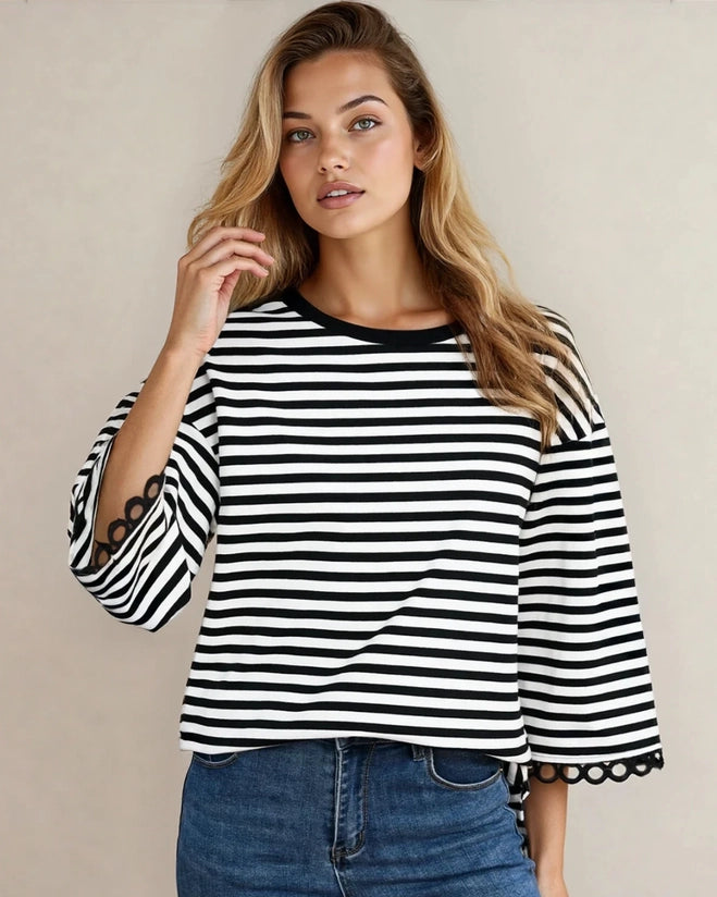 Meet your new wear-on-repeat top, the Amira Lace Trim Bell Sleeve Top in Black. Soft, flattering, and easy to dress up or down for real-life days. The Amira Lace Trim Bell Sleeve Top is made from a comfy cotton blend with a touch of stretch, designed with a classic round neckline and statement bell sleeves finished with delicate lace trim. It’s the kind of piece customers grab when they want to feel put together for errands, lunch dates, and everything in between. Perfect as an everyday top for stylish women who want a comfy yet cute look for work, school drop-off, weekend plans, casual dinners, layering, and easy gifting.