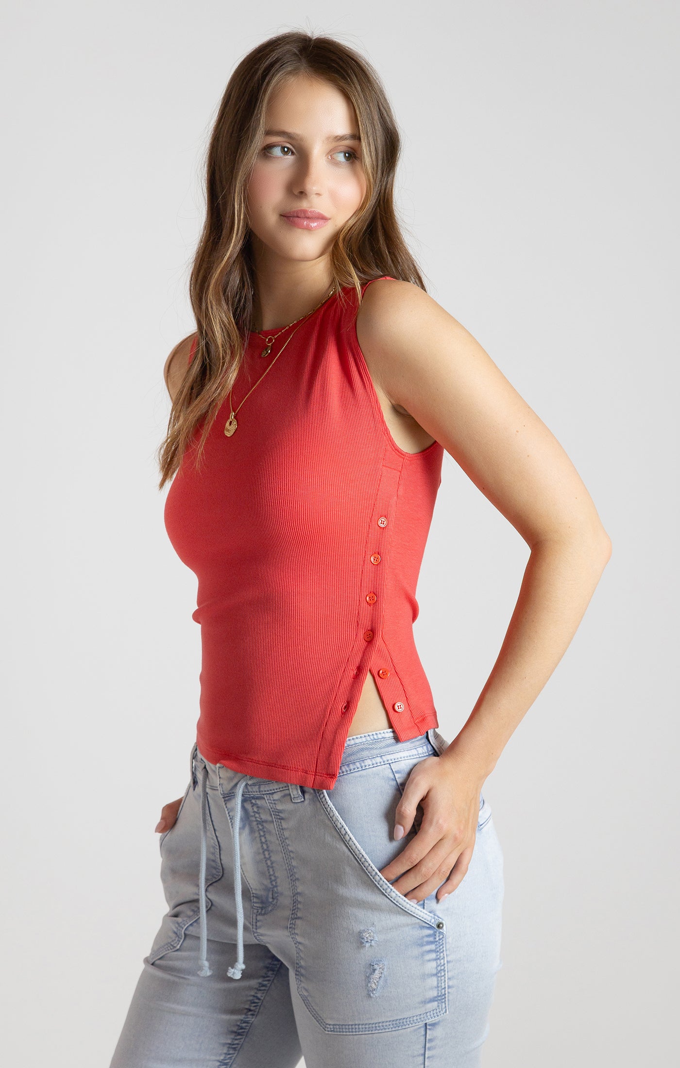 Elevate your spring wardrobe with this charming asymmetrical tank featuring a high neckline and soft seasonal hues. The adorable side button detail adds a playful touch that sets it apart from basic basics. Perfect for layering or wearing solo, this versatile piece transitions seamlessly from casual days to weekend outings. A modern take on classic style that brings personality to any outfit.