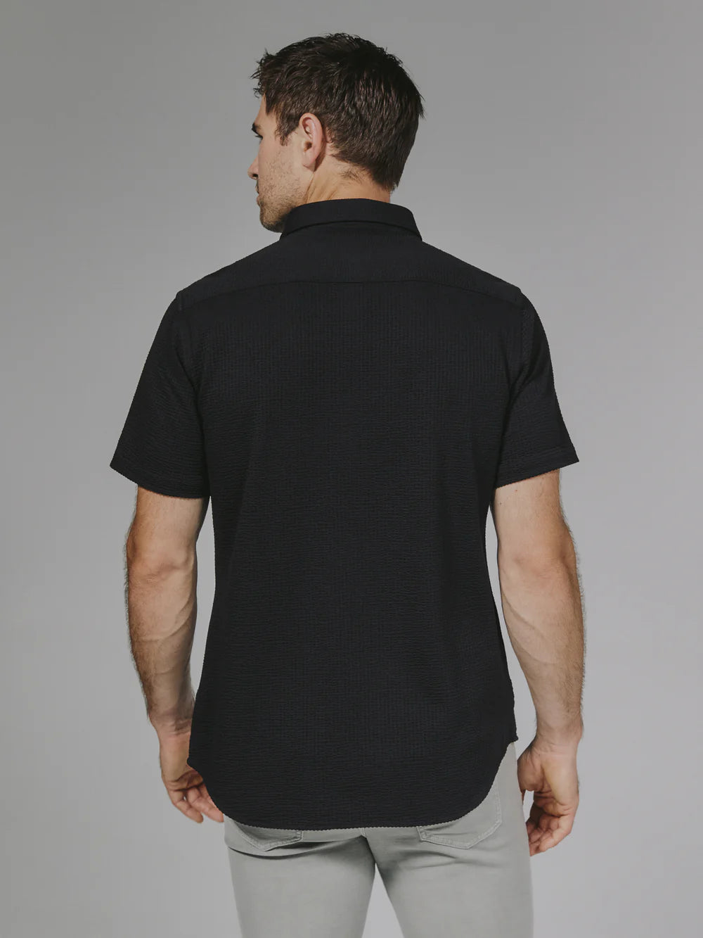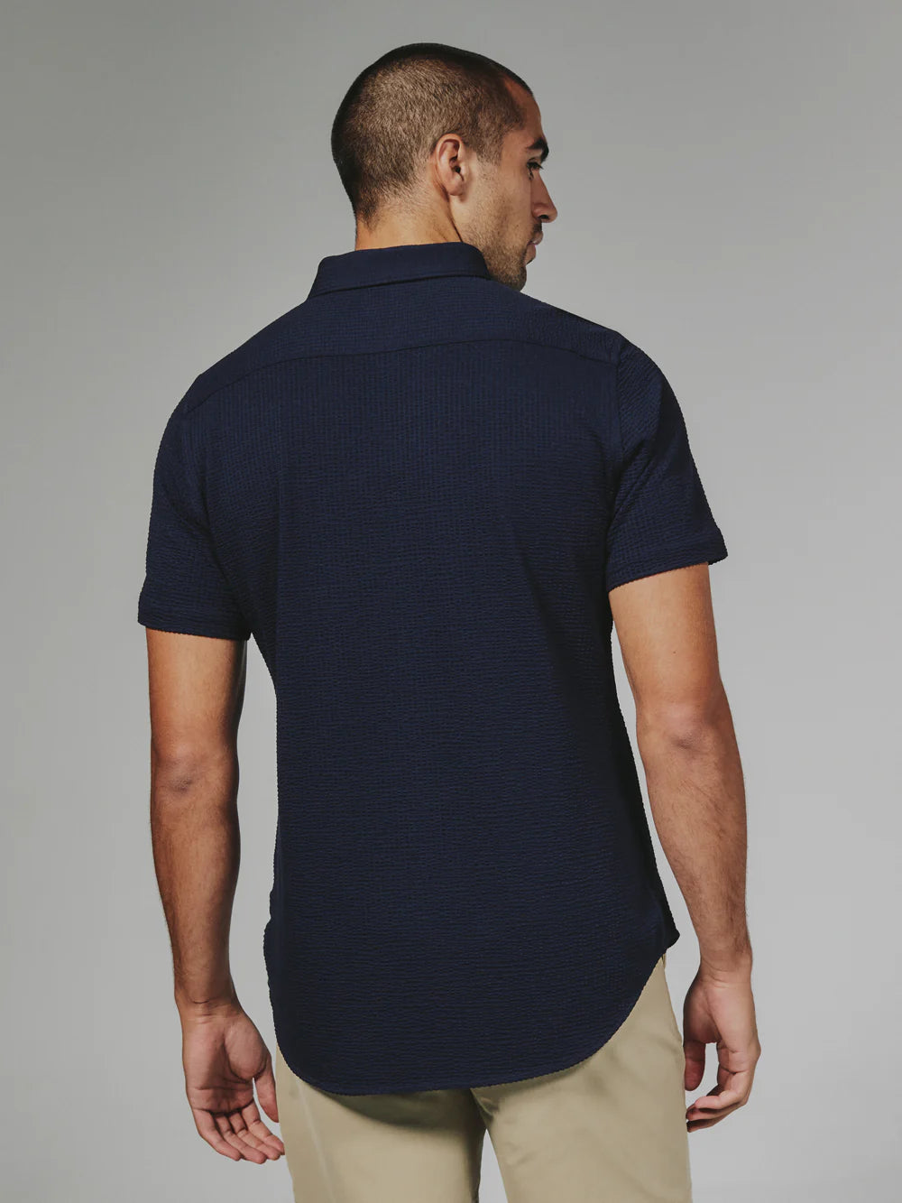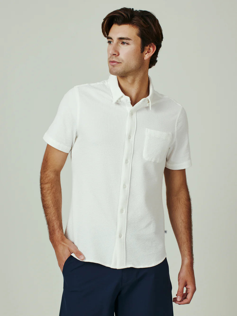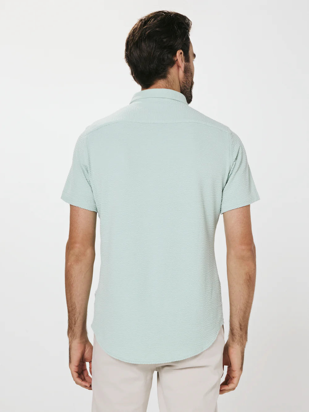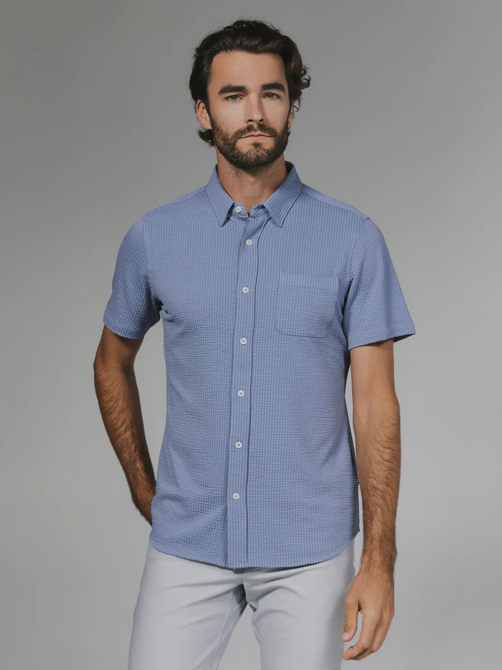 A modern twist on the classic seersucker shirt. Crafted with a nylon fabric blend that allows a super soft hand-feel and incredible stretch. Cool to the touch, airy, and breathable — making it the perfect summer staple.