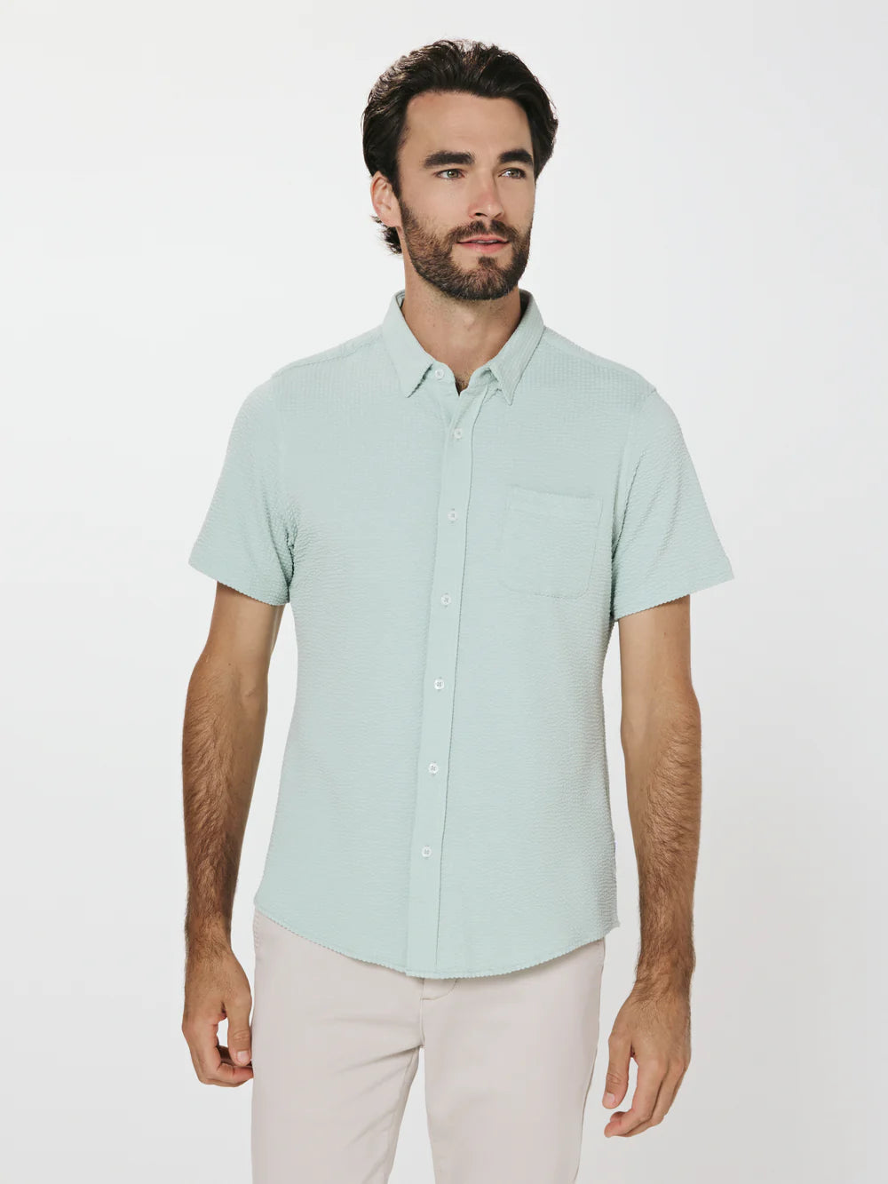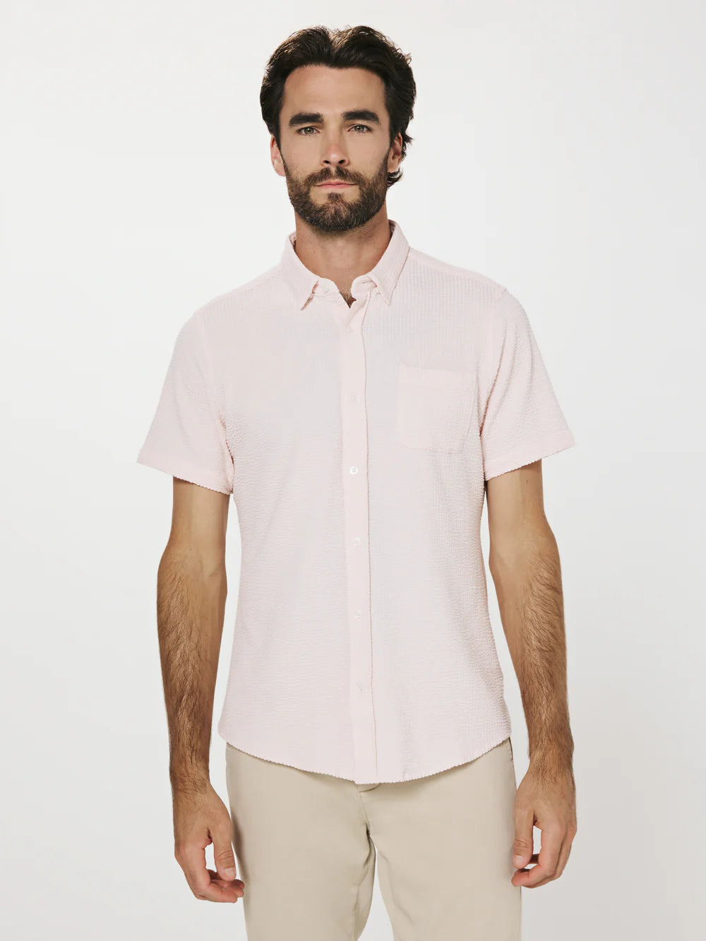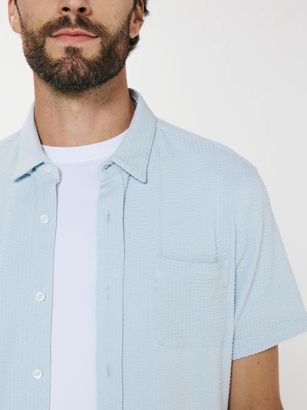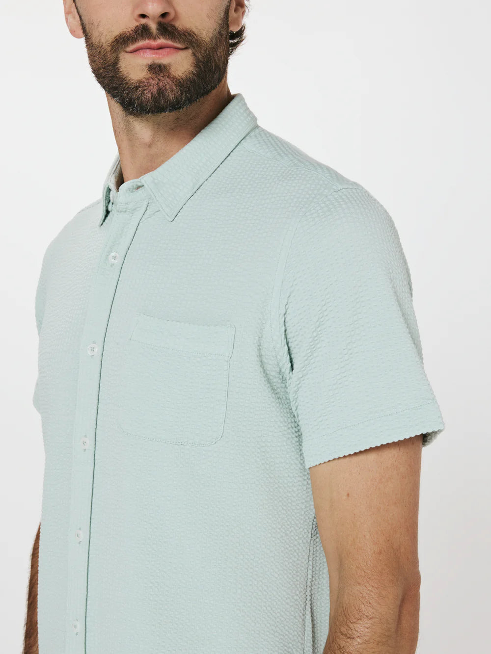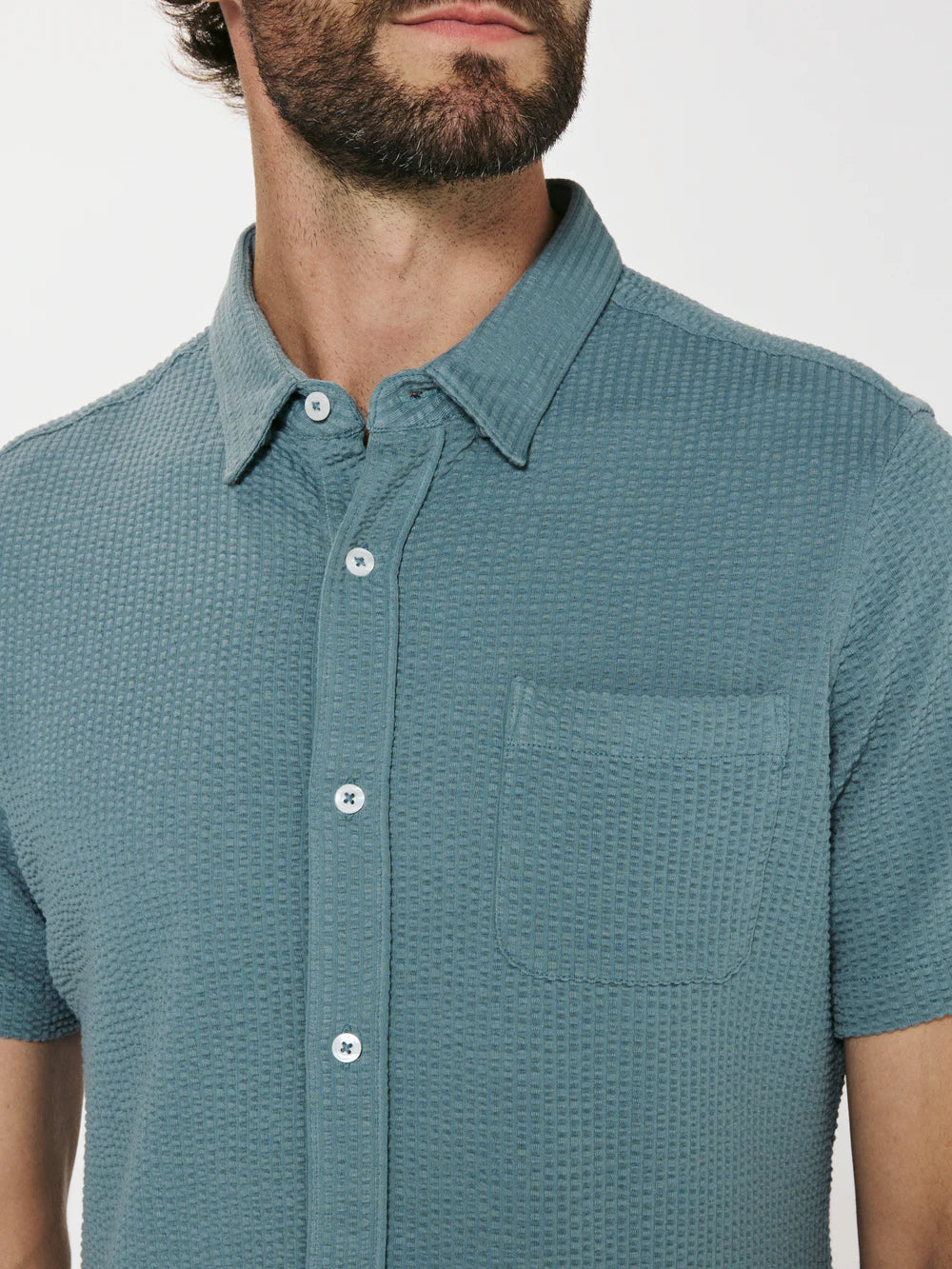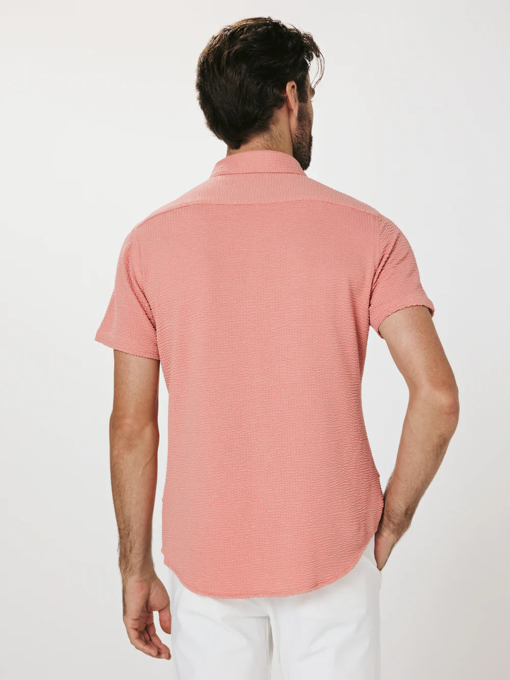 A modern twist on the classic seersucker shirt. Crafted with a nylon fabric blend that allows a super soft hand-feel and incredible stretch. Cool to the touch, airy, and breathable — making it the perfect summer staple.