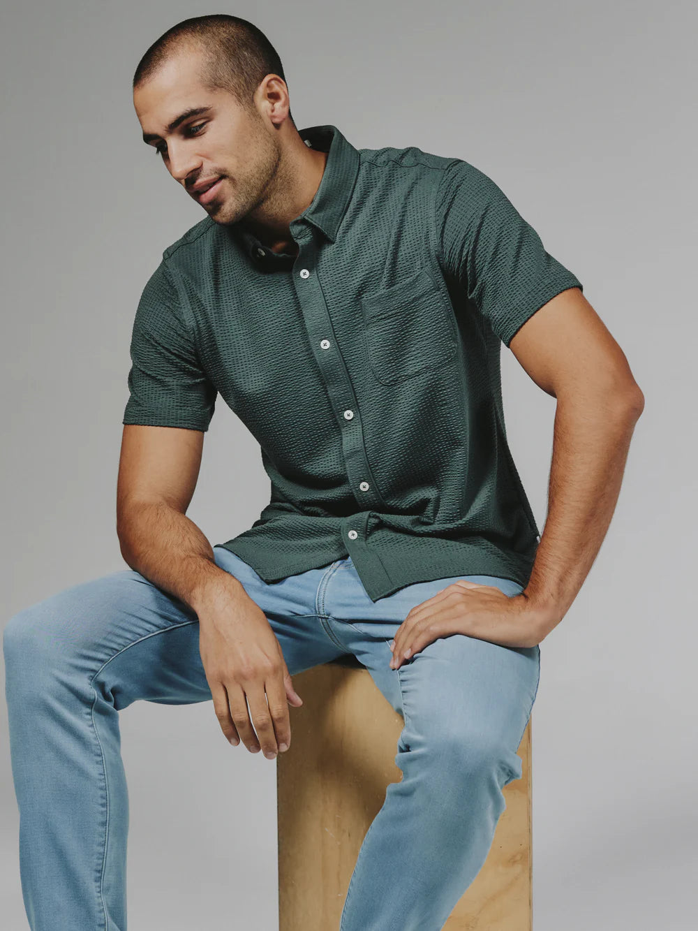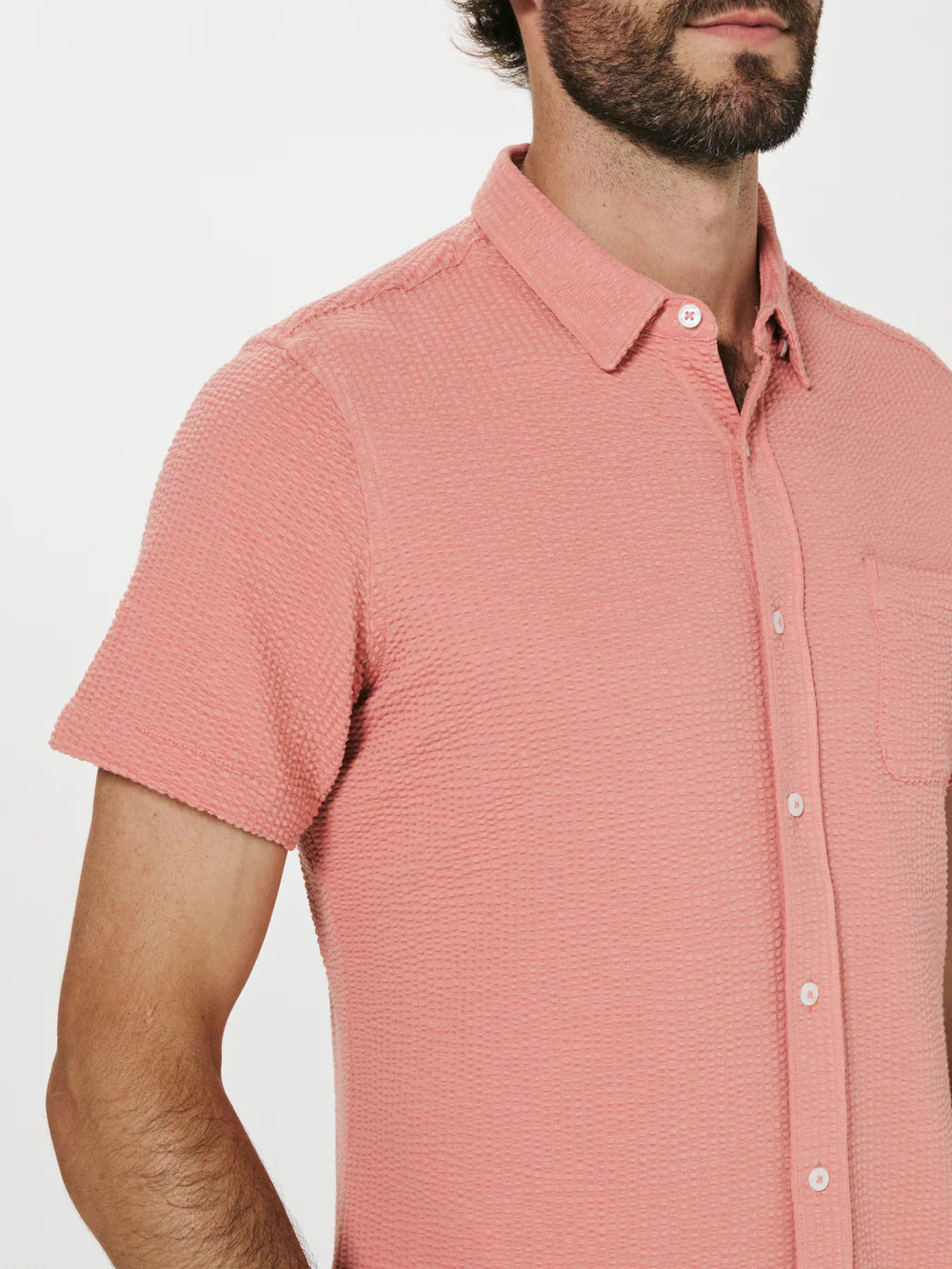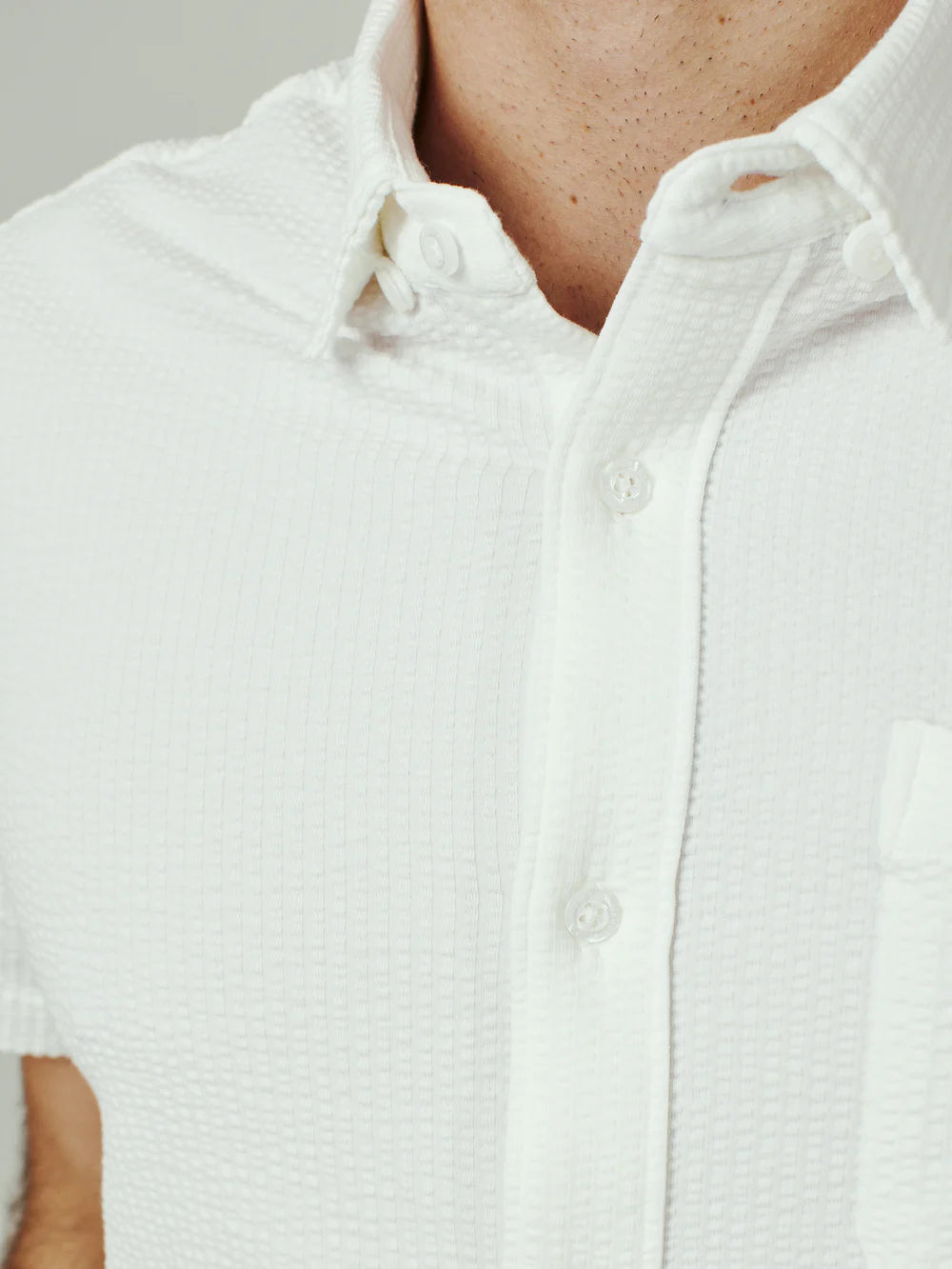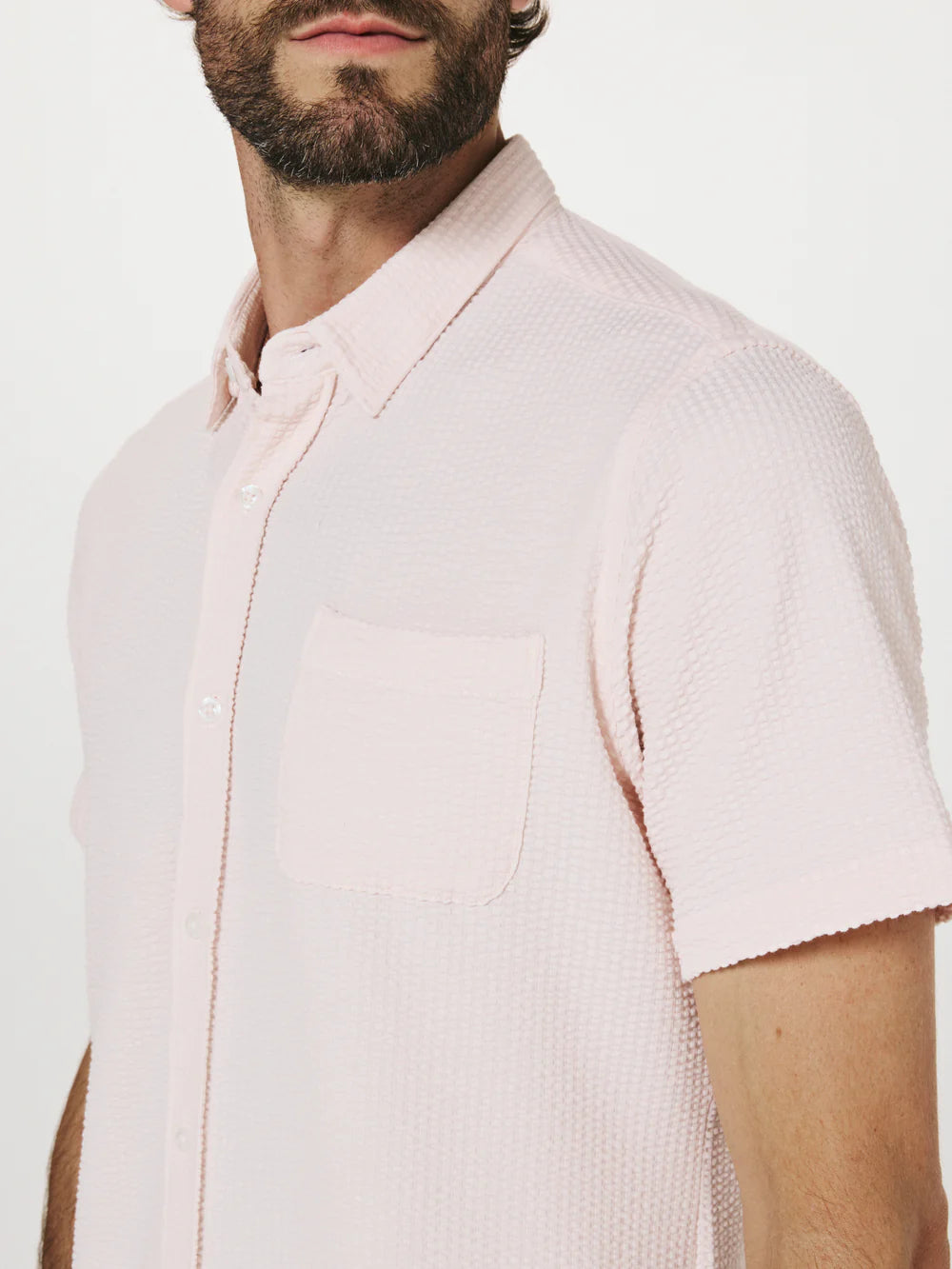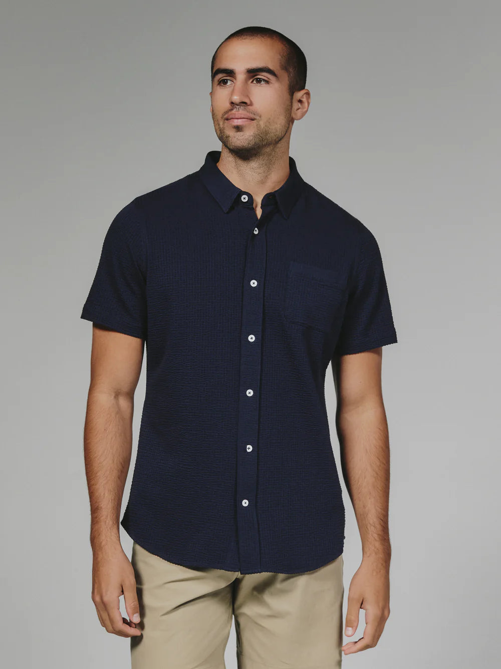 A modern twist on the classic seersucker shirt. Crafted with a nylon fabric blend that allows a super soft hand-feel and incredible stretch. Cool to the touch, airy, and breathable — making it the perfect summer staple.
