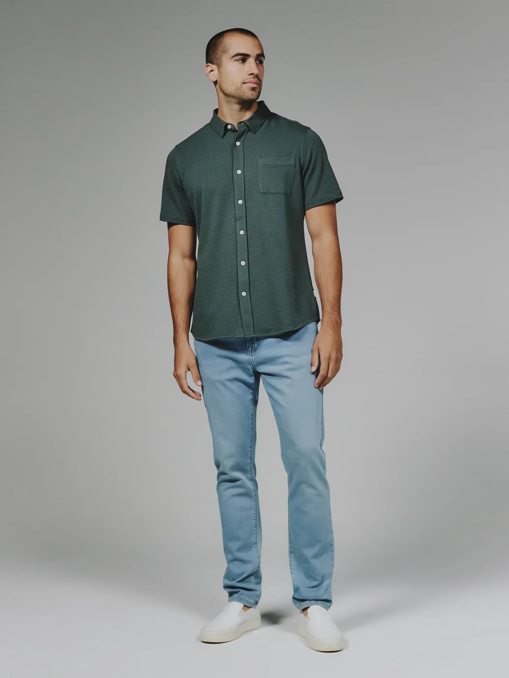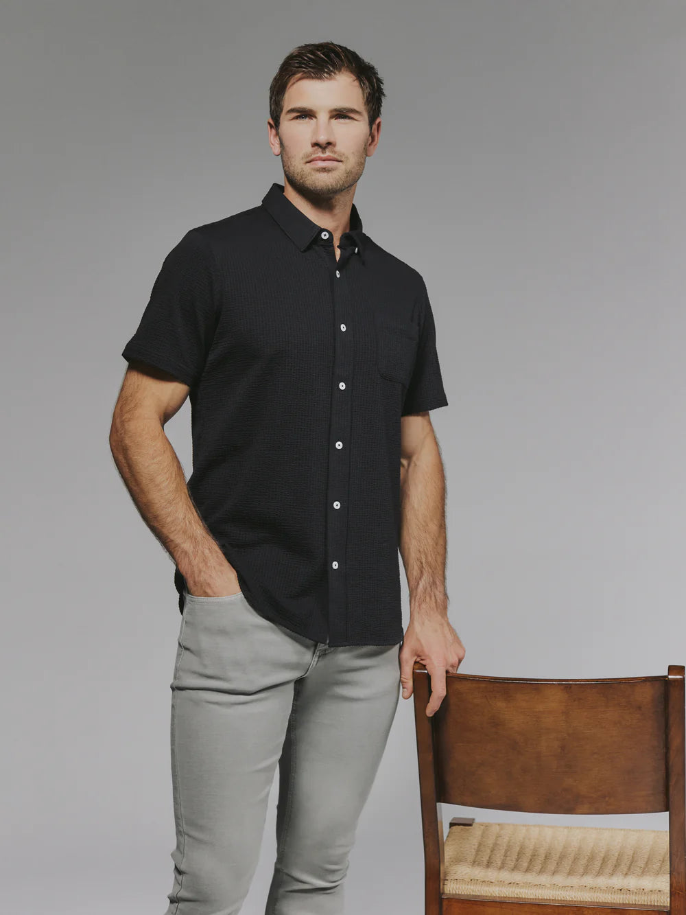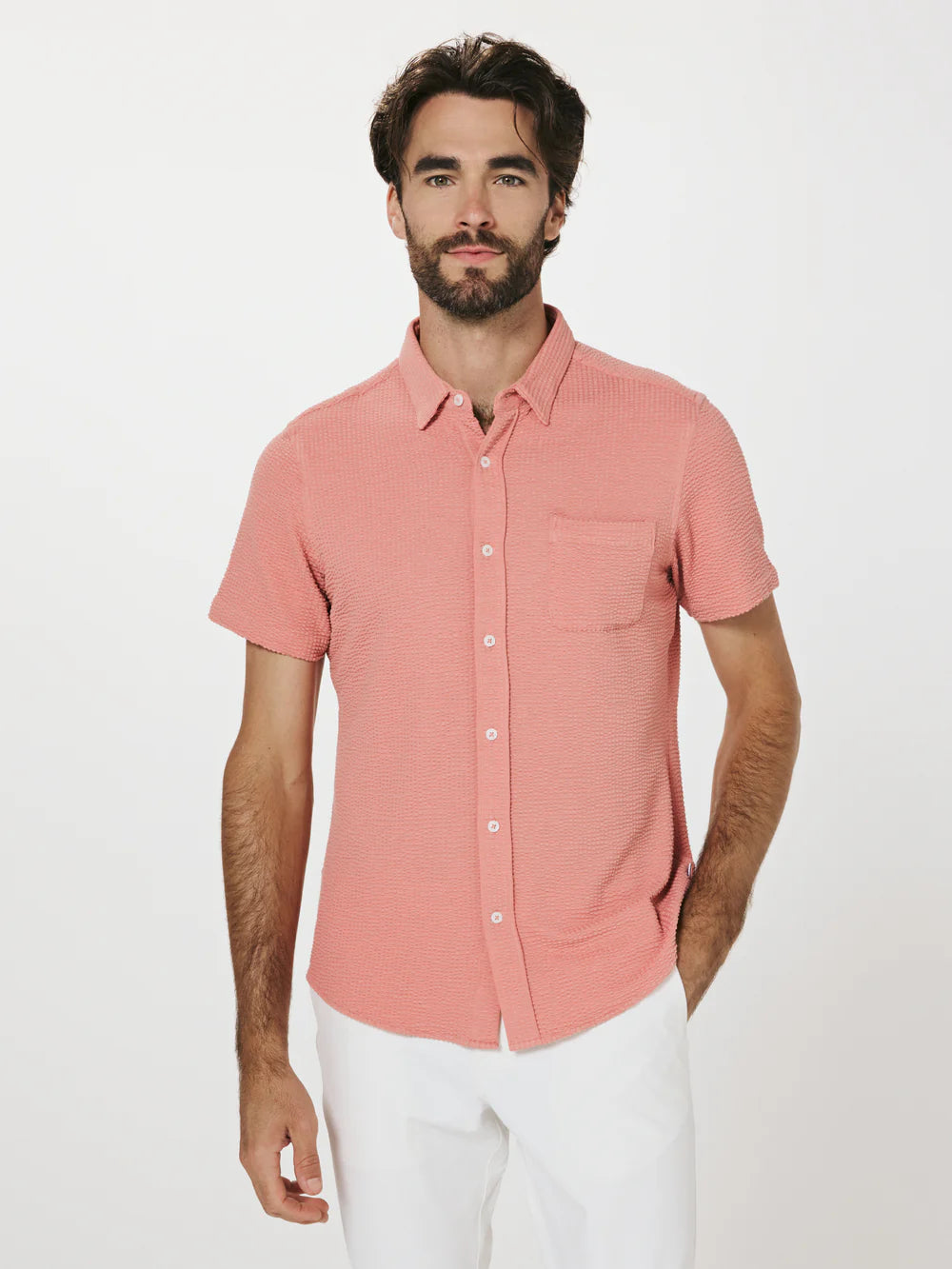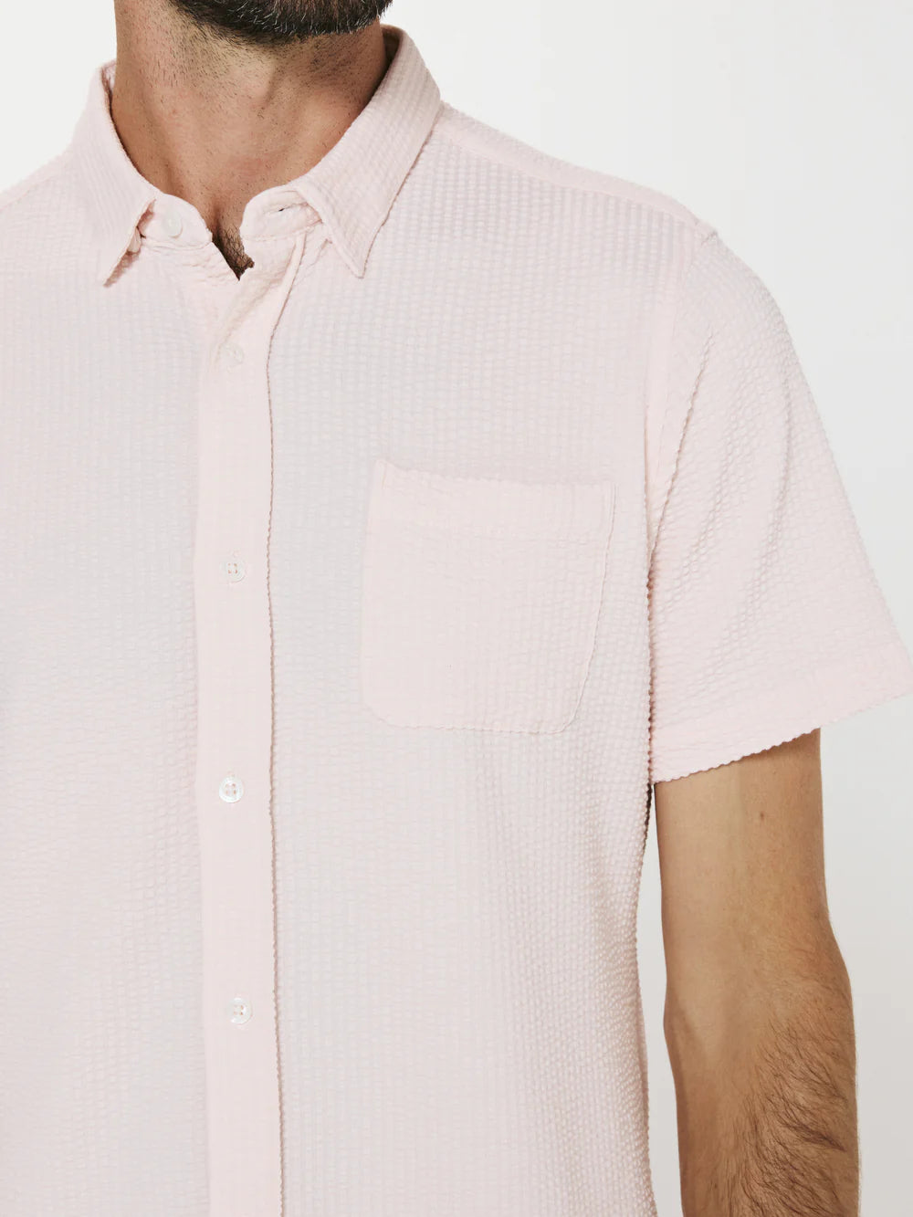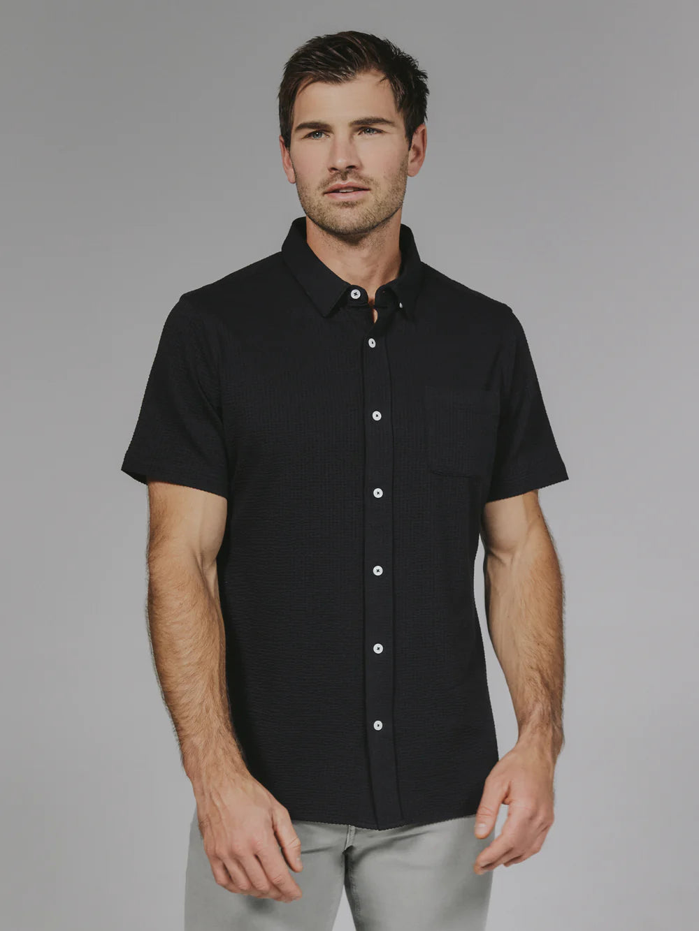 A modern twist on the classic seersucker shirt. Crafted with a nylon fabric blend that allows a super soft hand-feel and incredible stretch. Cool to the touch, airy, and breathable — making it the perfect summer staple.