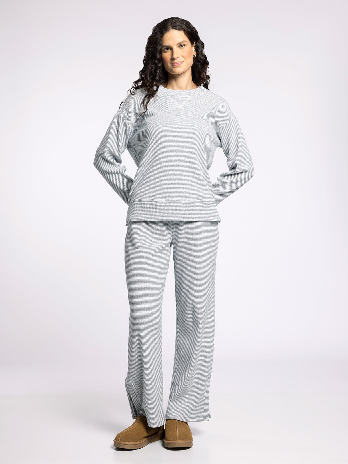 Stay cozy this season, the Blaine top is featured in a brushed cotton blend rib knit, super soft, and a drop shoulder, relaxed fit - great for staying warm in the winter.