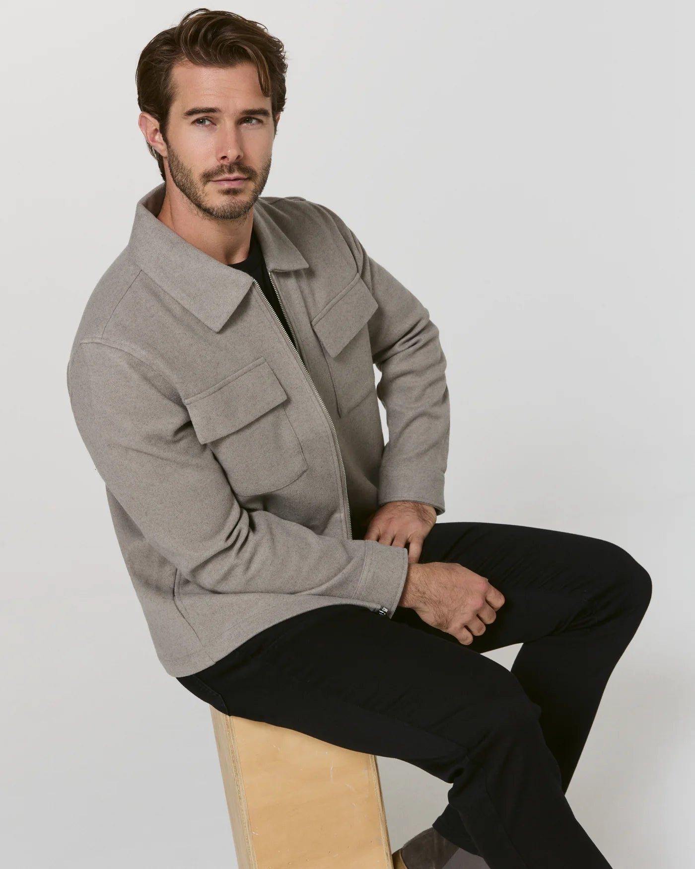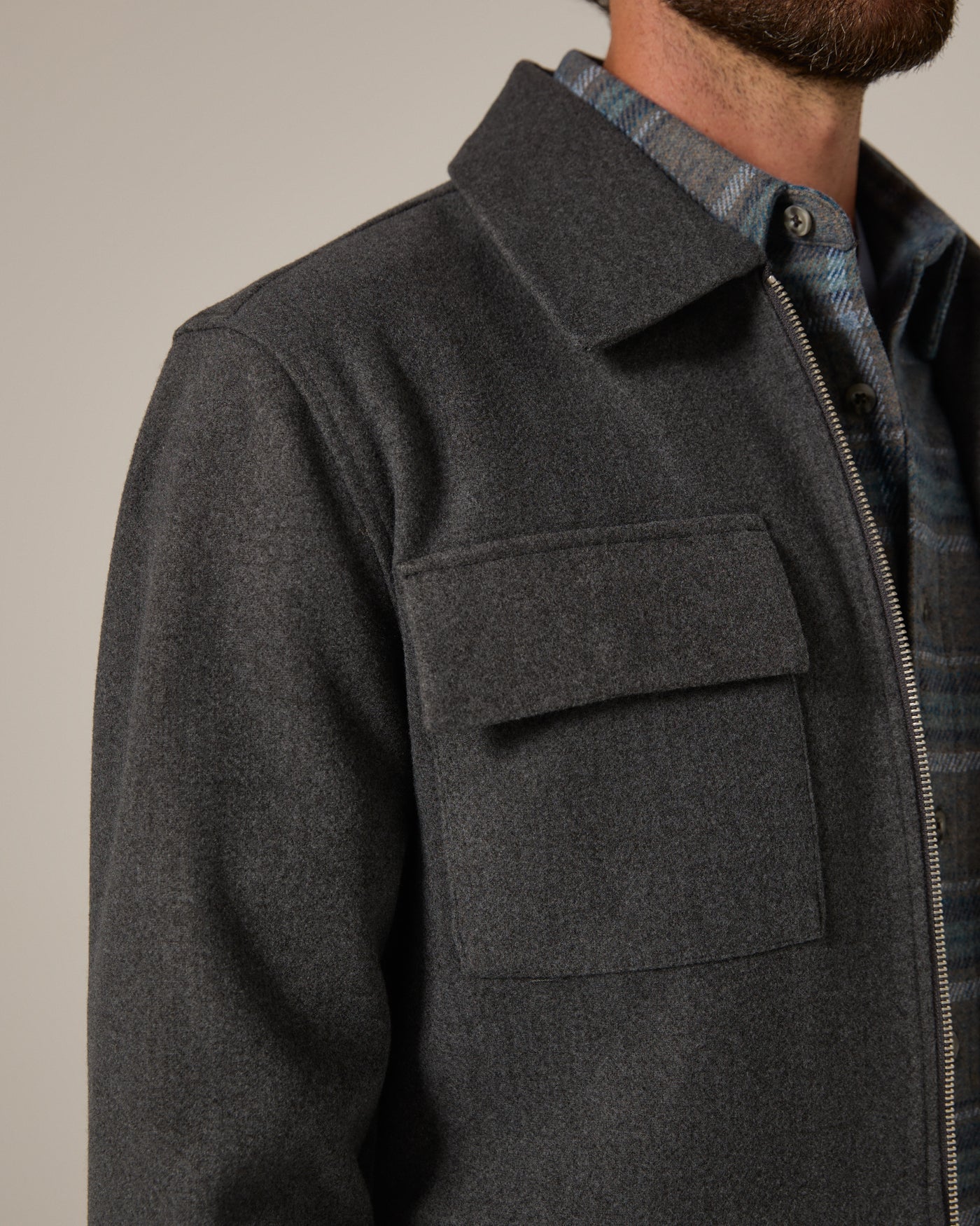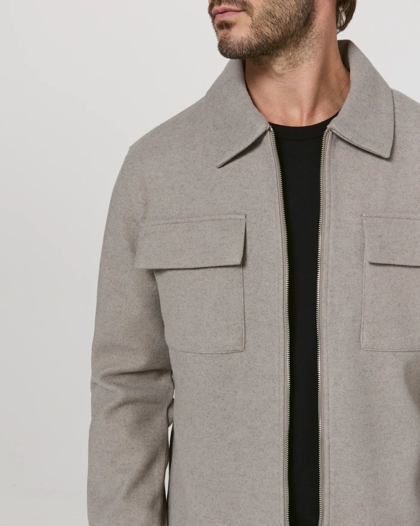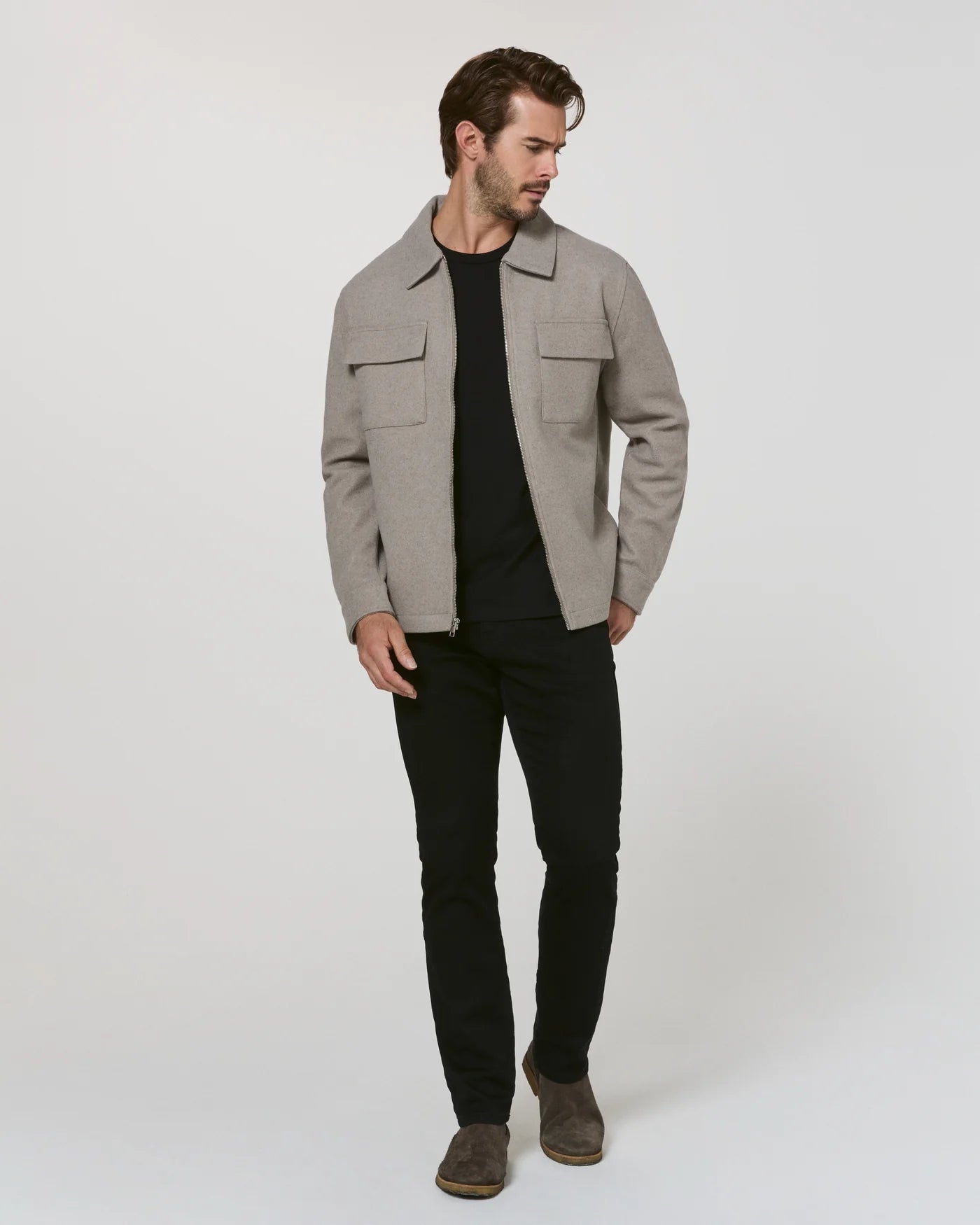 A modern layer that works with everything. Made from premium fabric with a sophisticated wool-look finish, it features a sleek metal zip front, double chest pockets, and button cuffs. Fully lined for easy on and off, it pairs effortlessly with office attire or to elevate your casual look. Fit: Relaxed