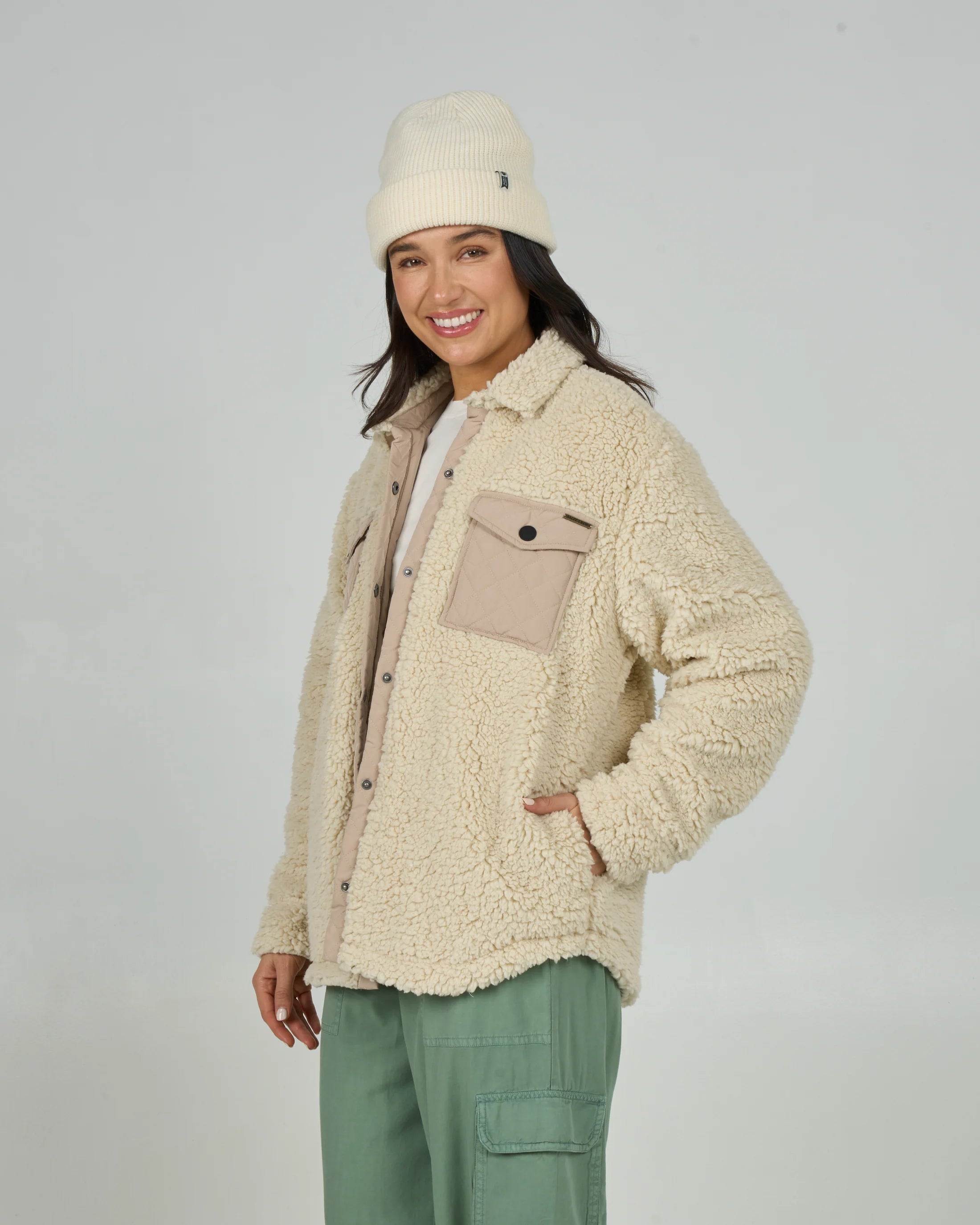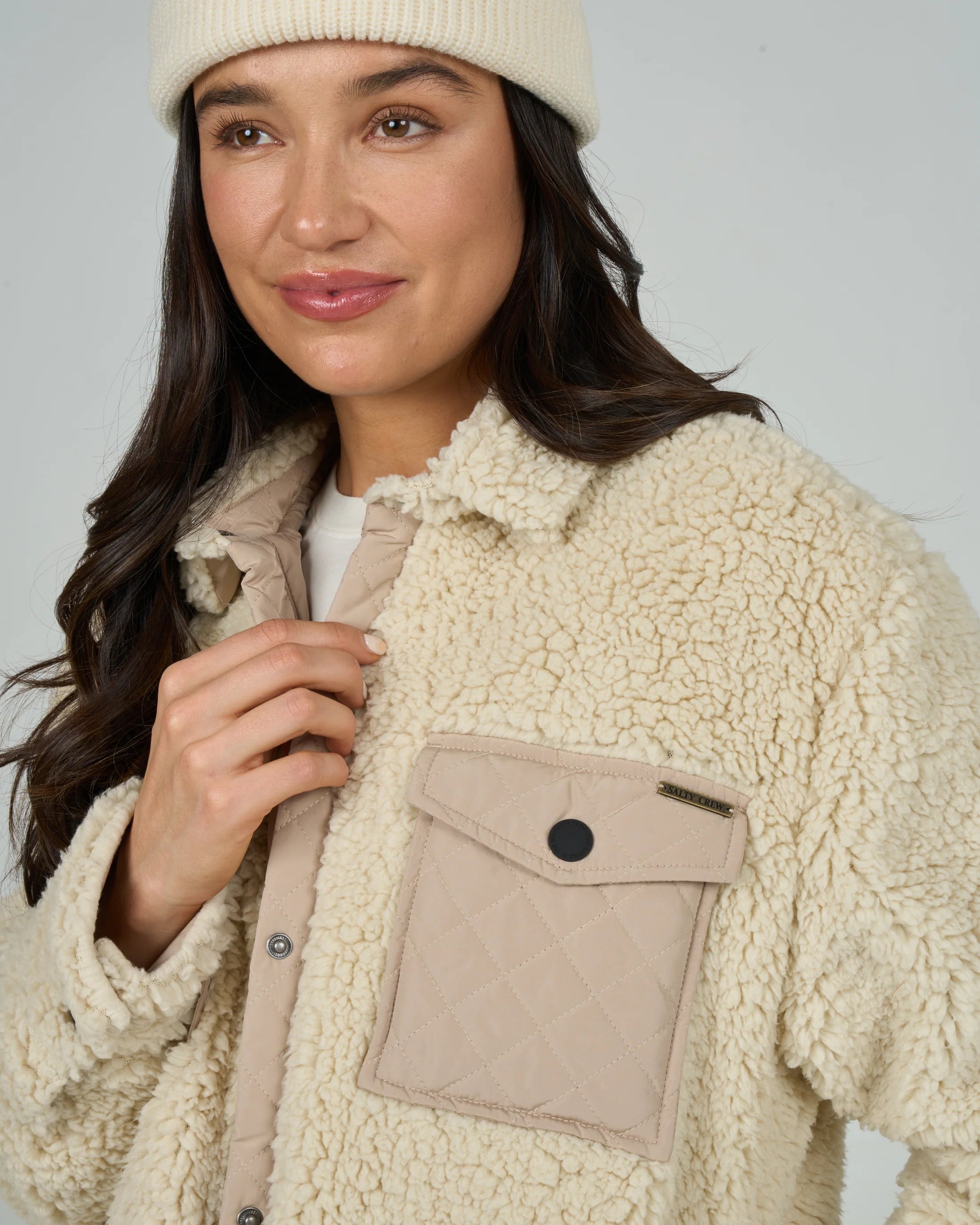 Dive into cozy vibes with the Calm Seas Shacket—your new favorite layer for everything from beach hangs to casual adventures. Crafted from plush sherpa with a crisp poplin exterior, this fully lined jacket strikes the perfect balance between soft and structured. Snap it up with the convenient front closure, stash your essentials in the quilted chest and hand pockets, and rock the metal branding detail at the chest. Whether you're catching waves or catching up with friends, this shacket's got your back.