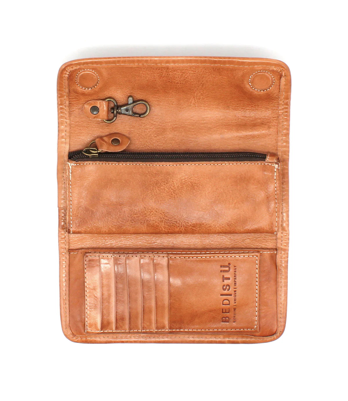 - Interior contains 1 zippered pocket, 1 slip pocket, and 6 credit card slots