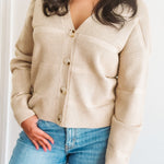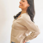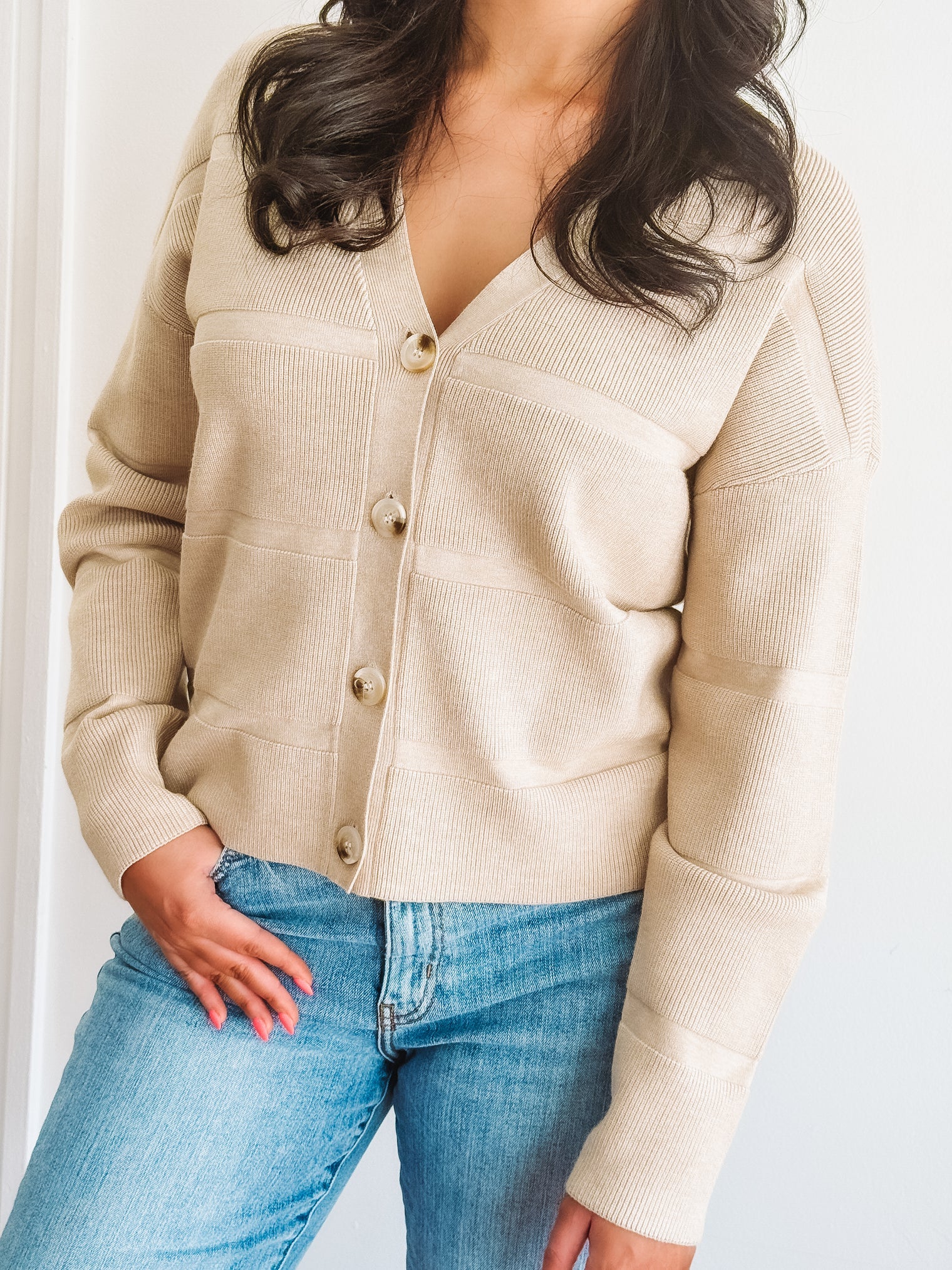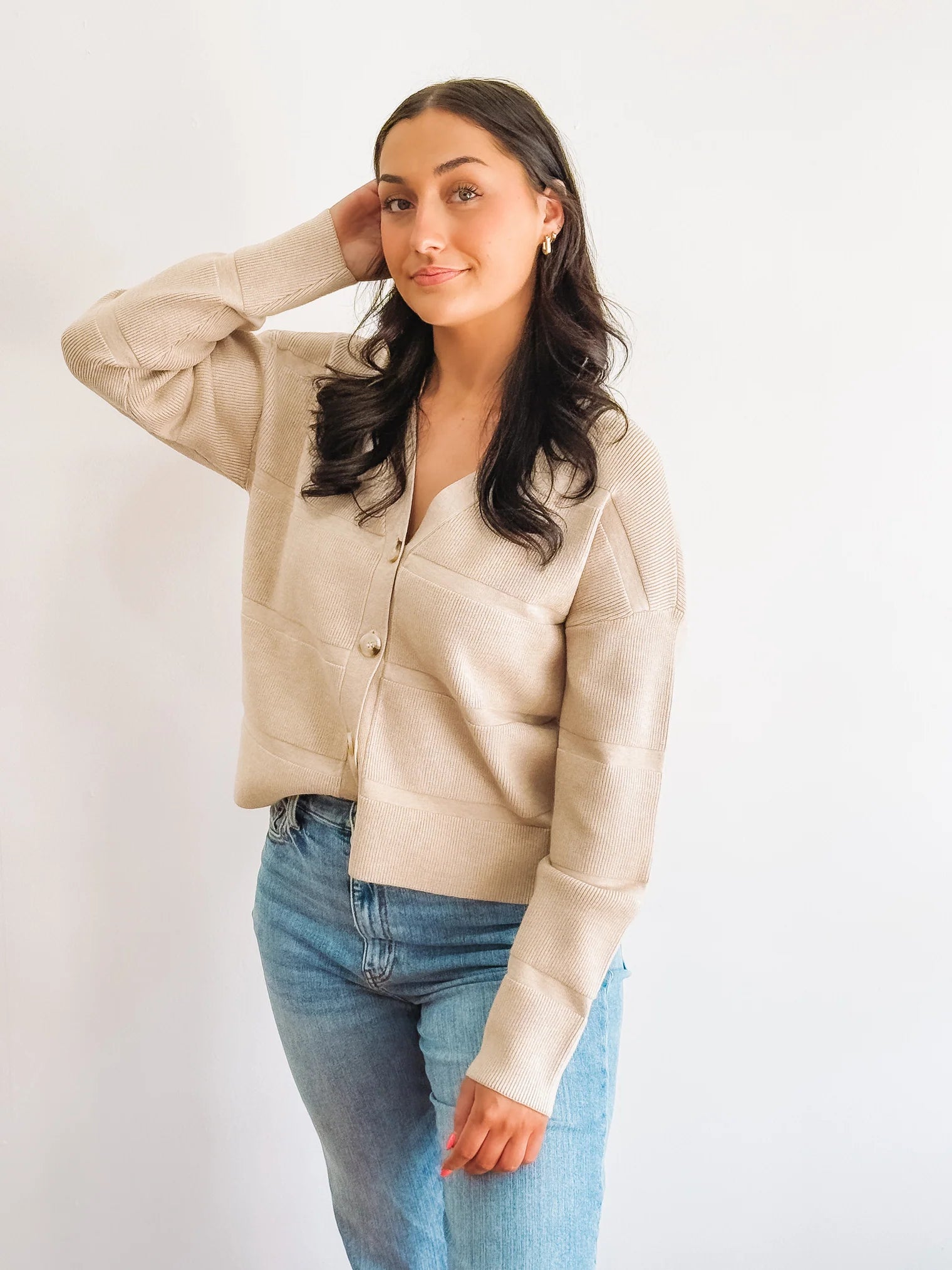 This striped tan cardigan is serving up major coffeehouse chic vibes. With its stretchy fabric, deep V-neck and 4-button front, it's perfect for those days when you want to feel cozy and still look good. Whether you layer it or wear it solo, this versatile queen has you covered. The monochrome stripes add a little extra to the neutral tone—because why settle for completely basic when you can have this? Libertie is 5'11 pictured in the size medium, which is one size down from her preferred size large in tops. Consider sizing down one.