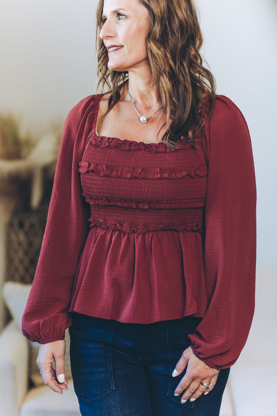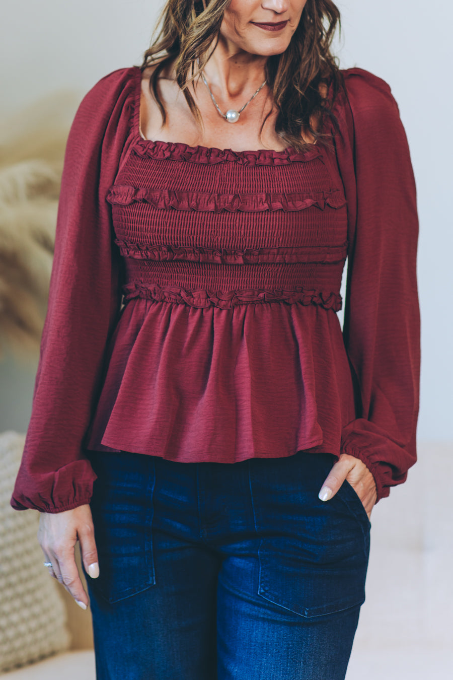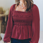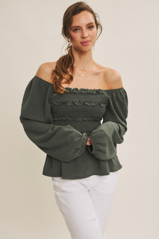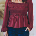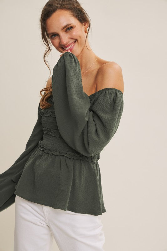 This Convertible Babydoll Blouse offers a playful twist with its off-the-shoulder design and smocked, crinkled woven fabric. Featuring a charming square neckline and delicate mini ruffles at the bust, it effortlessly blends flirty and feminine. The long balloon sleeves add a touch of whimsy, perfectly complementing the relaxed babydoll silhouette for easy, breezy style.
