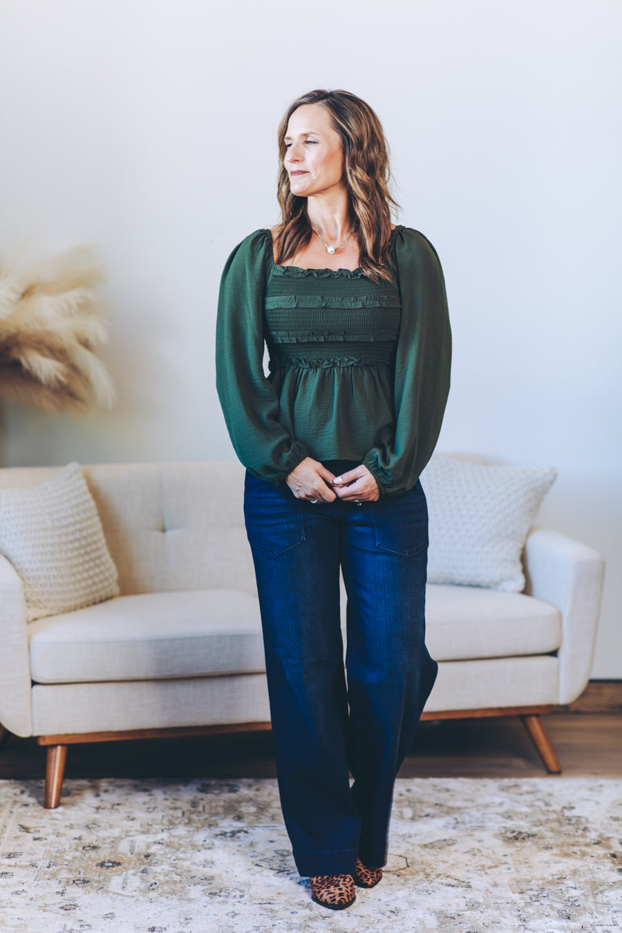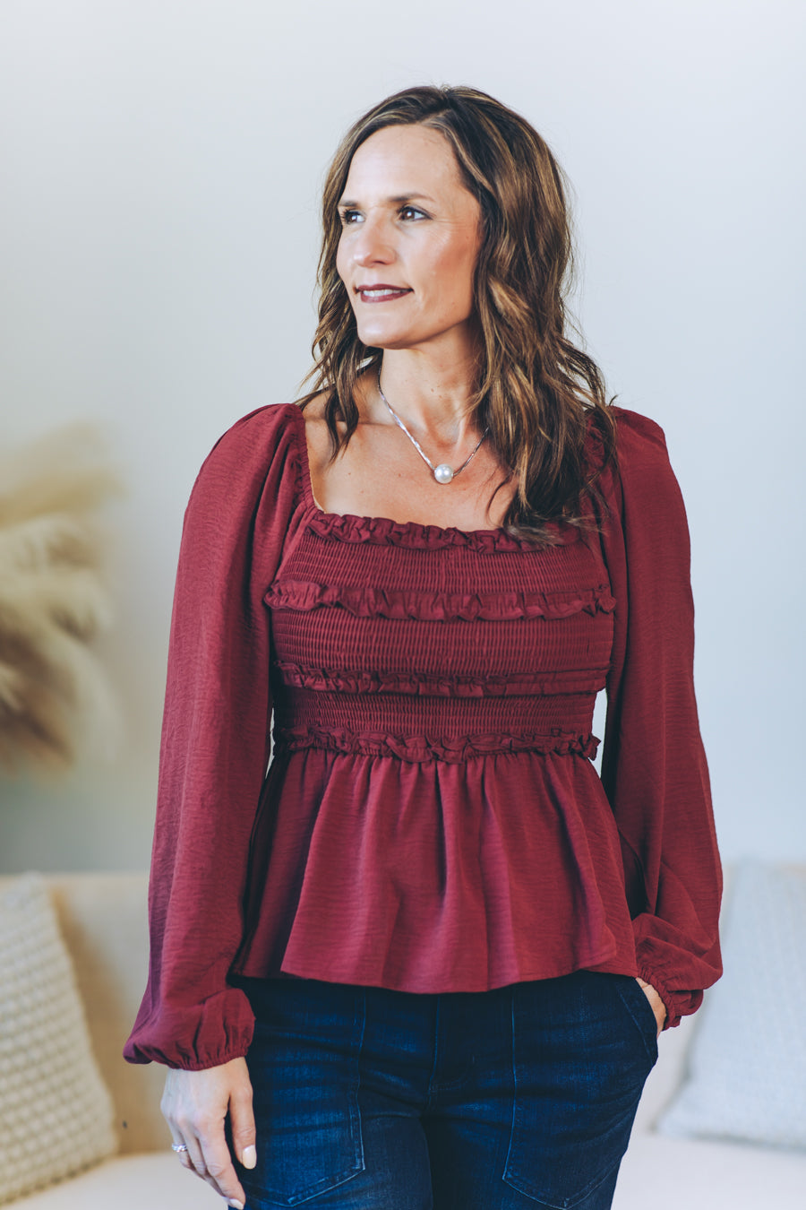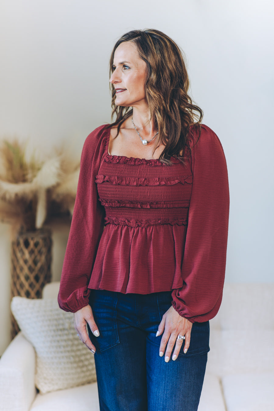 This Convertible Babydoll Blouse offers a playful twist with its off-the-shoulder design and smocked, crinkled woven fabric. Featuring a charming square neckline and delicate mini ruffles at the bust, it effortlessly blends flirty and feminine. The long balloon sleeves add a touch of whimsy, perfectly complementing the relaxed babydoll silhouette for easy, breezy style.