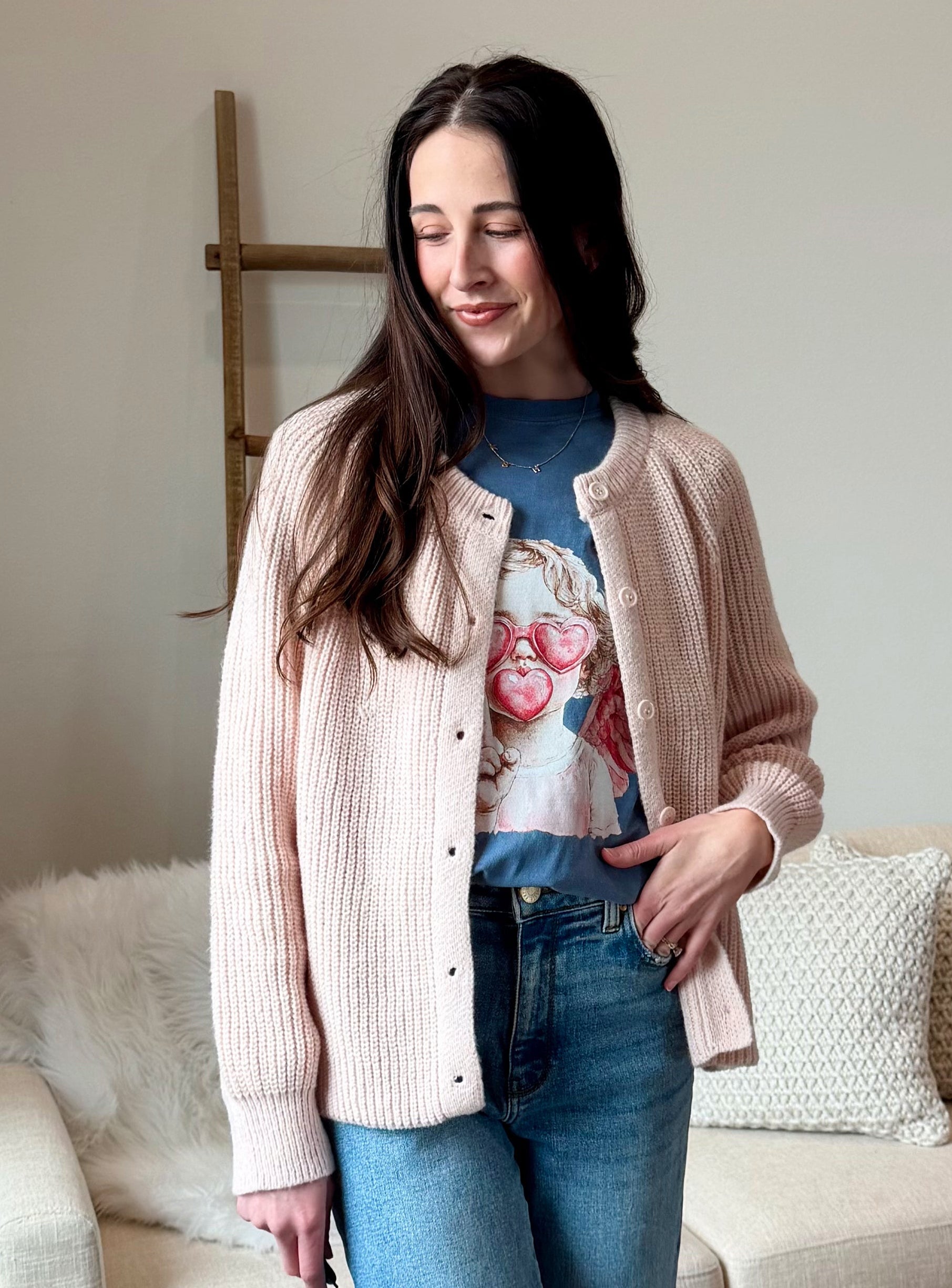 Wrap yourself in warmth and style with our Cozy Ribbed Cardigan! Crafted from soft, chunky knit with a rich ribbed texture, it’s perfect for snuggling up or layering up. The classic crew neckline and full button closure make it easy to wear your way, while raglan sleeves offer comfy, unrestricted movement. Finished with a straight hem that pairs perfectly with your favorite high-rise jeans, this cardigan’s soft stretch feel keeps you cozy all day long. Ready to add a playful touch to your wardrobe? This is your new go-to!