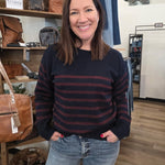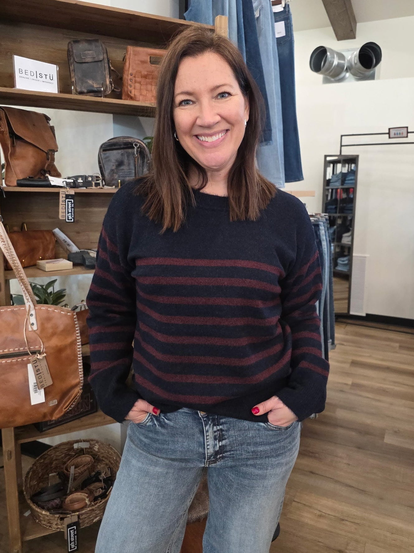 Everyday ease, elevated. With a relaxed drop shoulder fit and bold stripe pattern, this sweater layers seamlessly with denim, trousers, or skirts for versatile styling.