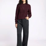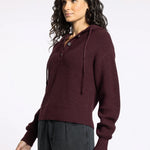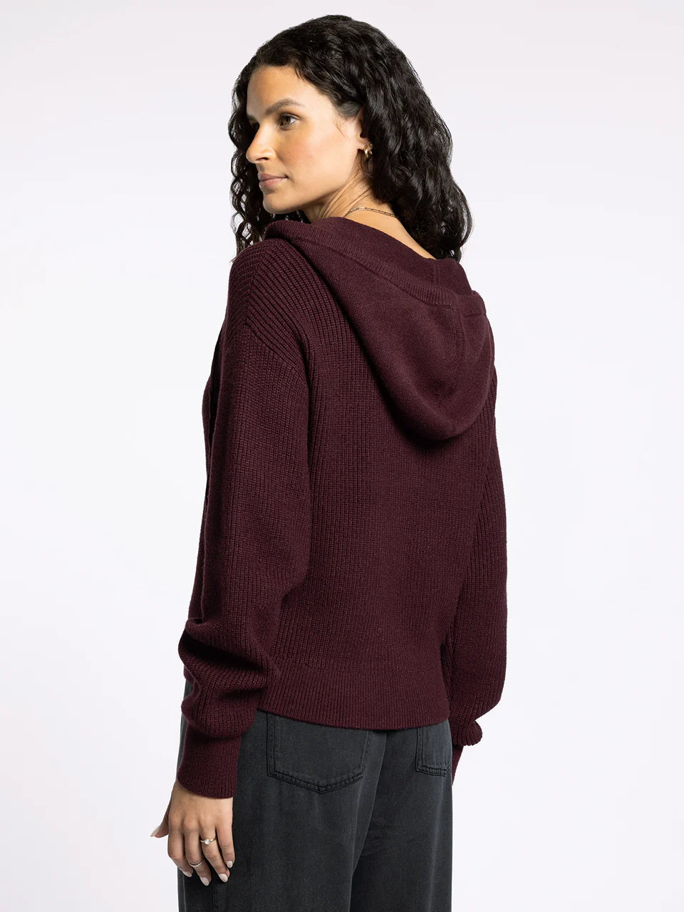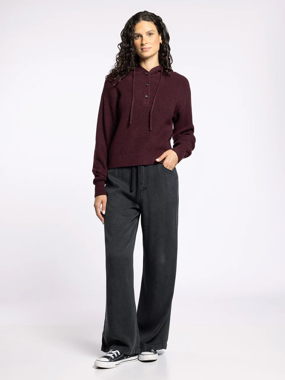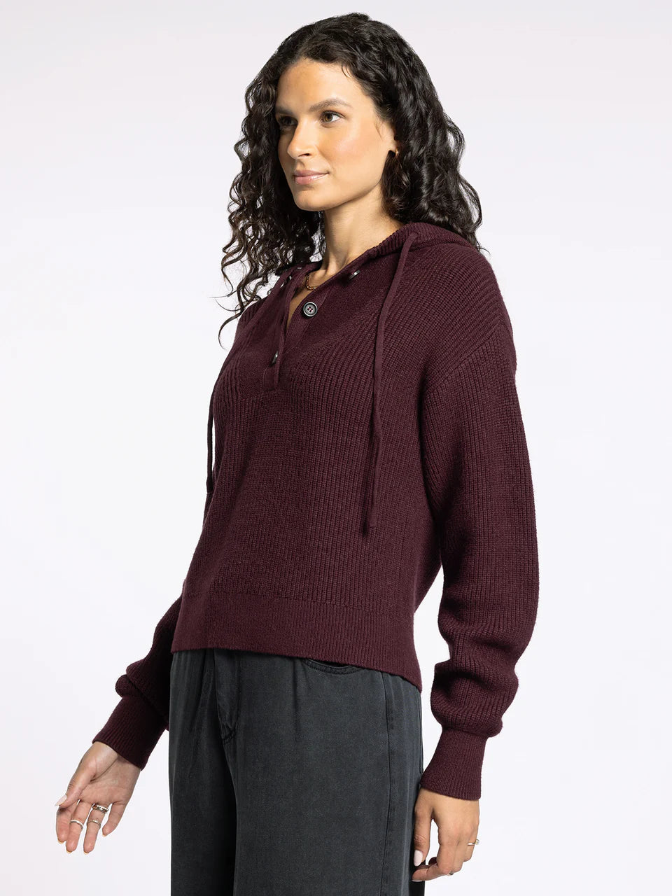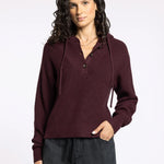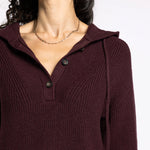 The definition of cozy, this ribbed knit pullover is featured in a slouchy drop shoulder with a half button closure and attached hood.
