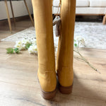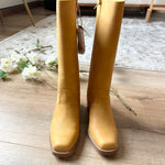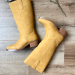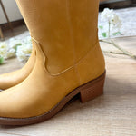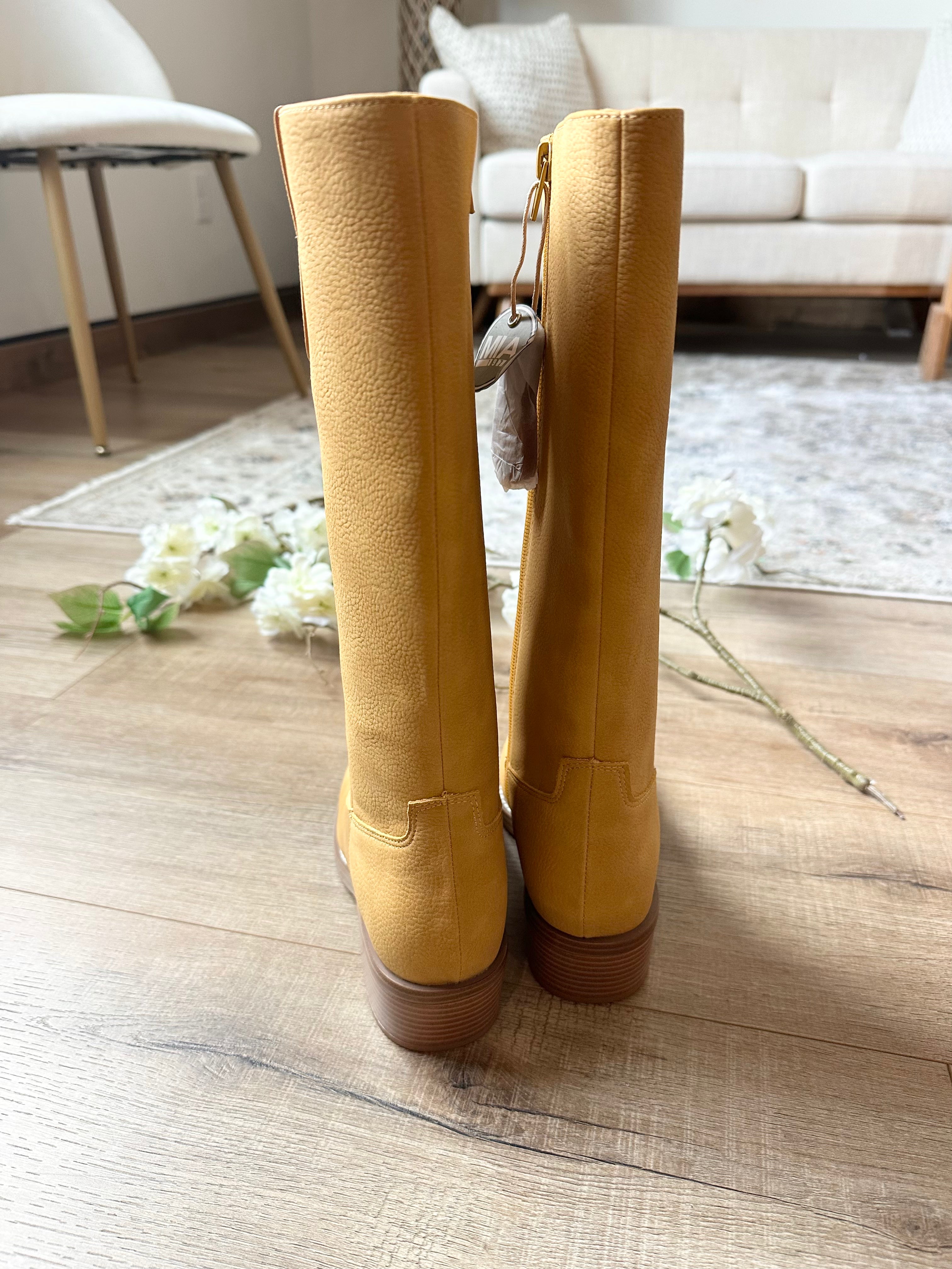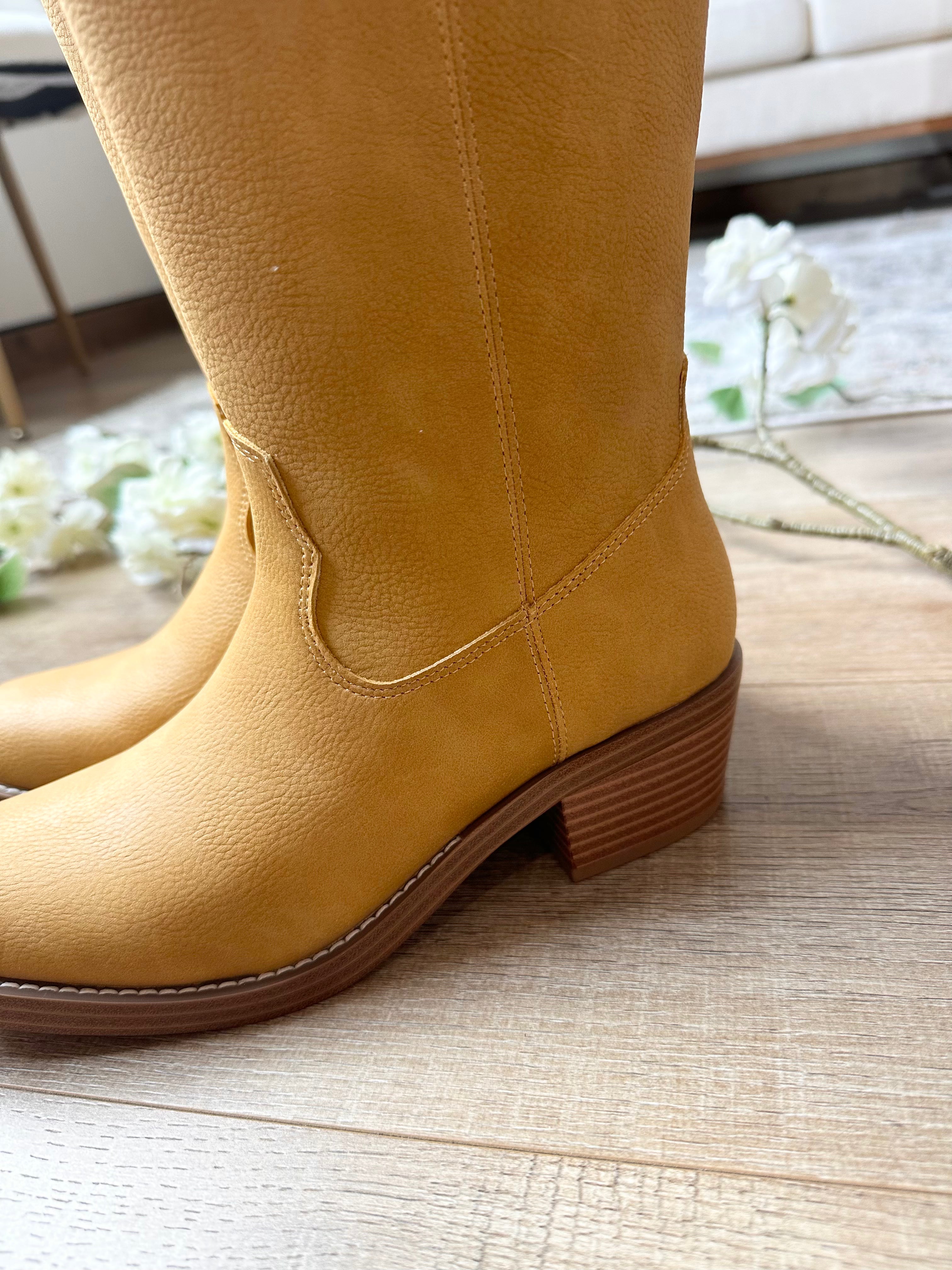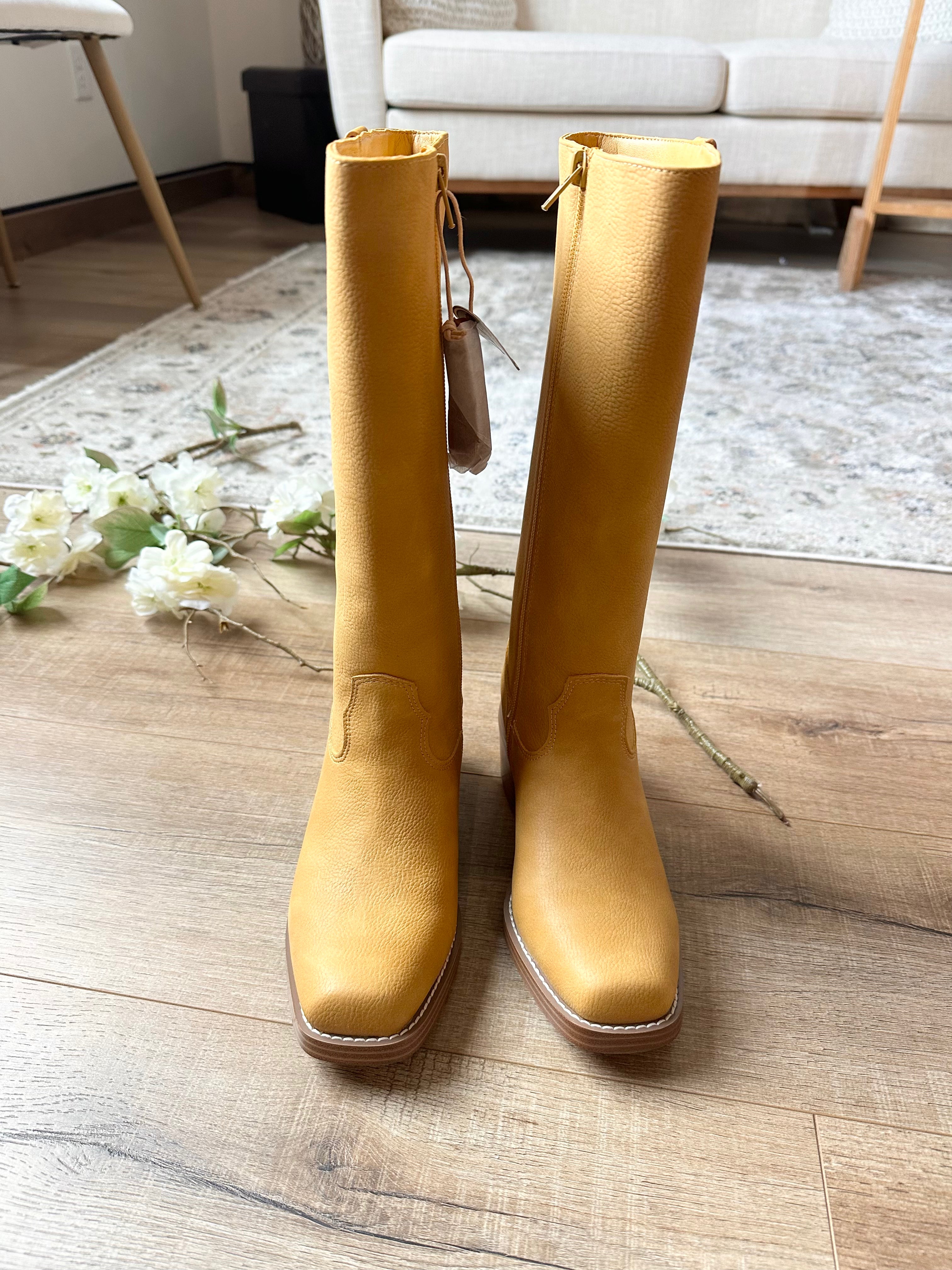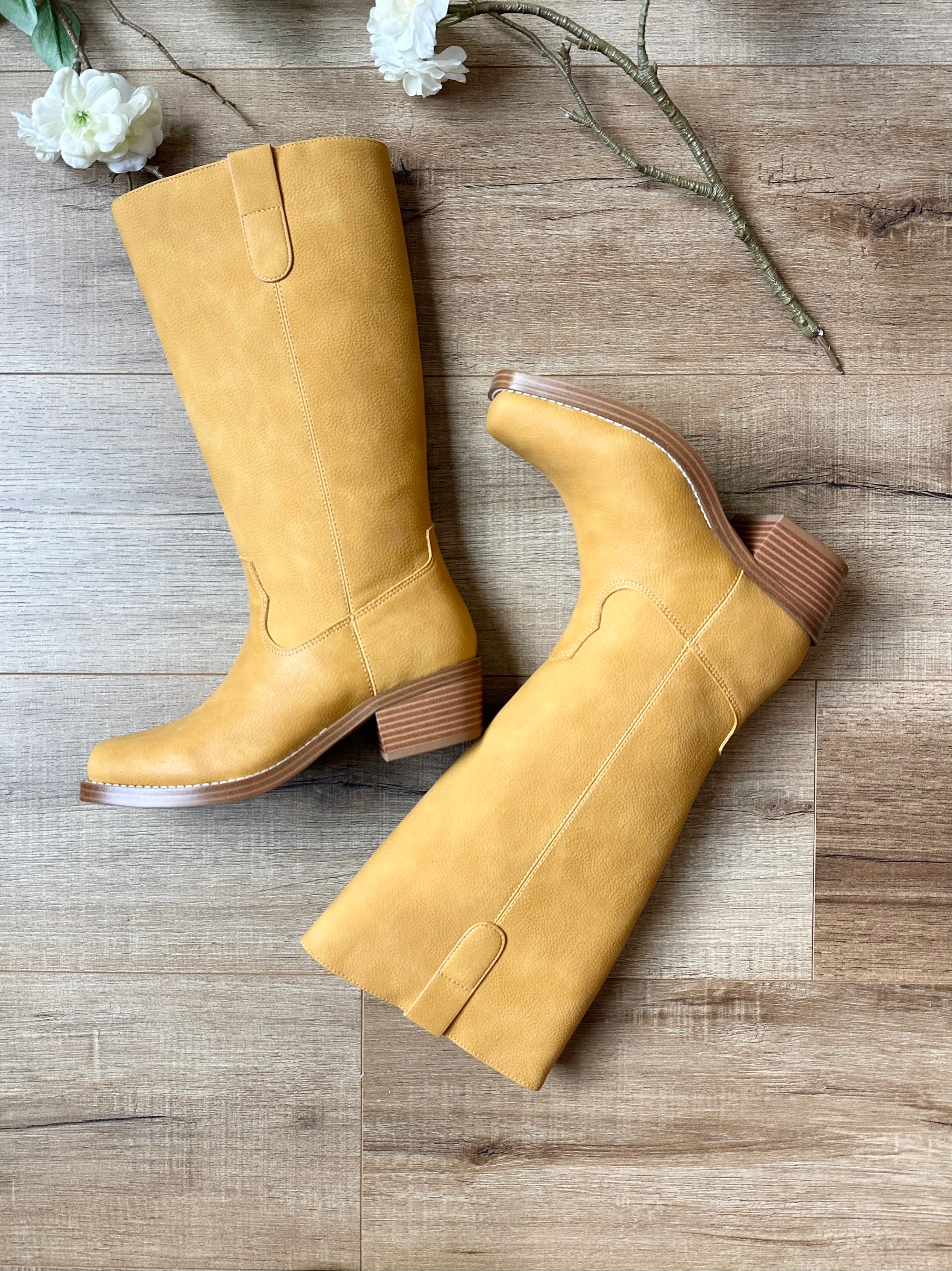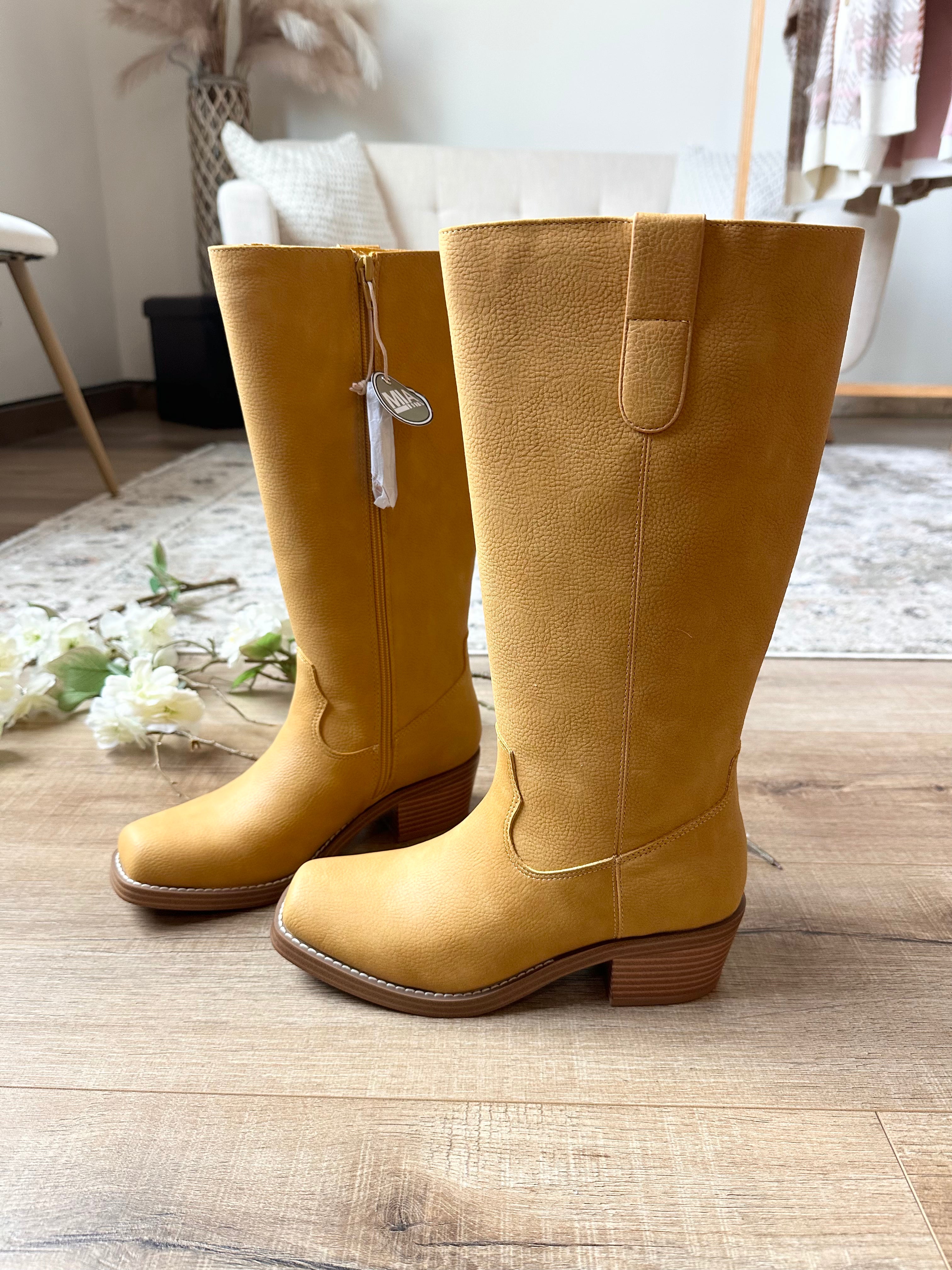 Step into fun with the MIA Duston Banana Boots! These riding-style boots feature a squared toe outlined by bold contrast topstitching, adding a playful twist to a classic look. The side zip makes slipping in effortless, while the low block heel gives you a little lift without compromising comfort. Crafted from synthetic materials, they're ready to keep up with your everyday adventures in style.