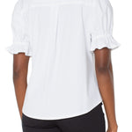 Make a statement with this elbow puff sleeve snap front top from Liverpool Los Angeles, featuring a tech knit fabrication for a modern look. The collared design and button front provide a polished appearance.