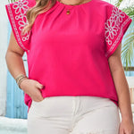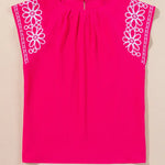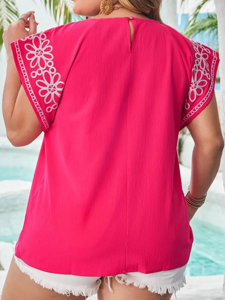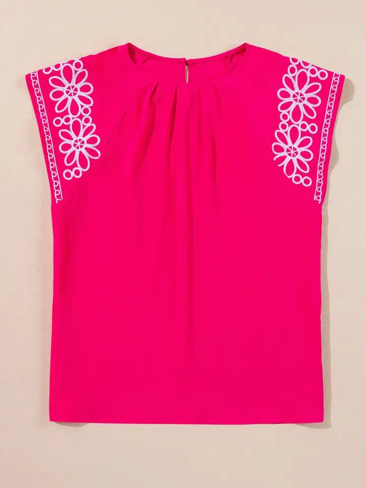 Discover effortless elegance with this embroidered flutter sleeve blouse. Intricate floral embroidery graces the sleeves while short, playful flutter details create a romantic silhouette. Strategically placed pleats throughout add dimension and visual interest to the design. The relaxed O-neck neckline offers a comfortable, universally flattering fit that works beautifully with any face shape, making this blouse a versatile essential for your everyday collection.