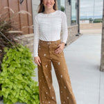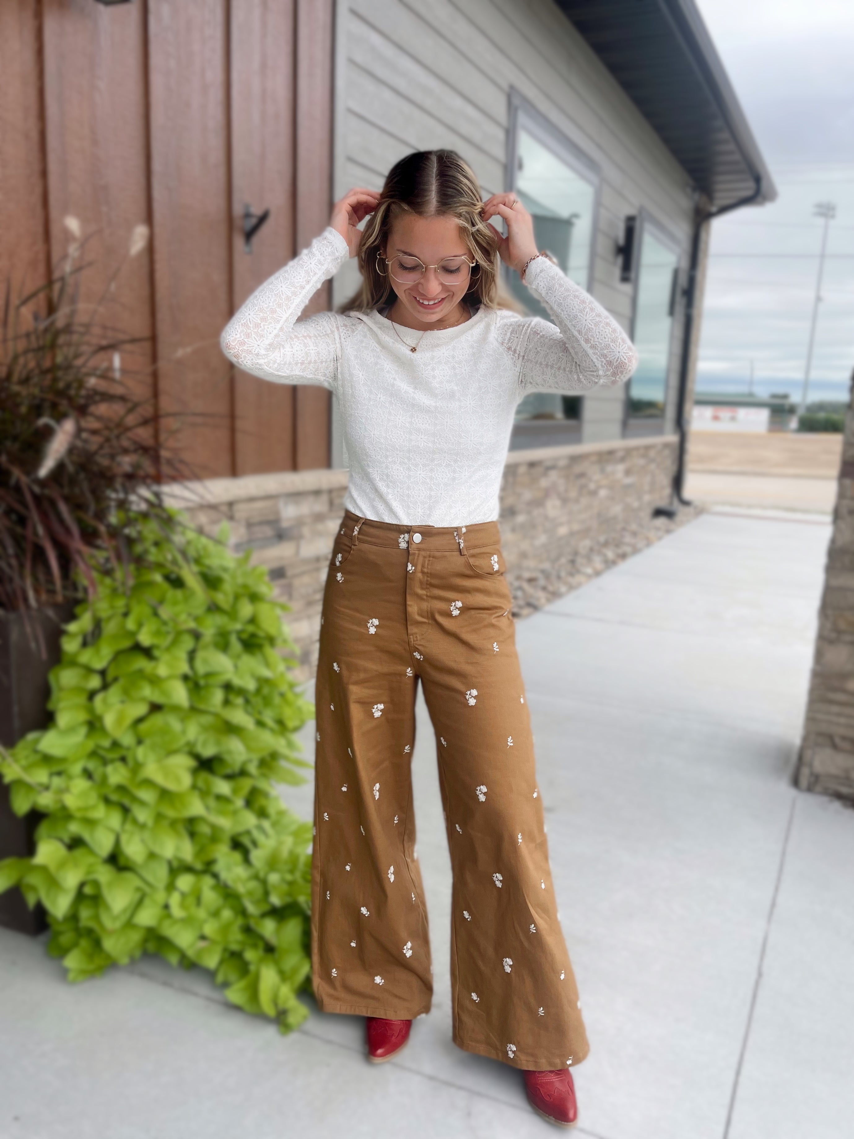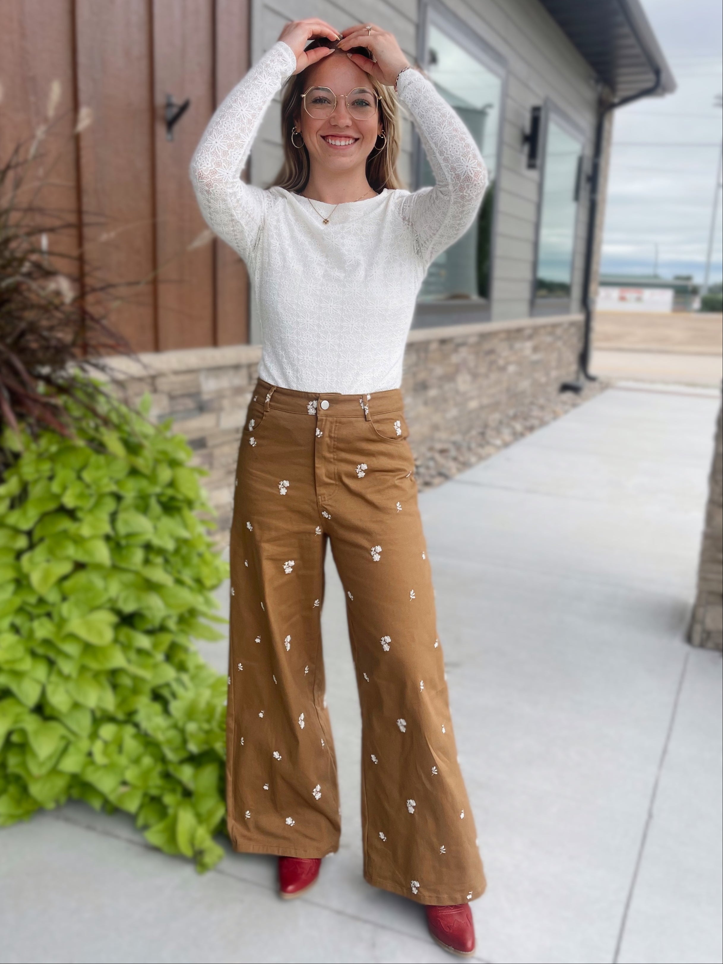 Step into comfort and style with these playful embroidered wide leg pants. Featuring delicate floral embroidery, they add a fun pop of charm to your look. The stretchy fabric moves with you all day, making them perfect for dancing, lounging, or turning heads wherever you go. Embrace effortless cool and flow with the wide leg silhouette that’s as breezy as your vibe.