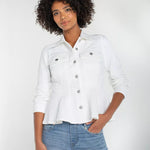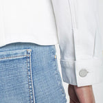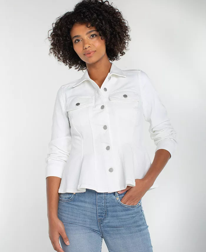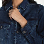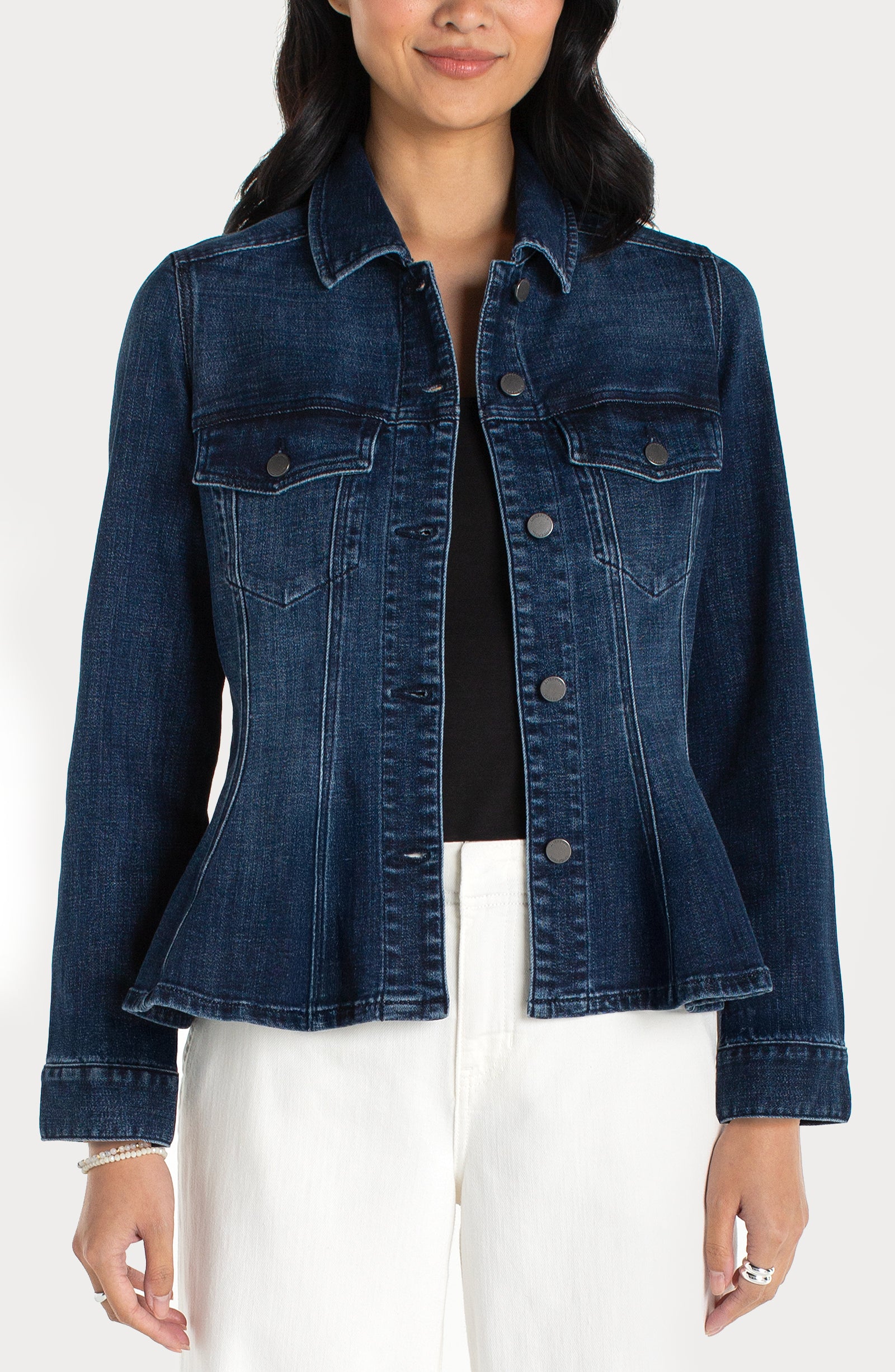 Crafted in Crosshatch denim, the Liverpool™ Los Angeles Fit And Flare Denim Trucker Jacket gets a feminine update with a fit & flare. Its buttoned front closure offers easy wear. This denim jacket is styled with long sleeves, buttoned cuffs, a collared neckline, and a straight hem. Polished yet easy, this button-down jacket is the perfect layer to pair with denim or trousers.
