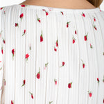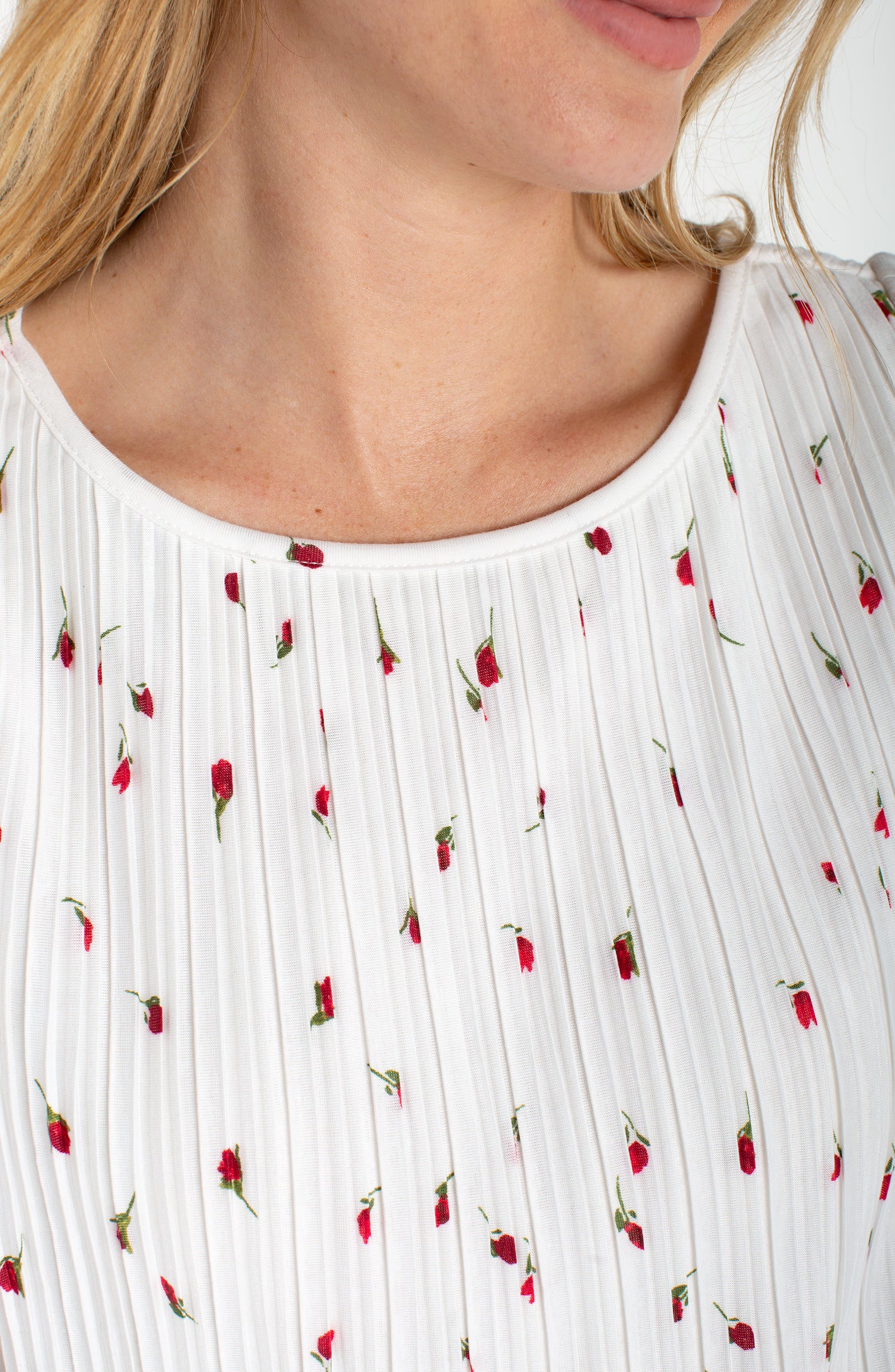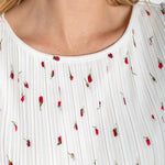 Brighten your wardrobe with this charming knit top featuring a playful floral print and flattering boat neckline. The pleated detailing adds dimension and movement, while delicate flutter cap sleeves create an effortlessly feminine silhouette. Perfect for layering or wearing solo, this versatile piece transitions seamlessly from casual days to weekend outings. Crafted from quality Liverpool fabric for comfort and durability.