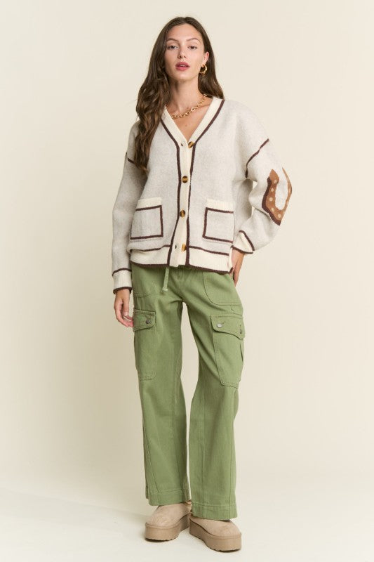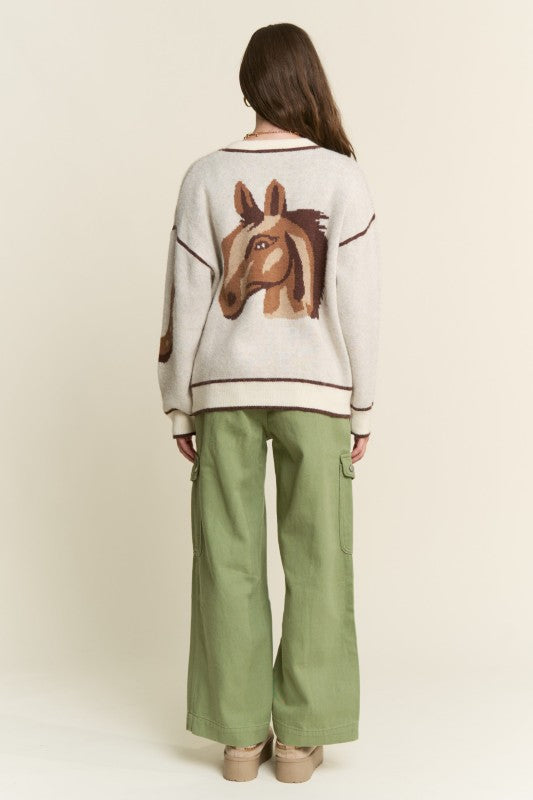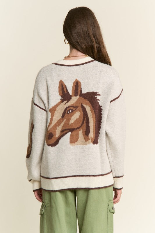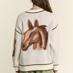 Saddle up in style with our Giddy Up Button Down Cardi—a playful take on classic Western wear. This women's cardigan features a flattering V-neckline, convenient front pockets, and eye-catching horse design across the back. Don't miss the adorable horseshoe details on the elbows for that extra touch of equestrian charm. Perfect for ranch days or casual outings, this piece brings personality and comfort together in one fabulous package.