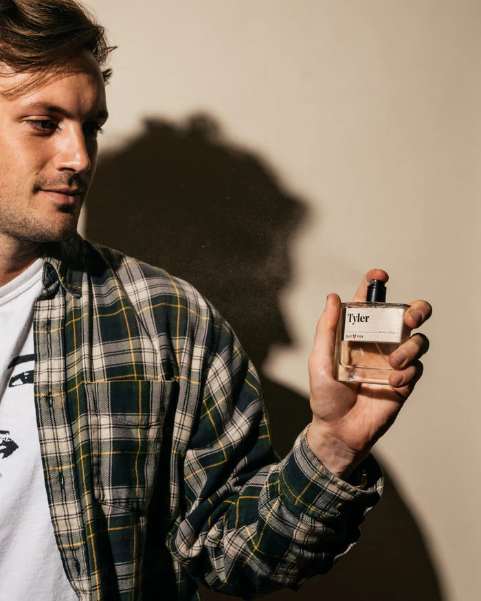 The real-life Tyler was essential to our early success working out of a an apartment in San Francisco. From being a guinea pig testing potential fragrances to filling sample bottles, Tyler only ever asked for merch and Coors Light in return. Glad we could pay homage to the legend himself.