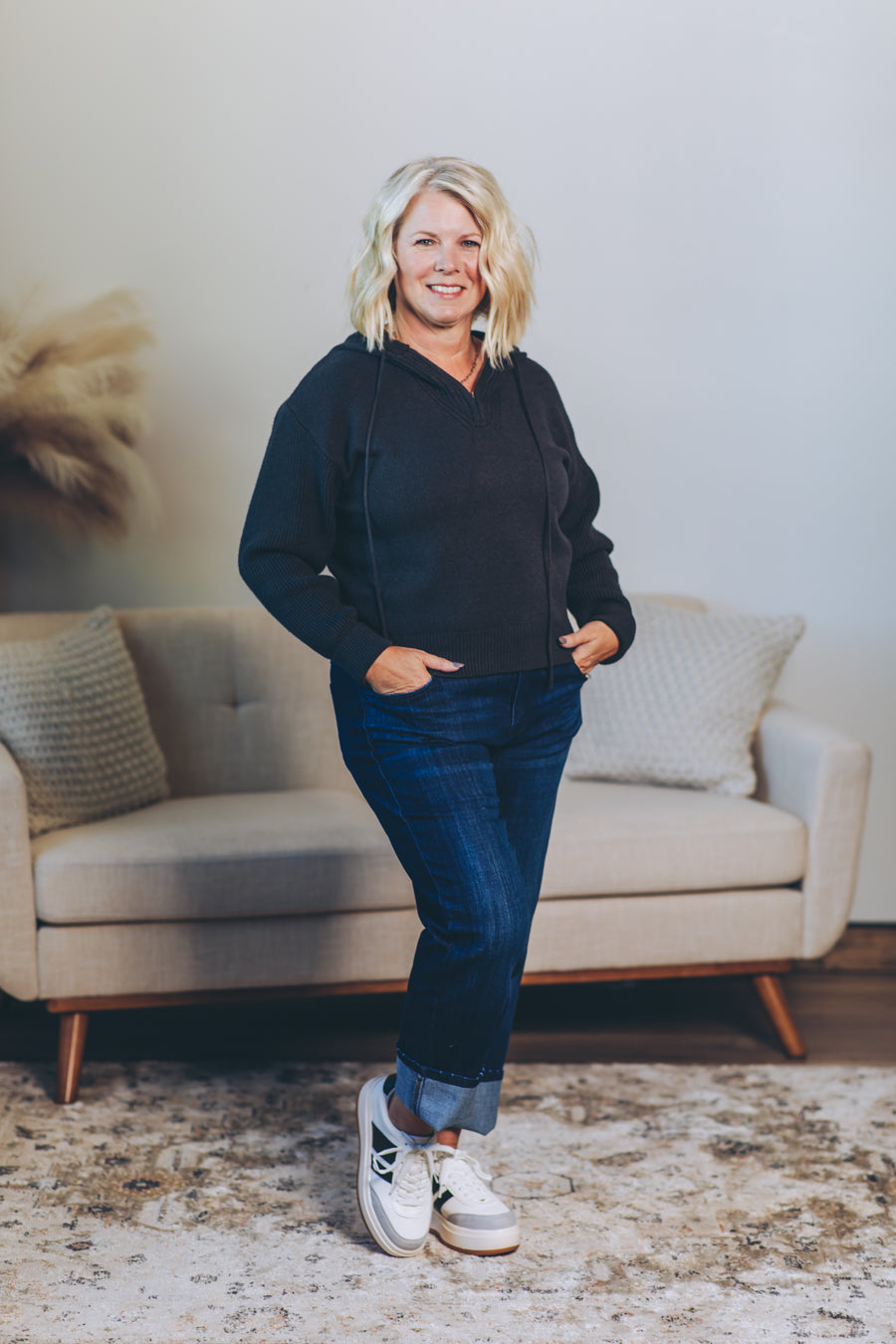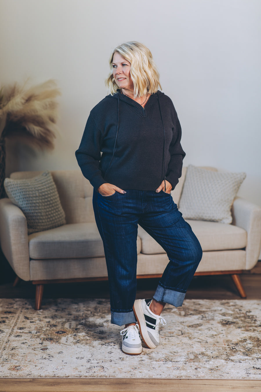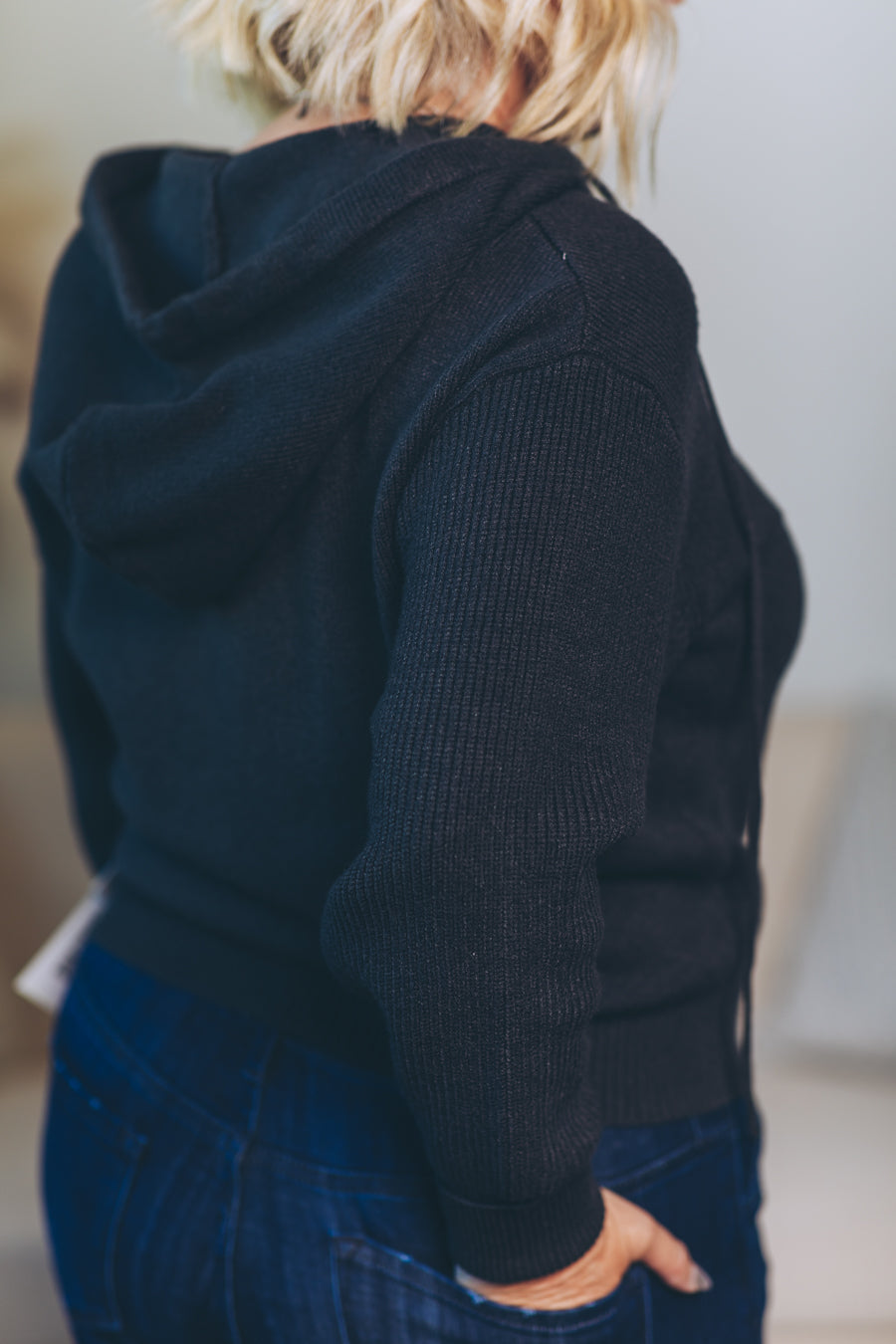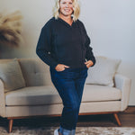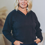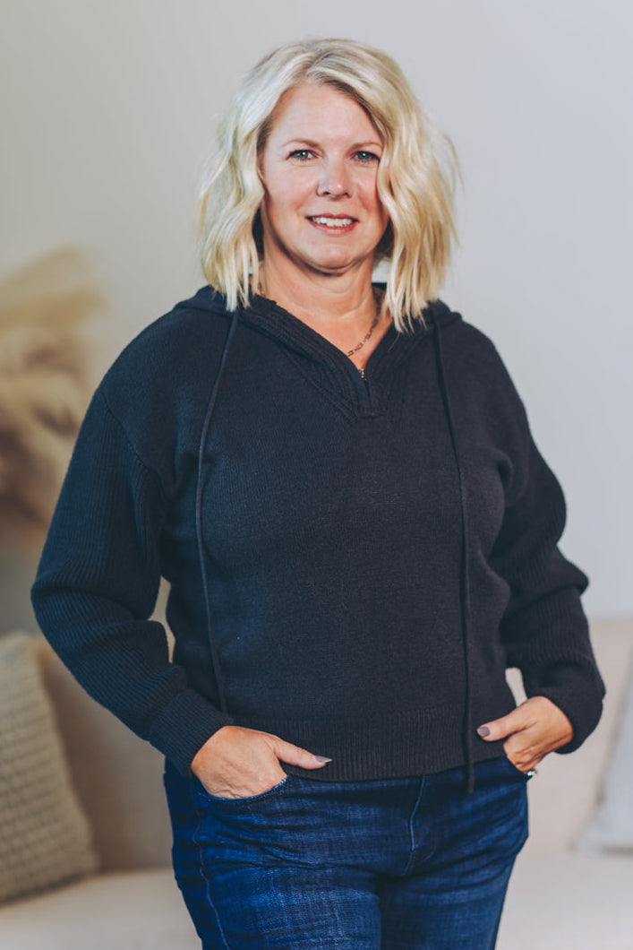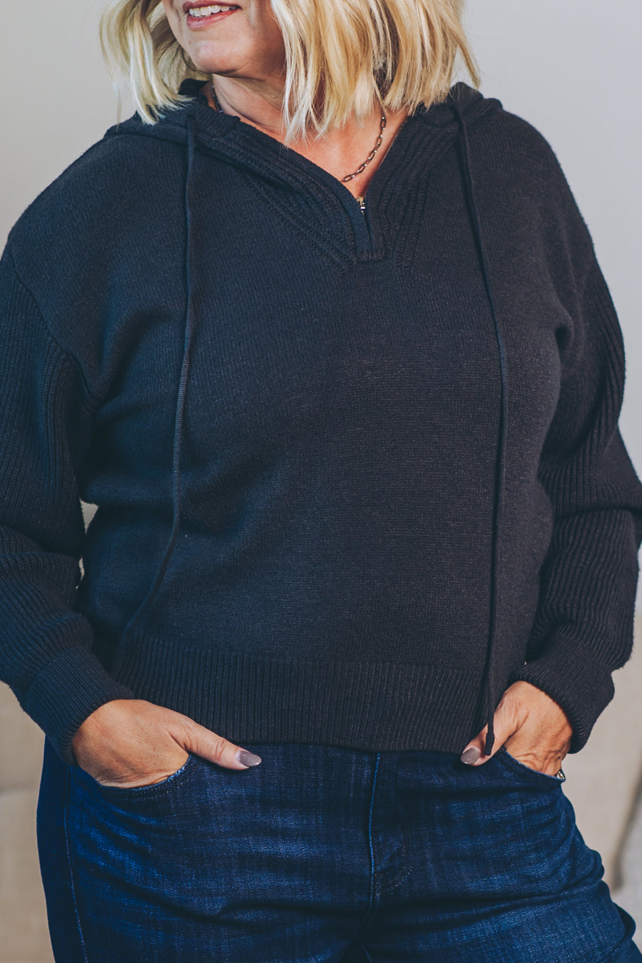 Stay cozy and cool with this hooded half zip sweater designed just right — slightly cropped for a fun, flirty fit. Perfect for layering or wearing solo, it adds a playful twist to your everyday look. Zip up or leave it loose; either way, comfort and style are guaranteed.