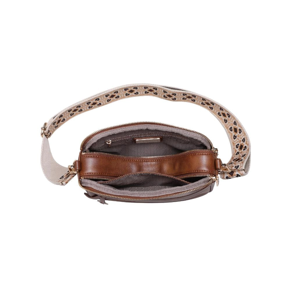 This chic crossbody, crafted from smooth vegan leather, is a versatile accessory with a touch of flair. The exterior features a playful tassel keychain and both front and back zip pockets, complemented by an embroidered adjustable strap and a vegan leather adjustable strap. Inside, the printed fabric lining houses two separate compartments, a zip pocket, and a slip pocket, making it as functional as it is stylish.
