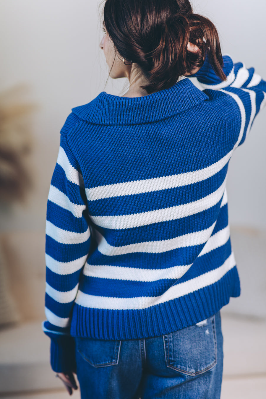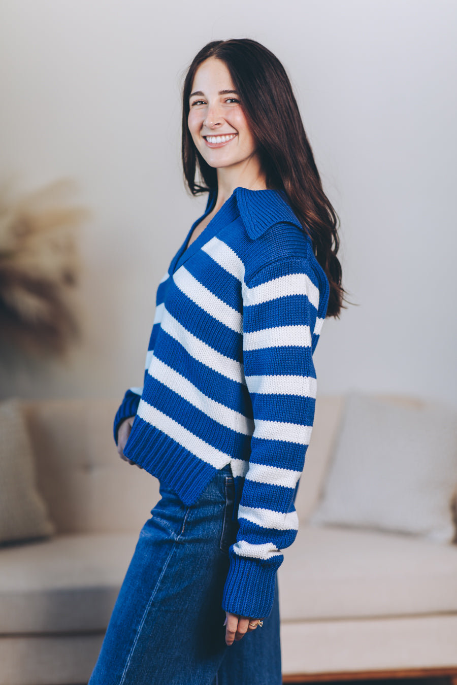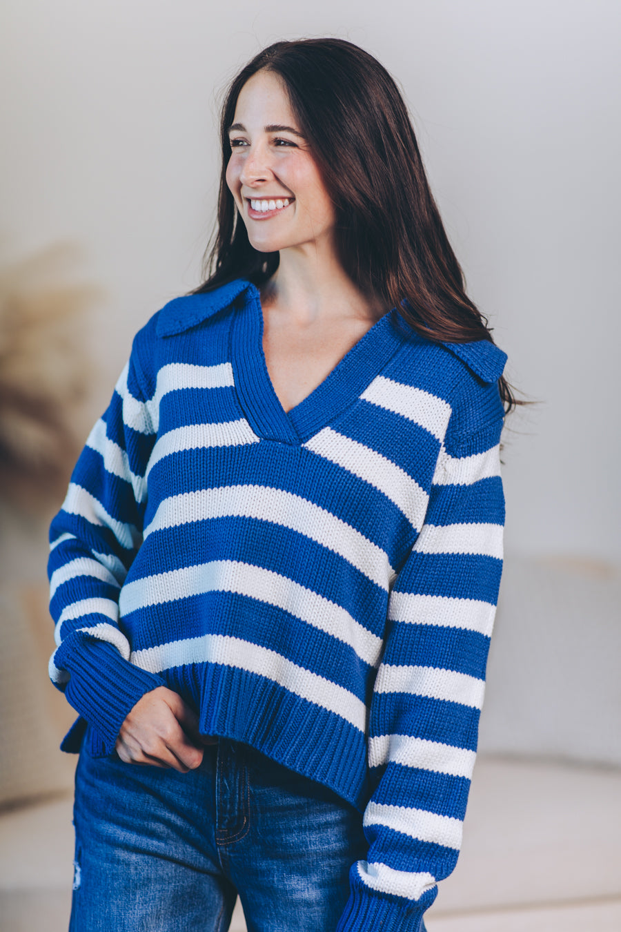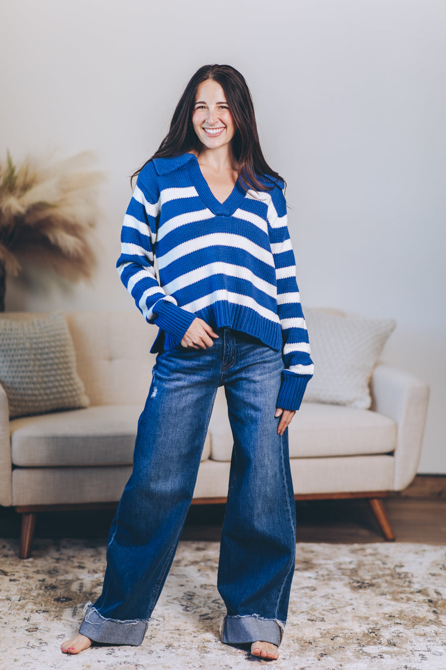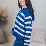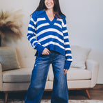 Cozy up with the Hayley Pullover, your new favorite striped sweater! Crafted from a soft cotton-acrylic blend, it features a flattering V-neck collar and playful side slits that add a breezy twist to your look. Perfect for layering or wearing solo, this long-sleeve top brings a splash of fun and comfort to any outfit.