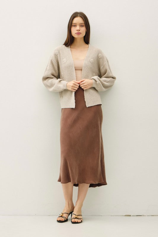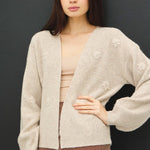 Embrace cozy style with the In Bloom Sweater Cardigan, featuring an open front and a relaxed loose fit. Crafted from a soft wool blend, it offers warmth without sacrificing comfort. The playful drop shoulder and voluminous sleeves add a whimsical touch, while delicate daisy motif embroidery appliques bring a fresh, cheerful vibe to your everyday look. Perfect for layering on cooler days with a fun, flowy flair.