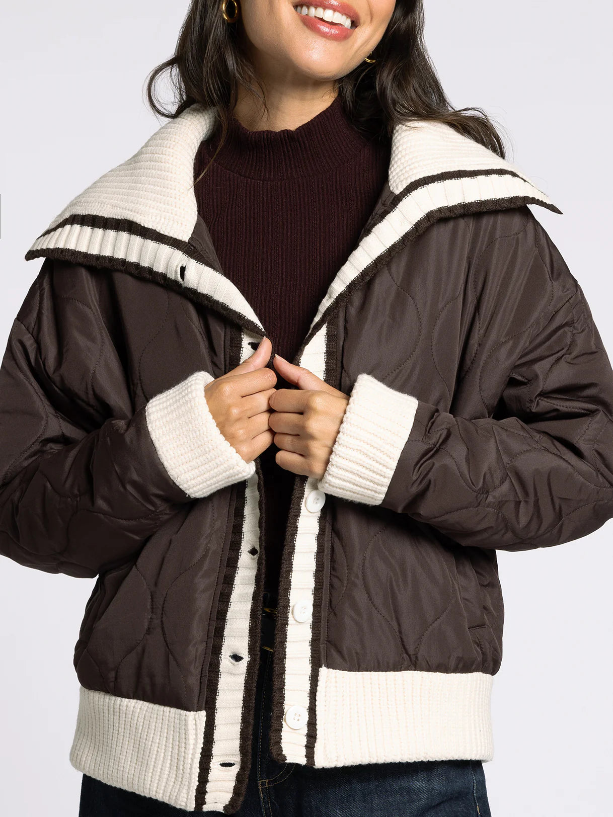 Stay cozy and stylish in the Jordette Jacket by Thread & Supply. This quilted jacket features comfy knit details and a wide collar that adds a fun twist to your look. With a full button front closure, it’s easy to layer up or down for any adventure. Perfect for those who love warmth with a dash of flair!