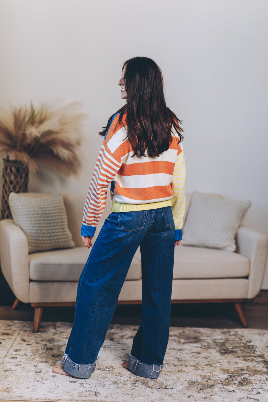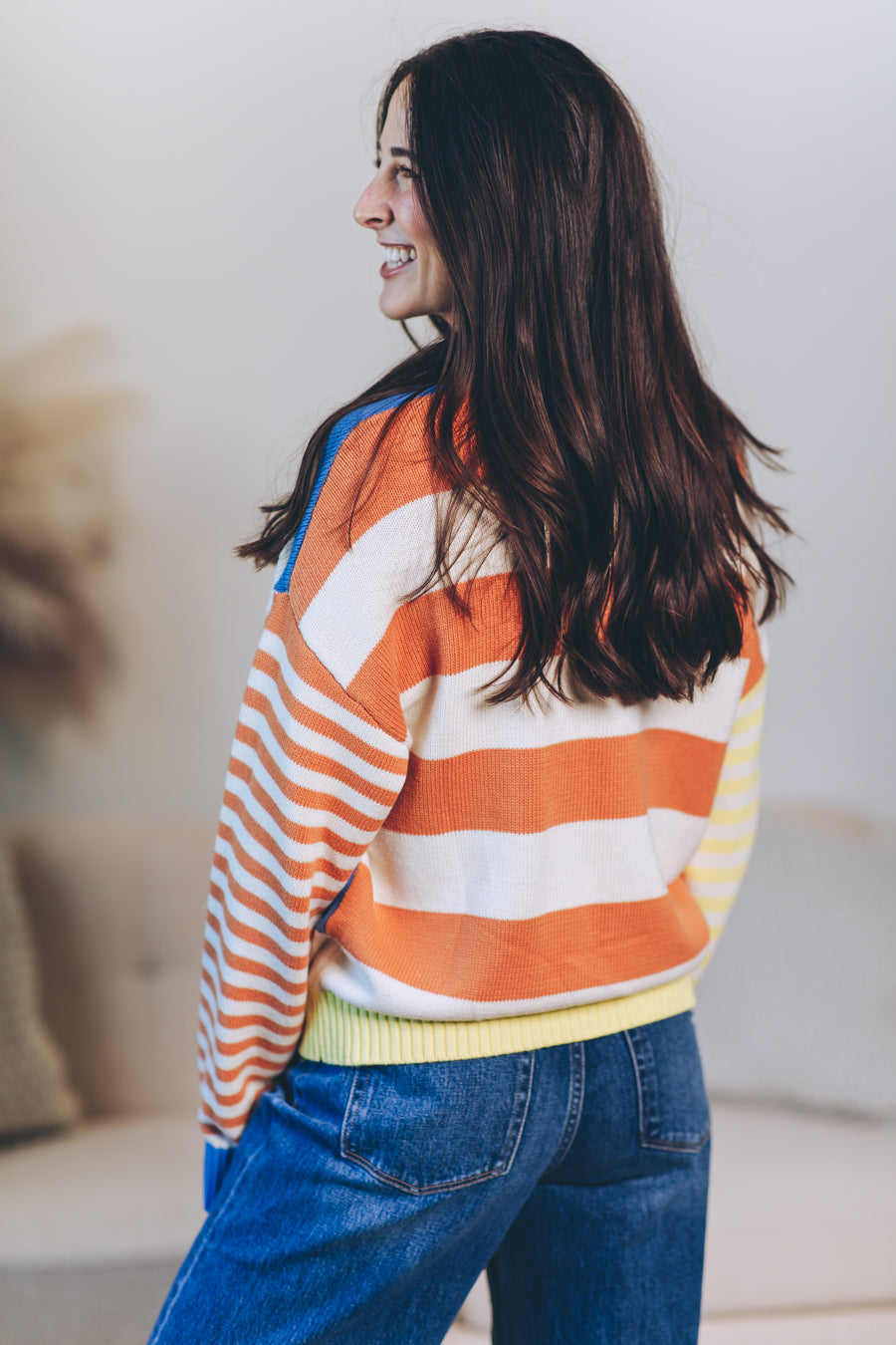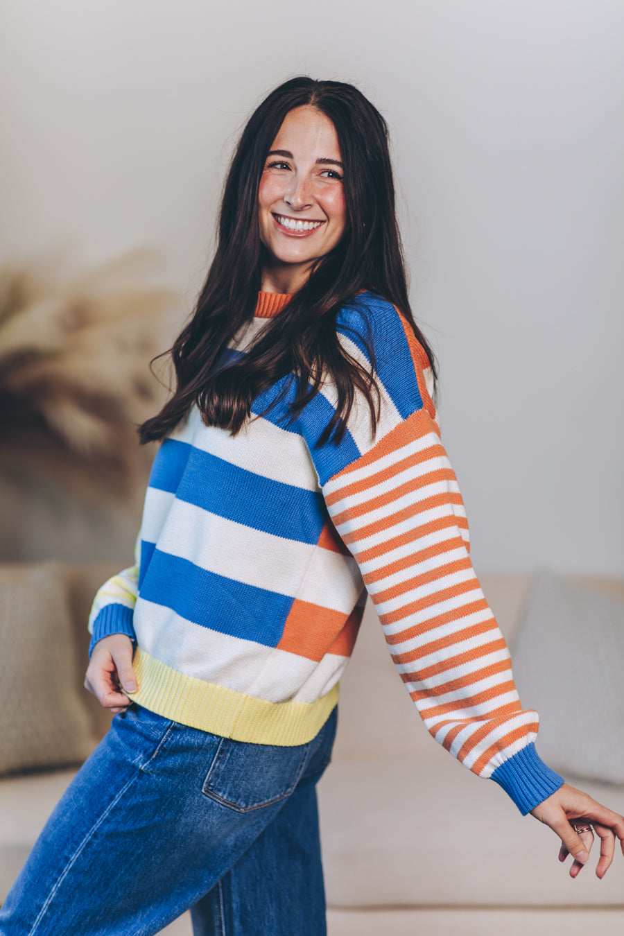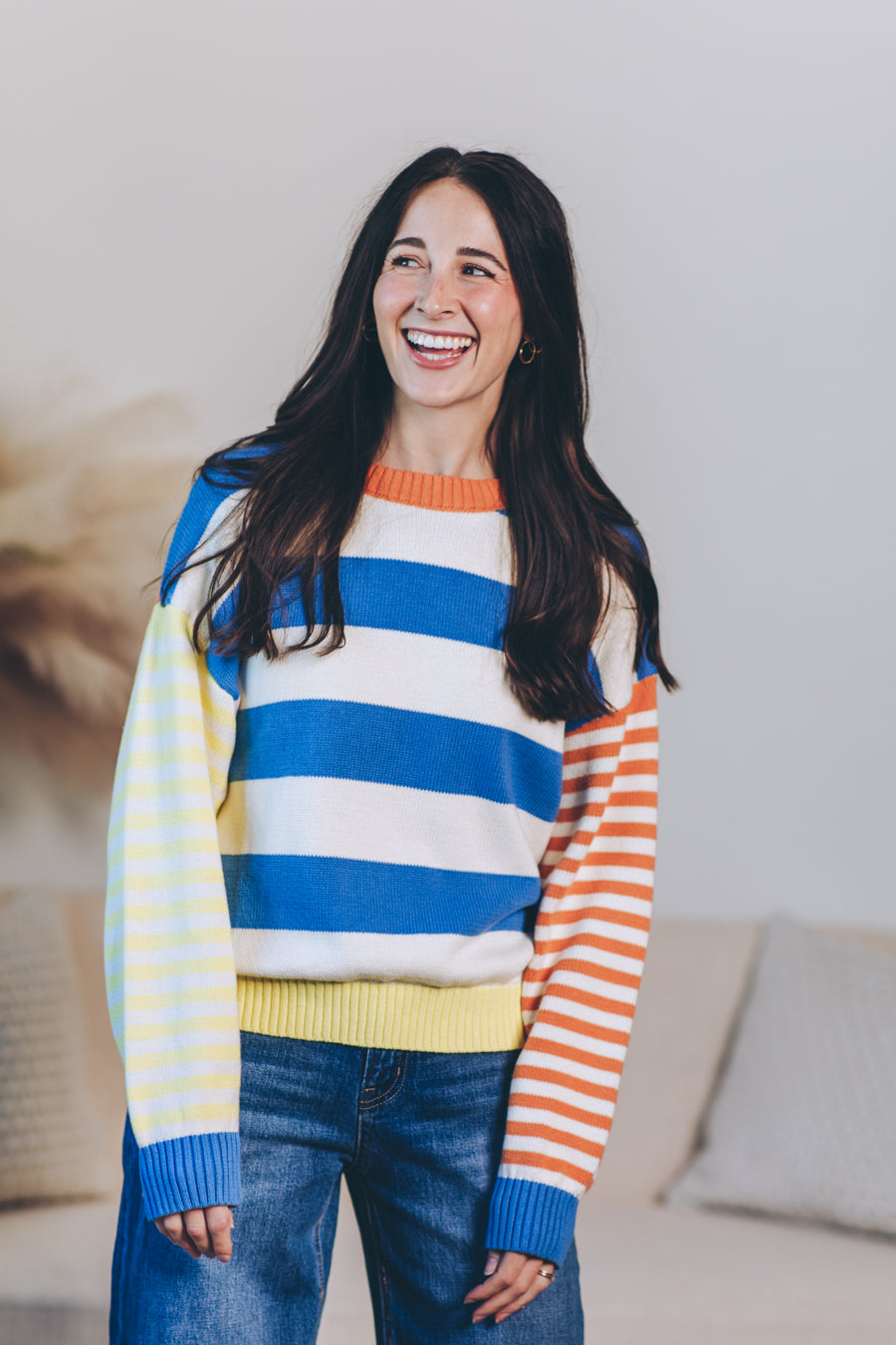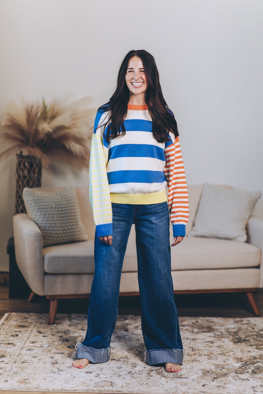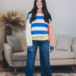 Get ready to turn heads in this vibrant striped sweater that's anything but boring. Bold horizontal stripes pop with personality, while contrast detailing at the cuffs and hem adds an extra layer of visual interest. Perfect for anyone who refuses to blend in, this piece brings instant energy to your everyday rotation. Mix it with solids or go full pattern mode—either way, you'll be radiating confidence and fun.