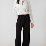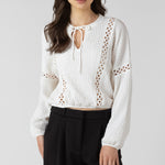 Elevate your everyday style with this stunning textured blouse featuring delicate lace inserts that add an instant touch of elegance. The charming front tie keyhole neckline creates a flattering focal point, while strategically placed elastic details ensure a comfortable, personalized fit throughout the day. Perfect for dressing up or down, this piece brings sophistication and playful flair to any wardrobe.