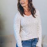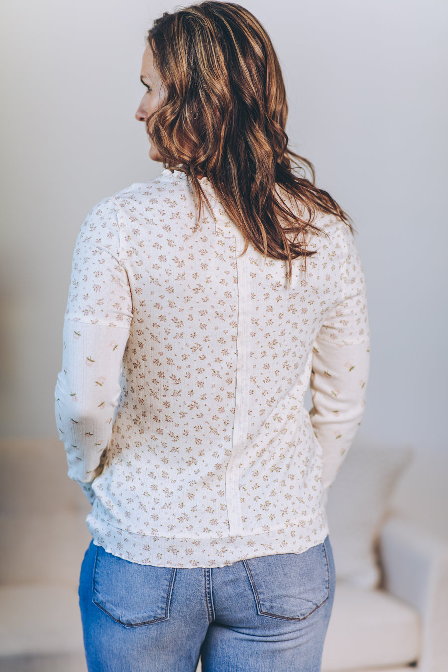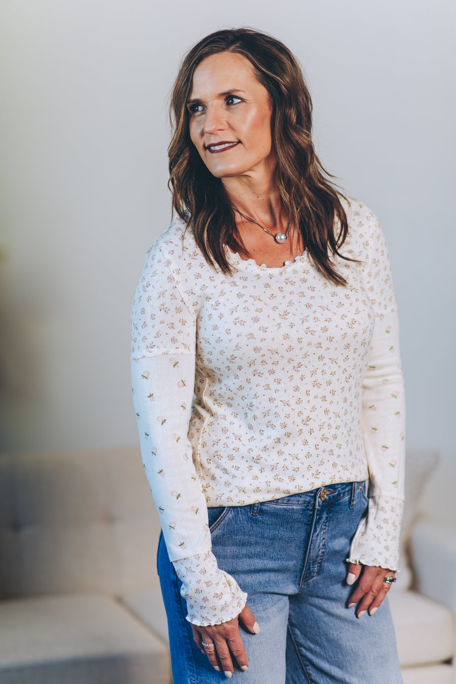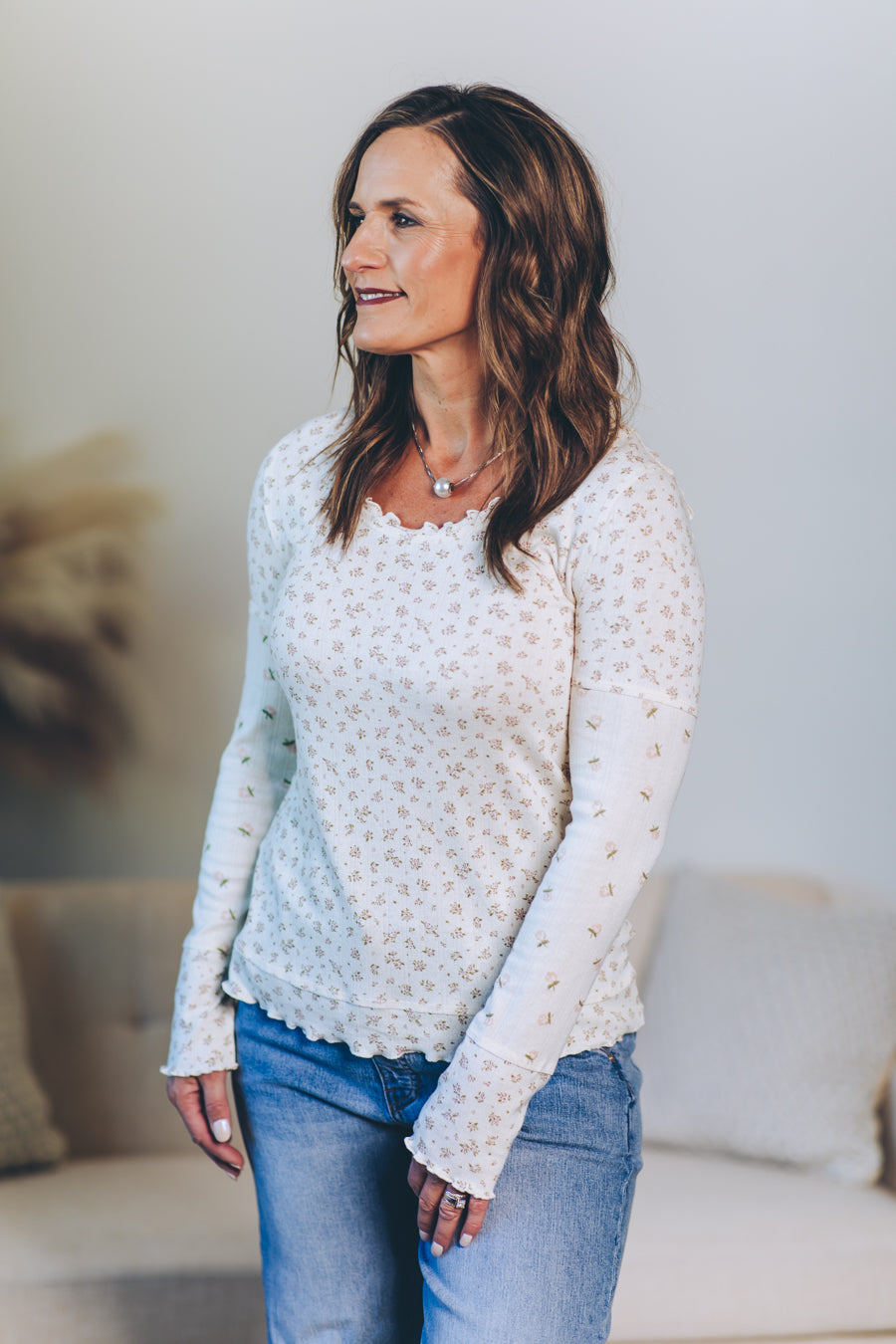Add a fresh burst of charm to your wardrobe with this Lettuce Hem Floral Knit Top. Featuring a delicate floral print, a flattering fitted silhouette, and fun lettuce-edge hems, it’s perfect for layering or wearing on its own. The round neck and long sleeves keep it cozy while the playful design adds a touch of whimsy to any outfit.