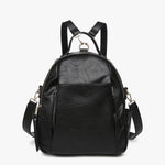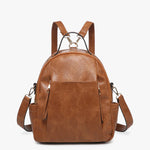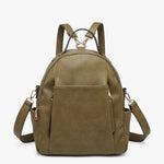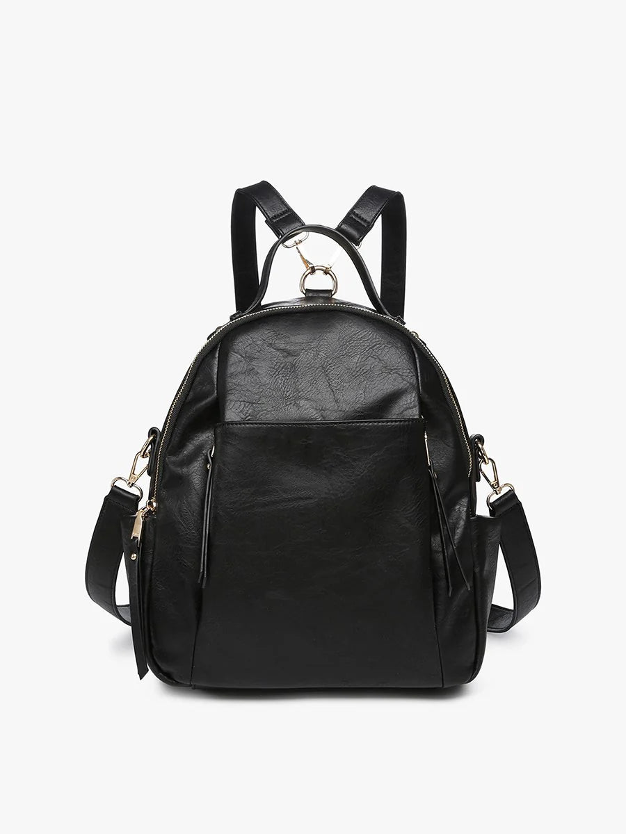 This backpack does it all! Lillia is a convertible style that can be worn like a traditional backpack or as a shoulder bag. It features plenty of places to store your belongings: a large main compartment, a front snap pocket, a dual zip pocket,side zip pockets, and a back zip pocket. It includes an adjustable/removable strap, and the backpack straps are adjustable. Made of vegan leather.