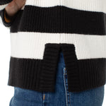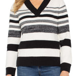 This V-neck sweater blends classic stripes with a contemporary twist, knit in a rich rib yarn with a cream and black mélange effect. The subtle texture adds depth, while the relaxed fit and open neckline keep it effortlessly polished. Lightweight yet cozy — it's the perfect layer to dress up or down, season after season.