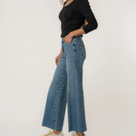 These high-rise wide leg jeans in a classic medium wash feature Fab Ab pockets for a smooth, flattering fit and stretchy fabric for all-day comfort. A raw hem and a hint of distressing give them a lived-in feel with a modern edge. Effortless and versatile, they’re your new go-to for casual cool.