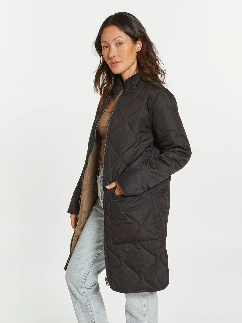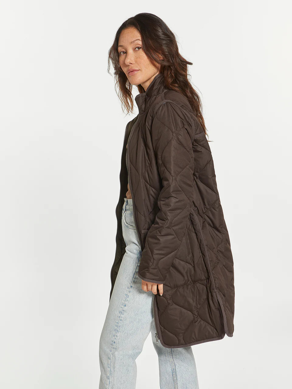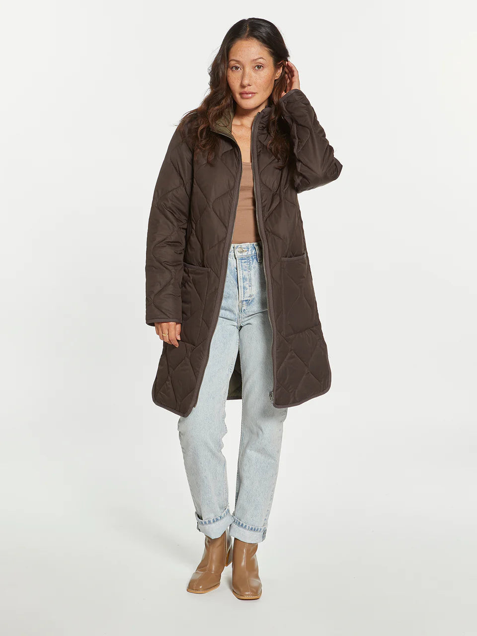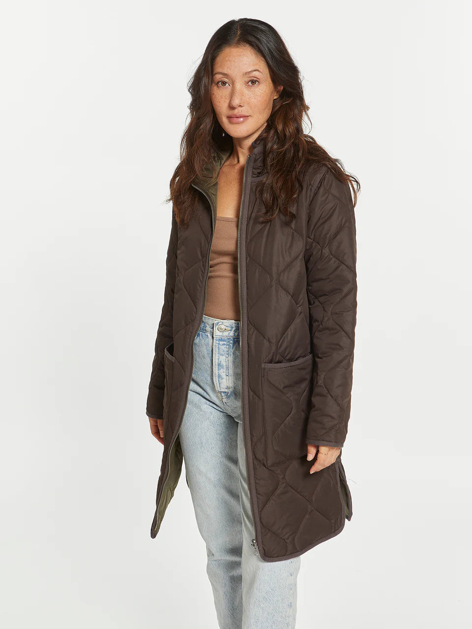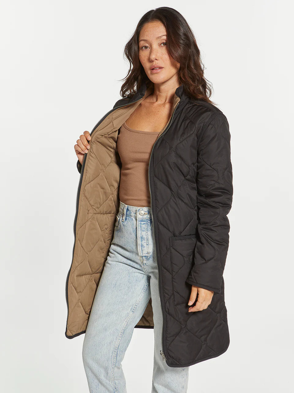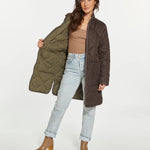 Two coats in one with this long-lined reversible puffer coat. This classic puffer can handle any type of weather! Featuring a zip front closure, dual side box pockets and side vents.
