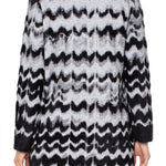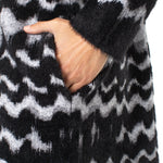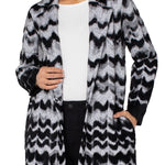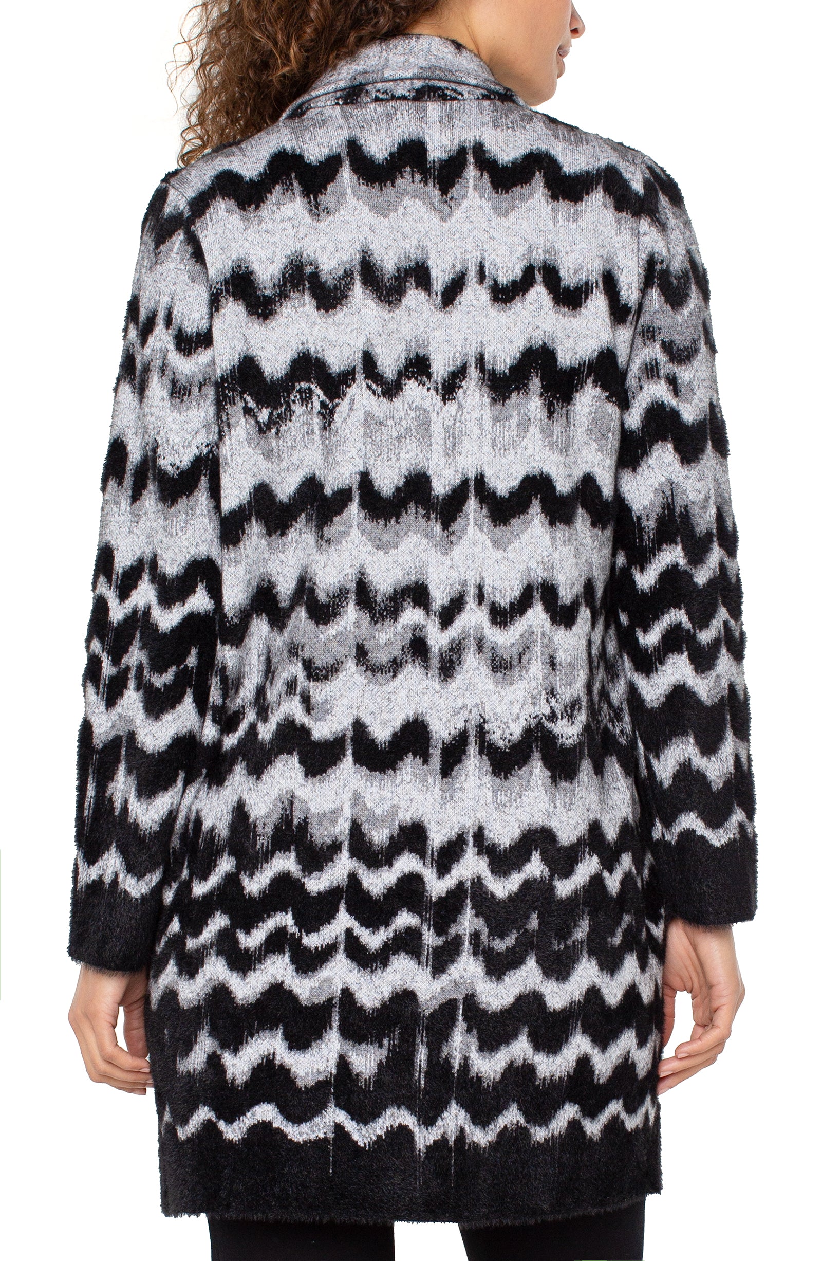 In a black chevron print, this open-front coatigan is the perfect balance of structure and comfort. Designed with a double notch collar and clean seam pockets, it drapes effortlessly over knits, denim, or tailored layers—your go-to for cozy, pulled-together days.