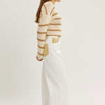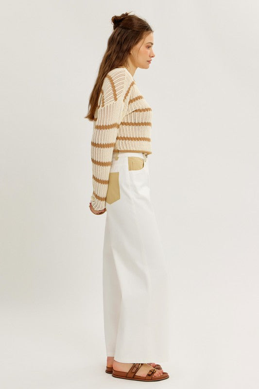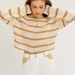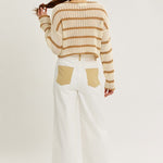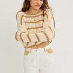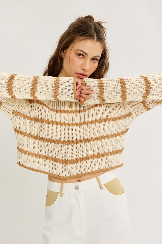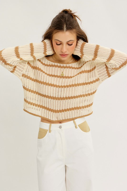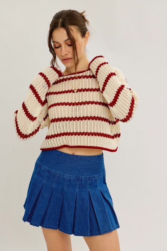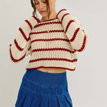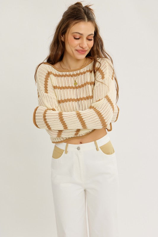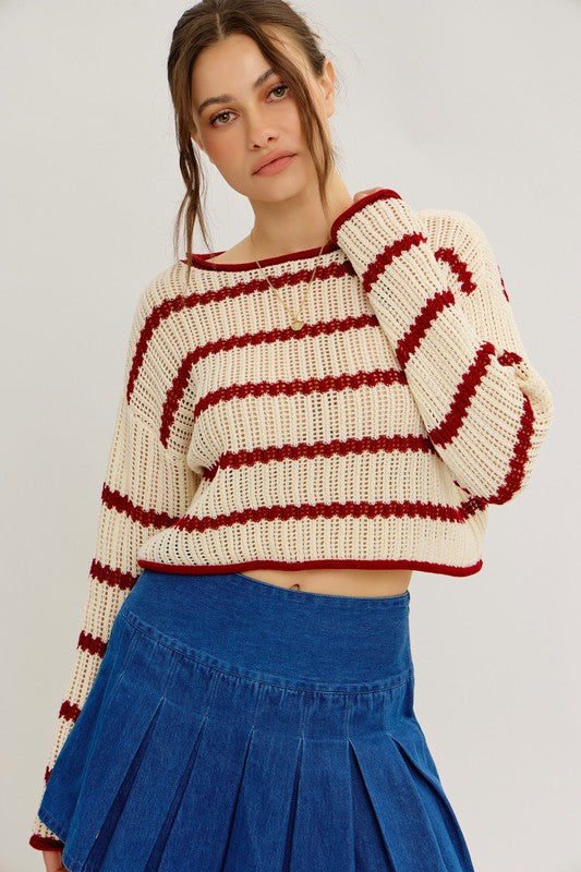 Get cozy with a playful twist in this Open Knit Cropped Sweater. Featuring a relaxed, loose fit and airy open knit design, it’s perfect for layering or wearing on breezy days. The wide round neck and contrasting details at the neck and hem add a fun pop of style, while subtle stripes keep things lively. Embrace effortless comfort and charm wherever you go!