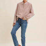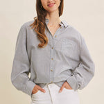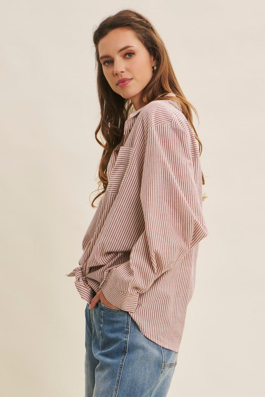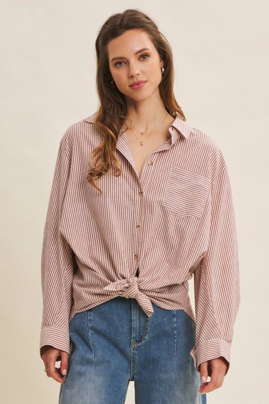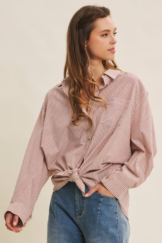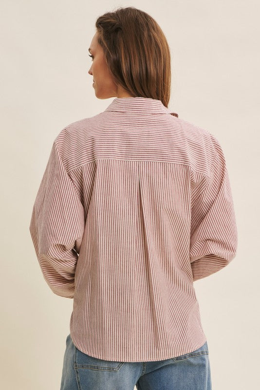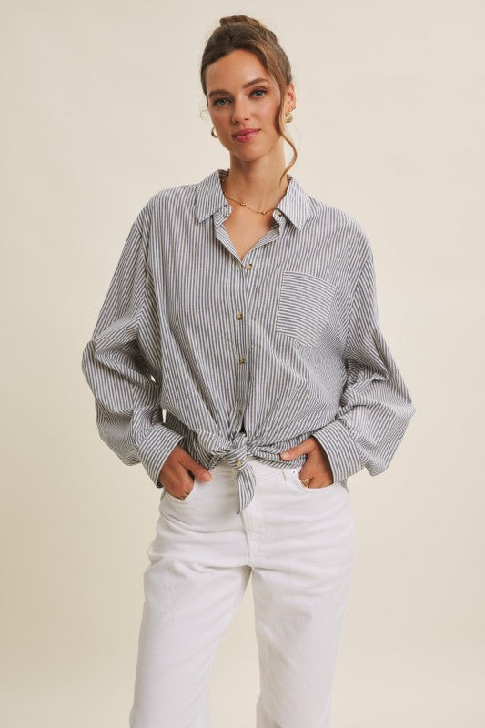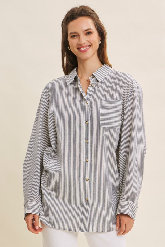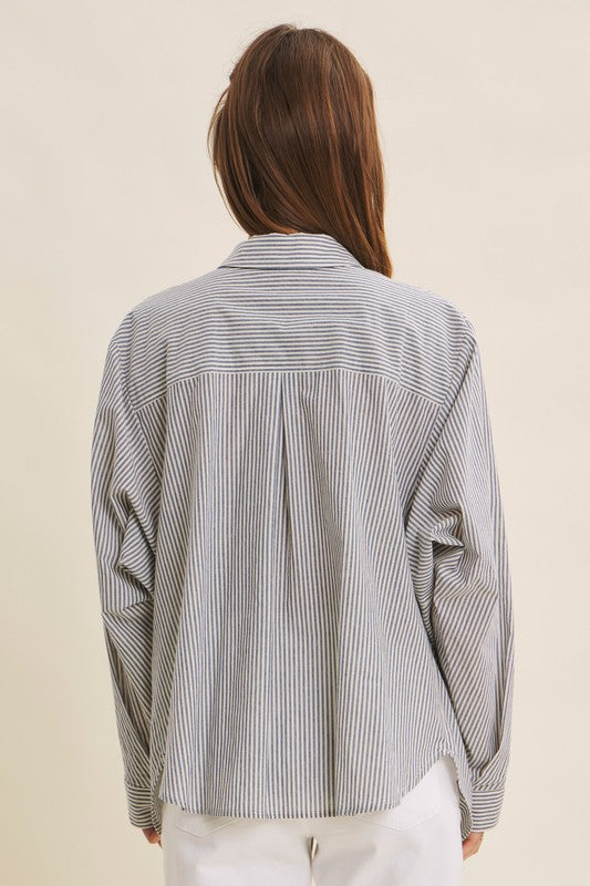 Stay effortlessly cool and comfy in this oversized pinstripe button-down shirt. Crafted from breathable cotton, it features playful drop shoulder dolman sleeves and a relaxed fit that invites movement. Charming details like button cuffs, a collared neckline, a bust pocket, and unique triangular armhole accents add quirky style. Back pleats enhance flow while the classic pinstripe pattern keeps things sharp. Perfect for layering or wearing solo, this shirt turns everyday dressing into a fun, stylish affair.
