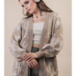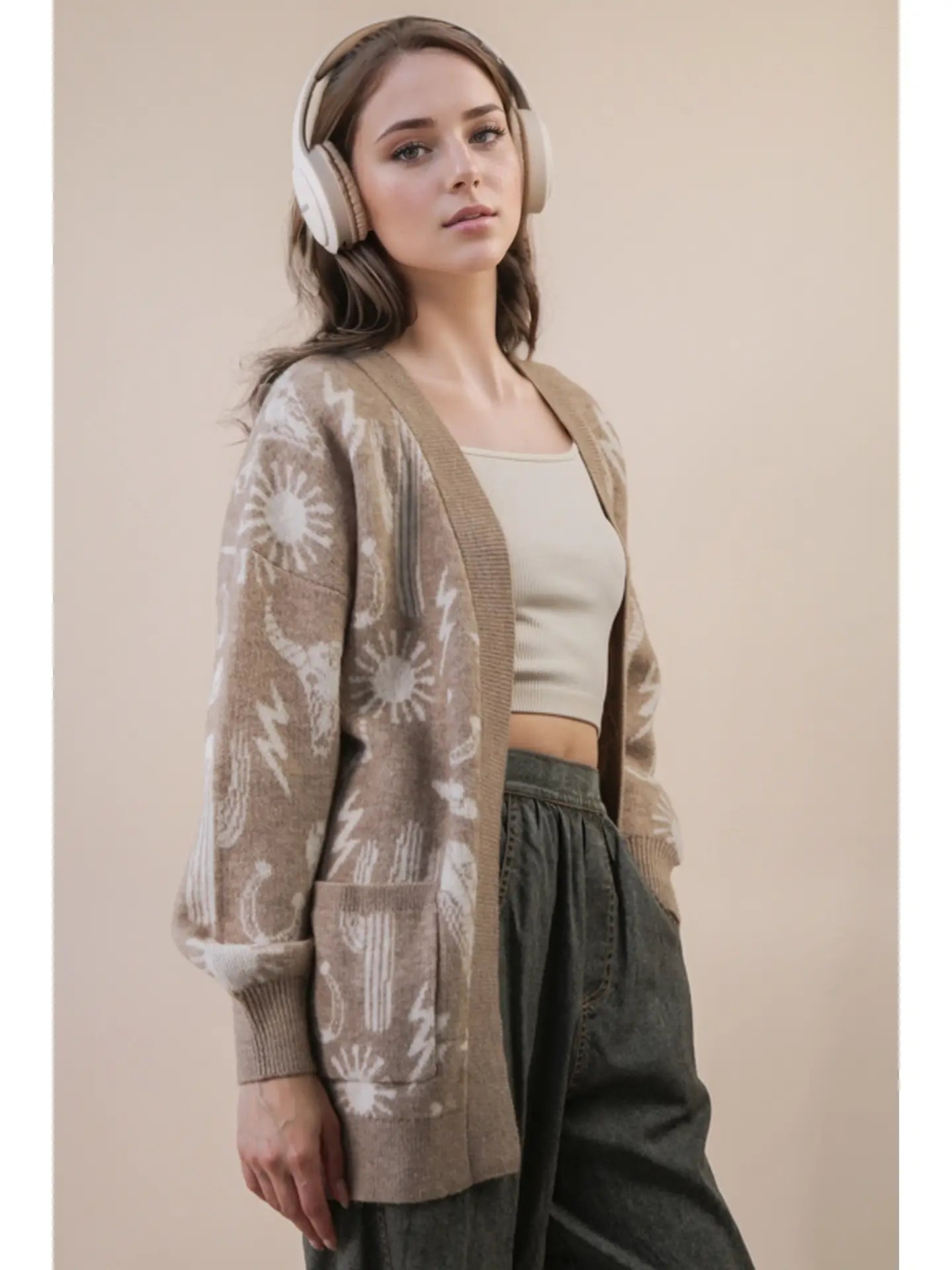 Stay cozy and cool in this Oversized Western Sweater Cardi. With a laid-back drop shoulder and long sleeves, it delivers ultimate comfort wrapped in playful style. The open front and front pockets add easygoing charm, while the tunic length offers extra coverage for all your adventures. Perfect for layering and turning heads with a dash of western flair!