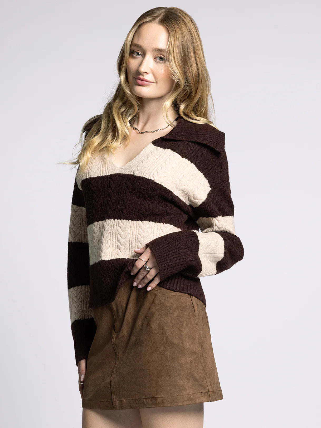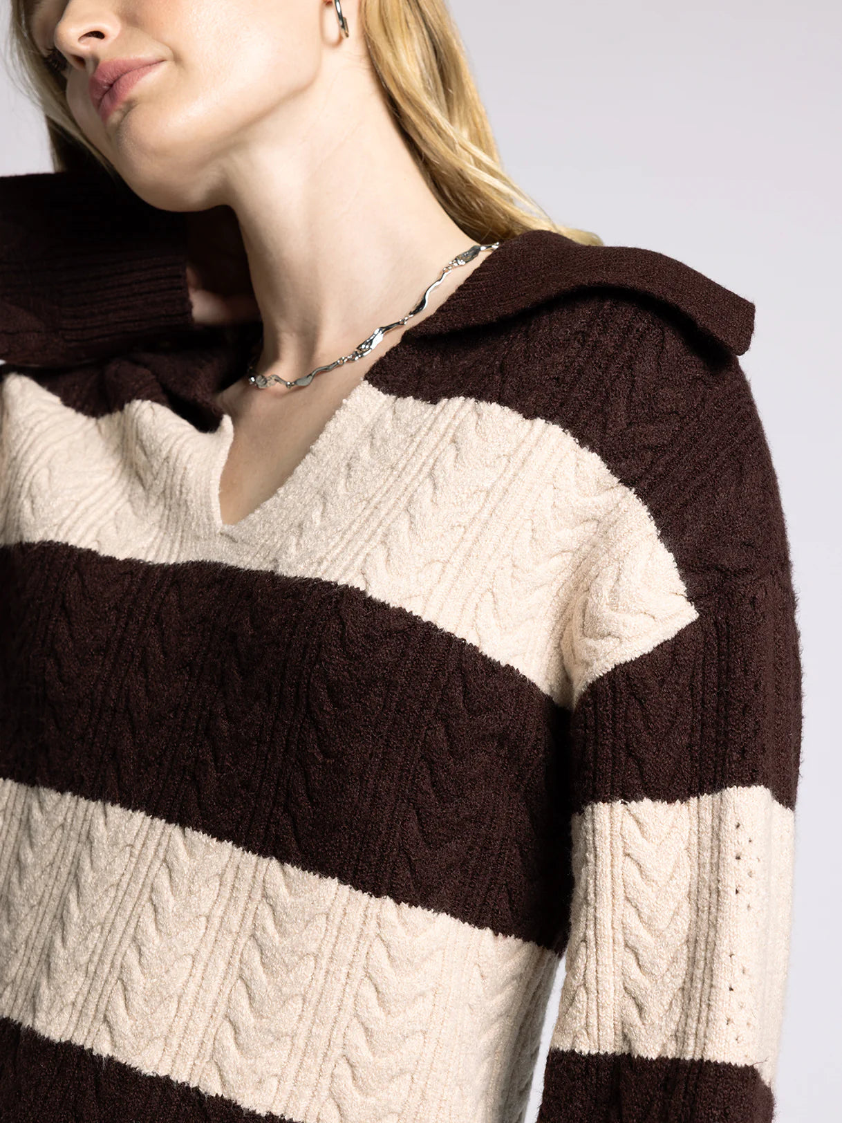 Get cozy in the Paula Sweater, featuring a wide collar and playful V neckline that adds just the right touch of flair. Its relaxed drop shoulder design drapes comfortably, perfect for those laid-back days when you want to feel snug without sacrificing style.