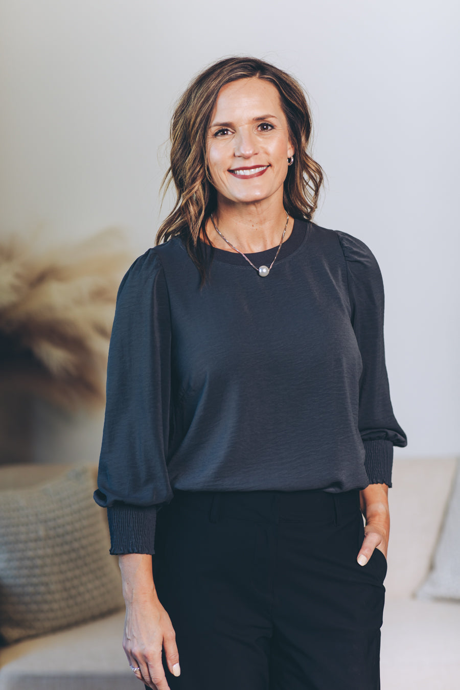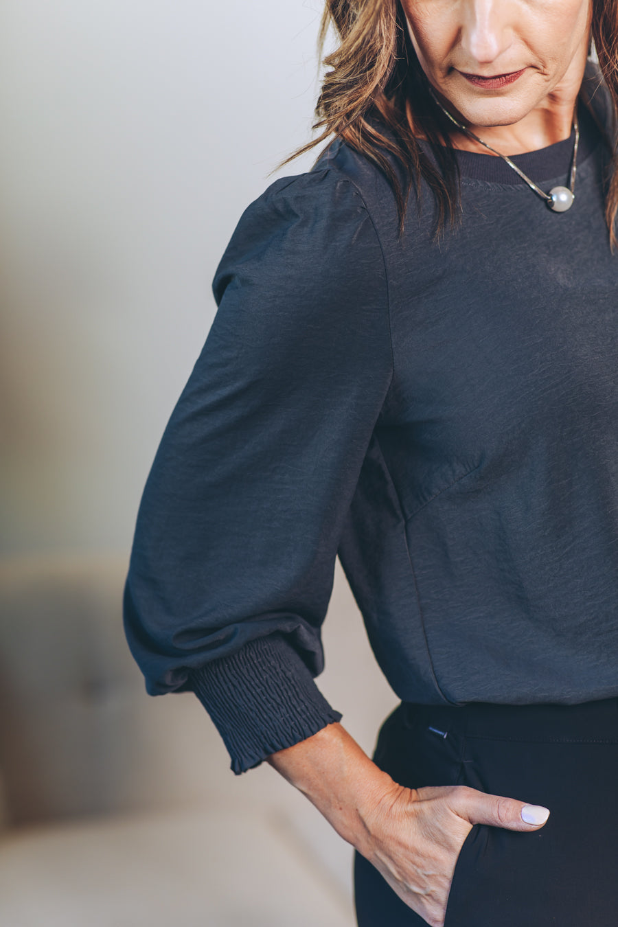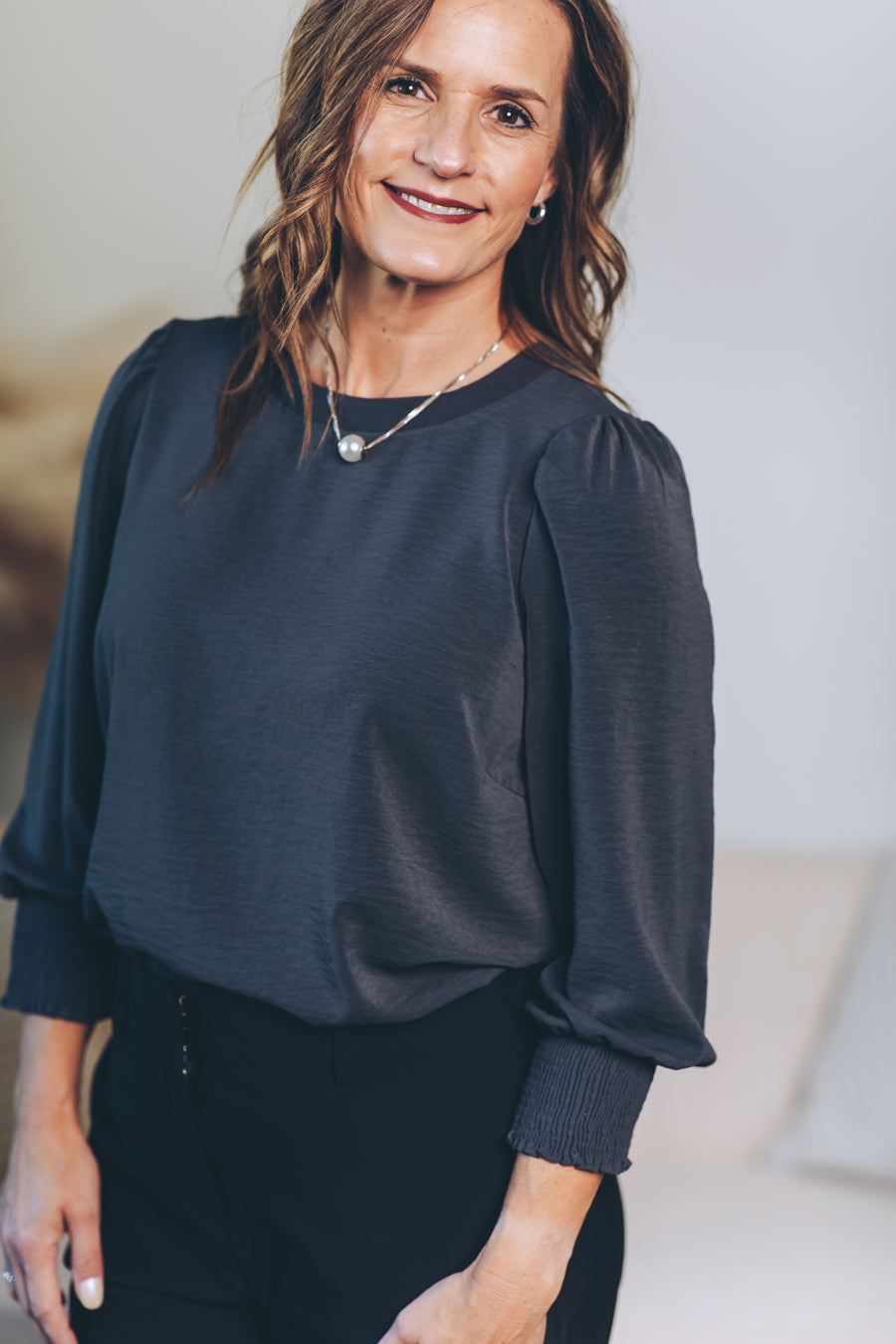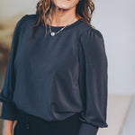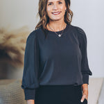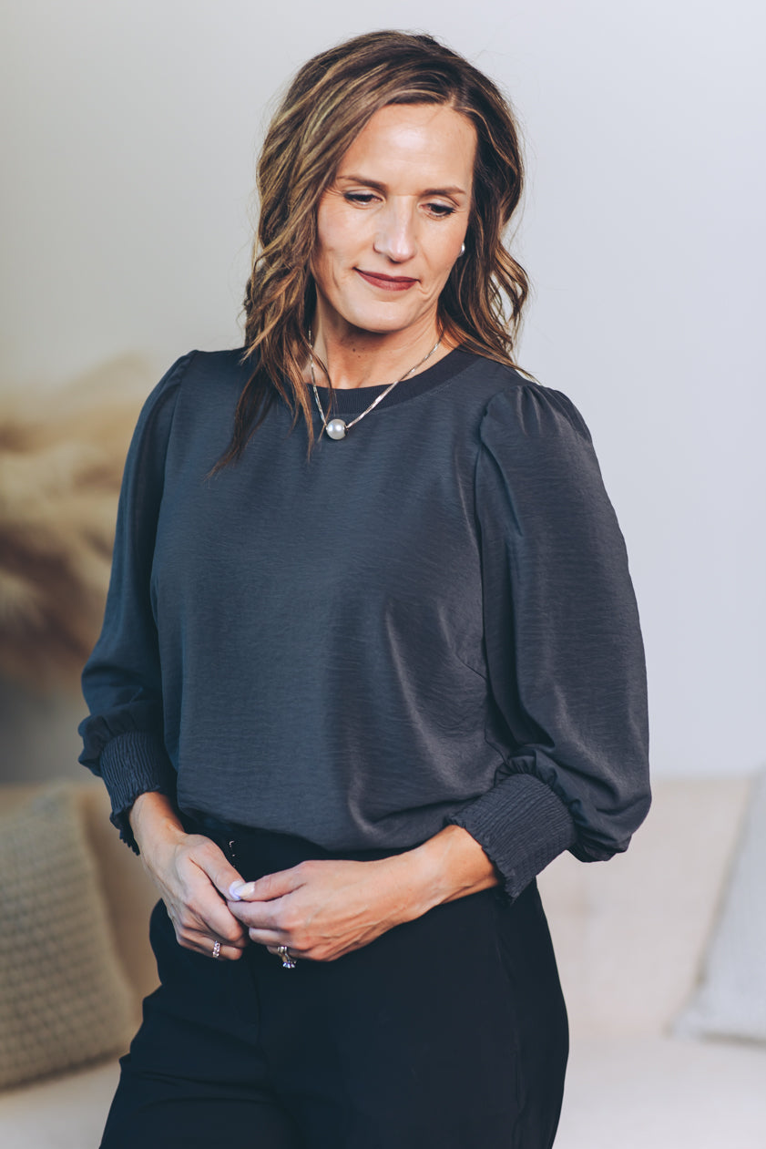 Made from washed stretch satin, the Penelope Puff Sleeve Blouse feels as soft as a whisper while shining with subtle elegance. Its 3/4-length puff sleeves add playful volume, perfectly balanced by cozy elasticized cuffs for a snug, charming fit. The contrast ribbed neckline not only modernizes your look but also keeps things durable for all-day wear. Effortlessly chic and fun, this blouse is ready to brighten up any outfit!