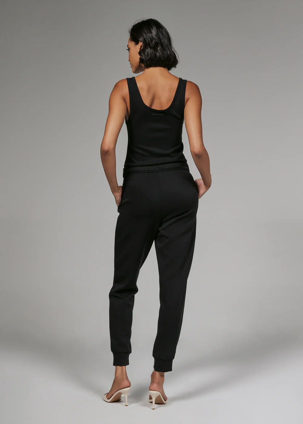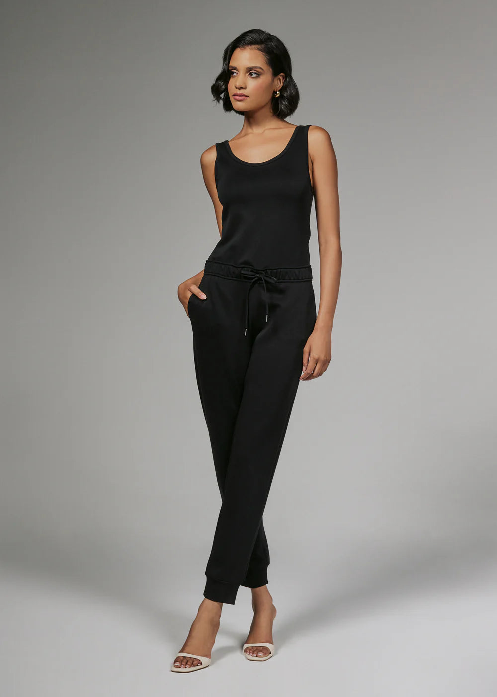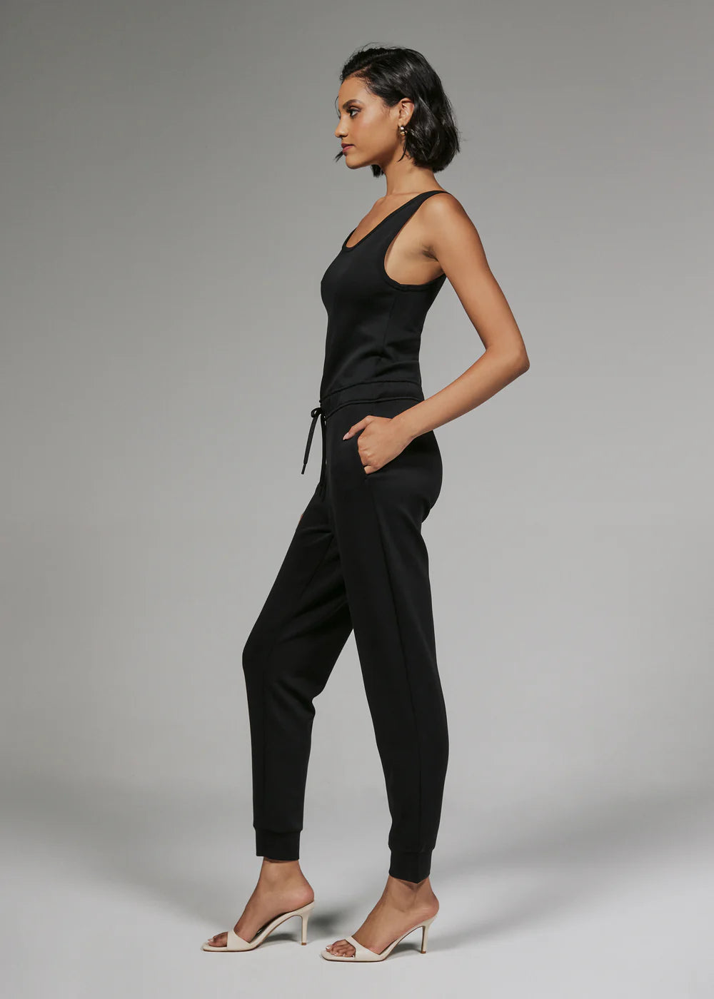 A relaxed jumpsuit with a tapered leg and jogger-style ankle cuffs. Features adjustable waistband drawstrings and side pockets for your essentials.